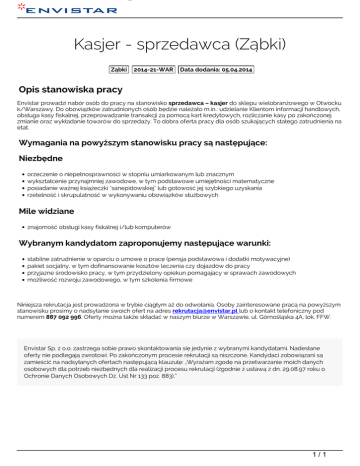 Oferta pracy Kasjer - sprzedawca (Ząbki) Ząbki 2014-21-WAR Data dodania: 05.04.2014 Opis stanowiska pracy Envistar prowadzi nabór osób do pracy na stanowisko sprzedawca – kasjer do sklepu wielobranżowego w Otwocku k/Warszawy. Do obowiązków zatrudnionych osób będzie należało m.in.: udzielanie Klientom informacji handlowych, obsługa kasy fiskalnej, przeprowadzanie transakcji za pomocą kart kredytowych, rozliczanie kasy po zakończonej zmianie oraz wykładanie towarów do sprzedaży. To dobra oferta pracy dla osób szukających stałego zatrudnienia na etat. Wymagania na powyższym stanowisku pracy są następujące: Niezbędne orzeczenie o niepełnosprawności w stopniu umiarkowanym lub znacznym wykształcenie przynajmniej zawodowe, w tym podstawowe umiejętności matematyczne posiadanie ważnej książeczki "sanepidowskiej" lub gotowość jej szybkiego uzyskania rzetelność i skrupulatność w wykonywaniu obowiązków służbowych Mile widziane znajomość obsługi kasy fiskalnej i/lub komputerów Wybranym kandydatom zaproponujemy następujące warunki: stabilne zatrudnienie w oparciu o umowę o pracę (pensja podstawowa i dodatki motywacyjne) pakiet socjalny, w tym dofinansowanie kosztów leczenia czy dojazdów do pracy przyjazne środowisko pracy, w tym przydzielony opiekun pomagający w sprawach zawodowych możliwość rozwoju zawodowego, w tym szkolenia firmowe Niniejsza rekrutacja jest prowadzona w trybie ciągłym aż do odwołania. Osoby zainteresowane pracą na powyższym stanowisku prosimy o nadsyłanie swoich ofert na adres [email protected] lub o kontakt telefoniczny pod numerem 887 092 996. Oferty można także składać w naszym biurze w Warszawie, ul. Górnośląska 4A, lok. FFW. Envistar Sp. z o.o. zastrzega sobie prawo skontaktowania się jedynie z wybranymi kandydatami. Nadesłane oferty nie podlegają zwrotowi. Po zakończonym procesie rekrutacji są niszczone. Kandydaci zobowiązani są zamieścić na nadsyłanych ofertach następującą klauzulę: „Wyrażam zgodę na przetwarzanie moich danych osobowych dla potrzeb niezbędnych dla realizacji procesu rekrutacji (zgodnie z ustawą z dn. 29.08.97 roku o Ochronie Danych Osobowych Dz. Ust Nr 133 poz. 883).” 1/1 Powered by TCPDF (www.tcpdf.org)