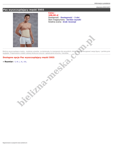 Informacje o produkcie Utworzono 08-03-2017 Pas wyszczuplający męski 5955 Cena : 108,00 zł m .p l Dostępność : Dostępność - 3 dni Stan magazynowy : bardzo wysoki Średnia ocena : brak recenzji .c o Bielizna wyszczuplająca męska , modeluje sylwetkę na doskonałą, to rozwiązanie dla wszystkich, którzy pragną skorygować swoją figurę i perfekcyjnie wyglądać. Proponowane modele ułatwią skuteczne ukrycie i spłaszczenie brzucha, i boczków. Dostępne opcje Pas wyszczuplający męski 5955 bi el iz na - m es ka » Rozmiar: S, M, L, XL, XXL. Wygenerowano w programie www.oscGold.com