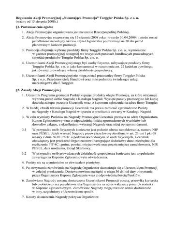 Regulamin Akcji Promocyjnej „Nieustająca Promocja” Torggler Polska Sp. z o. o. (waŜny od 15 sierpnia 2008r.) §1. Postanowienia ogólne 1. Akcja Promocyjna organizowana jest na terenie Rzeczpospolitej Polskiej. 2. Akcja Promocyjna rozpoczyna się 15 sierpnia 2008 roku i trwa do 30.04.2009r. i moŜe zostać przedłuŜona na kolejny okres o czym Organizator poinformuje na 30 dni przed planowanym końcem promocji. 3. Promocja obejmuje wybrane produkty firmy Torggler Polska Sp. z o. o., wymienione w gazetce promocyjnej dostępnej we wszystkich punktach handlowych prowadzących sprzedaŜ produktów Torggler Polska Sp. z o. o. 4. Uczestnikami Akcji Promocyjnej mogą być osoby fizyczne, nabywające produkty firmy Torggler Polska Sp. z o. o. jako konsumenci w rozumieniu art. 22 kodeksu cywilnego, jak równieŜ prowadzące własną działalność gospodarczą. 5. Uczestnikami Akcji Promocyjnej nie mogą zostać pracownicy firmy Torggler Polska Sp. z o.o., Przedstawiciele Handlowi oraz inne podmioty świadczące usługi marketingowe dla f. Torggler. §2. Zasady Akcji Promocyjnej 1. Uczestnik Programu gromadzi Punkty kupując produkty objęte Promocją, za które otrzymuje wybraną przez siebie Nagrodę z Katalogu Nagród. Wycięte punkty promocyjne lub kopię dowodu zakupu przesyła Uczestnik wraz z kuponem zgłoszenia na adres firmy Torggler. 2. W kaŜdej chwili trwania promocji Uczestnik ma prawo zamienić zgromadzone Punkty na Nagrody z Katalogu Nagród w oparciu o przelicznik zawarty w Katalogu Nagród. 3. W celu wymiany Punktów na Nagrody Promocyjne Uczestnik przesyła na adres Organizatora Kupon Zgłoszeniowy wraz z odpowiednią ilością zgromadzonych wycinków lub dowodów zakupu, z określeniem wybranej Nagrody oraz niŜej opisanymi danymi. 3.1 W przypadku osób fizycznych konieczne jest podanie adresu zameldowania, numeru NIP oraz PESEL. JeŜeli wartość Nagrody przewyŜsza kwotę określoną w art. 21 ust 1 pkt 68 ustawy z dnia 26.07.1991r. o podatku dochodowym od osób fizycznych, Uczestnik obowiązany jest przekazać Organizatorowi następujące dodatkowe dane, niezbędne dla rozliczenia PIT-8C: gmina, powiat, miejscowość oraz poczta miejsca zameldowania, NIP, PESEL, data urodzenia, Urząd Skarbowy. 3.2 W przypadku osób prowadzących działalność gospodarczą konieczne jest wypełnienie zawartego na Kuponie Zgłoszeniowym oświadczenia. 4. Punkty nie są wymienialne na ekwiwalent pienięŜny. 5. Po otrzymaniu zamówienia na Nagrodę Organizator skontaktuje się z Uczestnikiem Promocji w celu jej przekazania. Dostawa powinna nastąpić w ciągu 30 dni od daty otrzymania przez Organizatora Kuponu Zgłoszenia wraz z odpowiednią ilością Punktów. 6. Zamówione Nagrody zostaną dostarczone Uczestnikowi Promocji pocztą, przesyłką kurierską lub osobiście przez przedstawiciela Organizatora na adres wskazany przez Uczestnika w Kuponie Zgłoszeniowym. Zamówione Nagrody mogą równieŜ zostać dostarczone w inny, uzgodniony z Uczestnikiem sposób. 7. Koszty dostarczenia Nagrody pokrywa Organizator. 8. JeŜeli ilość przesłanych przez Uczestnika Punktów okaŜe się być mniejsza od liczby koniecznej dla otrzymania wybranej Nagrody zamówienie nie zostanie zrealizowane, a Organizator powiadomi Uczestnika o zaistniałej sytuacji. Uczestnik moŜe uzupełnić brakującą liczbę punktów w czasie trwania Akcji Promocyjnej. 9. W przypadku przesłania przez Uczestnika większej niŜ konieczna dla otrzymania wybranej Nagrody liczby punktów, nadmiar będzie zaliczany na poczet kolejnej Nagrody. 10. Zgłoszenia mogą być przesyłane najpóźniej w ostatnim dniu trwania Akcji Promocyjnej. O zachowaniu terminu decyduje data stempla pocztowego. 11. Wszystkie Punkty promocyjne nie przesłane celem wymiany na Nagrodę do końca trwania Akcji Promocyjnej tracą swoją waŜność wraz z jej ostatnim dniem. §3. Nagrody 1. Organizator moŜe zaproponować Uczestnikom Promocji wymianę Punktów na nagrody spoza Katalogu Nagród. 2. Katalog Nagród nie jest ofertą handlową i Organizator Promocji nie gwarantuje stałej dostępności wskazanych w nim Nagród Akcji Promocyjnej. Organizator Promocji zastrzega sobie prawo do wycofania Nagrody Promocyjnej w kaŜdej chwili z listy Nagród bez podania przyczyny. 3. Organizator zastrzega sobie prawo zastąpienia Nagrody Programu zamieszczonej w Katalogu Nagród inną o równorzędnej wartości i podobnych walorach uŜytkowych. §4. Podatek dochodowy. 1. Nagrody otrzymane przez Uczestnika Promocji stanowią nagrody związane ze sprzedaŜą premiową w rozumieniu art. 30 ust.1 pkt 2 ustawy z dnia 26.07.1991r. o podatku dochodowym od osób fizycznych (tj w Dz. U. z 2000r. Nr 14, poz. 176 z późn. zm.) zwaną dalej "ustawą o pdof". 2. W przypadku, gdy wartość otrzymanych przez Uczestnika Nagród będących towarami nie przekracza jednorazowo kwoty określonej w art. 21 ust 1 pkt 68 ustawy o pdof dochód z tego tytułu nie podlega opodatkowaniu podatkiem dochodowym od osób fizycznych (na podstawie art. 21. ust 1 pkt 68 ustawy o pdof). 3. Zwolnienie o którym mowa w ust. 2 niniejszego paragrafu nie dotyczy Nagród otrzymanych przez Uczestnika w związku z prowadzoną przez niego działalnością gospodarczą. W takim przypadku Nagrody stanowią przychód z działalności gospodarczej. 4. W przypadku gdy Uczestnik wybierze Nagrodę będącą towarem, którego wartość przewyŜsza kwotę określoną w ust. 2 niniejszego paragrafu, obowiązany jest przekazać Organizatorowi wymienione w §2 dane. § 5. Reklamacje i gwarancje 1. W przypadku dostarczenia nagrody pocztą bądź przez firmę kurierską, Uczestnik obowiązany jest przy odbiorze przesyłki do sprawdzenia jej zawartości i zgłoszenia ewentualnych uszkodzeń. Odpowiedzialność za uszkodzenia przesyłki ponosi poczta bądź firma kurierska. 2. Uczestnik moŜe złoŜyć do organizatora reklamację dotyczącą niezgodności otrzymanej Nagrody z Nagrodą zamówioną, w terminie 14 dni od ode