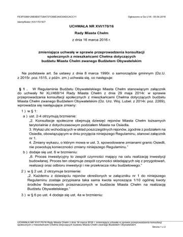 FE3F5389129E8E67729A727C69E3A5C64DCACC11 Ogłoszono w Dz.U.W.: 05.04.2016 identyfikator XVI/170/16/7 UCHWAŁA NR XVI/170/16 Rady Miasta Chełm z dnia 16 marca 2016 r. zmieniająca uchwałę w sprawie przeprowadzenia konsultacji społecznych z mieszkańcami Chełma dotyczących budżetu Miasta Chełm zwanego Budżetem Obywatelskim Na podstawie art. 5a ustawy z dnia 8 marca 1990r. o samorządzie gminnym (Dz.U. z 2015r. poz.1515, z późn. zm.) uchwala się, co następuje: § 1 . W Regulaminie Budżetu Obywatelskiego Miasta Chełm stanowiącym załącznik do uchwały Nr XLI/468/14 Rady Miasta Chełm z dnia 29 maja 2014r. w sprawie przeprowadzania konsultacji społecznych z mieszkańcami Chełma dotyczących budżetu Miasta Chełm zwanego Budżetem Obywatelskim (Dz. Urz. Woj. Lubel. z 2014r. poz. 2269), wprowadza się następujące zmiany: 1 ) w § 1: a ) ust. 2-4 otrzymują brzmienie: „2. Konsultacje społeczne obejmują dziesięć rejonów Miasta Chełm tożsamych terytorialnie z dotychczasowym podziałem Miasta na Osiedla. 3. Wykaz ulic wchodzących w skład poszczególnych rejonów, zgodnie z podziałem na Osiedla, obowiązującym w dniu przyjęcia niniejszego Regulaminu, stanowi załącznik nr 1. 4. Zmiany wykazu, o którym mowa w ust. 3, spowodowane zmianami granic Osiedli, nie powodują konieczności zmiany niniejszego Regulaminu.” b ) dodaje się ust. 6 w brzmieniu: „6. Proces inwestycyjny to zespół czynności mający na celu realizację inwestycji budowlanej. Proces ten obejmuje zespół czynności składających się z przygotowań, realizacji oraz odbioru inwestycji i nie przekracza roku budżetowego.” 2 ) w § 2 ust. 2 otrzymuje brzmienie: „2. Każdemu z dziesięciu rejonów określonych w załączniku nr 1 do niniejszego Regulaminu zostaje przypisana taka sama kwota wynosząca 1/10 ogólnej kwoty środków finansowych przeznaczonych w budżecie Miasta Chełm na realizację Budżetu Obywatelskiego.” 3 ) w § 6 po ust. 4 dodaje się ust. 4a w brzmieniu: _________________________________________________________________________________________________________________________ UCHWAŁA NR XVI/170/16 Rady Miasta Chełm z dnia 16 marca 2016 r. zmieniająca uchwałę w sprawie przeprowadzenia konsultacji społecznych z mieszkańcami Chełma dotyczących budżetu Miasta Chełm zwanego Budżetem Obywatelskim Strona 1 z 2 FE3F5389129E8E67729A727C69E3A5C64DCACC11 Ogłoszono w Dz.U.W.: 05.04.2016 „4a. W przypadku stwierdzenia przez Zespół błędnych nazw ulic, placów, terenów oraz oczywistych błędów językowych w treści nazw zgłoszonych zadań, Zespół jest uprawniony do samodzielnego dokonania poprawek, łączenia tych samych zadań złożonych przez różnych wnioskodawców oraz przyporządkowania zadania do jednego rejonu, gdy realizacja zadania ma obejmować więcej niż teren jednego rejonu - ust. 4. nie stosuje się.” 4 ) w § 7 ust. 3 otrzymuje brzmienie: „3. Na kolejnym ogólnym spotkaniu z mieszkańcami przedstawiony zostanie wykaz wszystkich zadań, zaopiniowanych pozytywnie i negatywnie wraz z uzasadnieniem oraz ostateczna lista zadań dla każdego rejonu, która poddana zostanie pod głosowanie mieszkańców, ponadto omówione zostaną procedury głosowania i wyboru zadań do realizacji w ramach Budżetu Obywatelskiego.” 5 ) załączniki do Regulaminu: nr 1 „Wykaz ulic wchodzących w skład rejonów, zgodnie z podziałem na Osiedla” i nr 2 „Formularz zgłoszenia zadania” otrzymują brzmienie jak w załącznikach nr 1 i nr 2 do niniejszej uchwały. § 2 . Wykonanie uchwały powierza się Prezydentowi Miasta Chełm. § 3 . Uchwała wchodzi w życie po upływie 14 dni od jej ogłoszenia w Dzienniku Urzędowym Województwa Lubelskiego. Przewodniczący Rady Miasta Chełm Zygmunt Gardziński _________________________________________________________________________________________________________________________ UCHWAŁA NR XVI/170/16 Rady Miasta Chełm z dnia 16 marca 2016 r. zmieniająca uchwałę w sprawie przeprowadzenia konsultacji społecznych z mieszkańcami Chełma dotyczących budżetu Miasta Chełm zwanego Budżetem Obywatelskim Strona 2 z 2