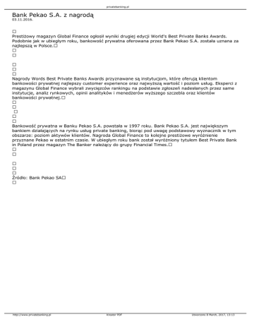 privatebanking.pl Bank Pekao S.A. z nagrodą 03.11.2016. Prestiżowy magazyn Global Finance ogłosił wyniki drugiej edycji World's Best Private Banks Awards. Podobnie jak w ubiegłym roku, bankowość prywatna oferowana przez Bank Pekao S.A. została uznana za najlepszą w Polsce. Nagrody Words Best Private Banks Awards przyznawane są instytucjom, które oferują klientom bankowości prywatnej najlepszy customer experience oraz najwyższą wartość i poziom usług. Eksperci z magazynu Global Finance wybrali zwycięzców rankingu na podstawie zgłoszeń nadesłanych przez same instytucje, analiz rynkowych, opinii analityków i menedżerów wyższego szczebla oraz klientów bankowości prywatnej. Bankowość prywatna w Banku Pekao S.A. powstała w 1997 roku. Bank Pekao S.A. jest największym bankiem działających na rynku usług private banking, biorąc pod uwagę podstawowy wyznacznik w tym obszarze: poziom aktywów klientów. Nagroda Global Finance to kolejne prestiżowe wyróżnienie przyznane Pekao w ostatnim czasie. W ubiegłym roku bank został wyróżniony tytułem Best Private Bank in Poland przez magazyn The Banker należący do grupy Financial Times. Źródło: Bank Pekao SA http://www.privatebanking.pl Kreator PDF Utworzono 8 March, 2017, 13:13