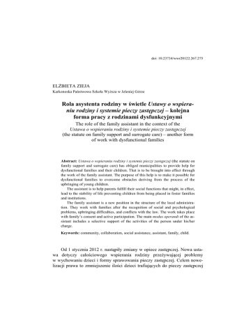 doi: 10.23734/wwr20122.267.275 ELŻBIETA ZIEJA Karkonoska Państwowa Szkoła Wyższa w Jeleniej Górze Rola asystenta rodziny w świetle Ustawy o wspieraniu rodziny i systemie pieczy zastępczej – kolejna forma pracy z rodzinami dysfunkcyjnymi The role of the family assistant in the context of the Ustawa o wspieraniu rodziny i systemie pieczy zastępczej (the statute on family support and surrogate care) – another form of work with dysfunctional families Abstract: Ustawa o wspieraniu rodziny i systemie pieczy zastępczej (the statute on family support and surrogate care) has obliged municipalities to provide help for dysfunctional families and their children. That is to be brought into effect through the work of the family assistant. The purpose of this help is to make it possible for dysfunctional families to overcome obstacles deriving from the process of the upbringing of young children. The assistant is to help parents fulfill their social functions that might, in effect, lead to the stability of life preventing children from being placed in foster families and institutions. The family assistant is a new position in the structure of the local administration. They work with families after the recognition of social and psychological problems, upbringing difficulties, and conflicts with the law. The work takes place with family’s consent and active participation. The main modus operandi of the assistant includes a selective support of the activities of the person under his/her charge. Keywords: community, collaboration, social assistance, assistant, family, child. Od 1 stycznia 2012 r. nastąpiły zmiany w opiece zastępczej. Nowa ustawa dotyczy całościowego wspierania rodziny przeżywającej problemy w wychowaniu dzieci i formy sprawowania pieczy zastępczej. Celem nowelizacji prawa to zmniejszenie ilości dzieci trafiających do pieczy zastępczej 268 Elżbieta Zieja bądź rodzinnych domów dziecka. Ustawa dalej wskazuje, że w 2020 roku wszystkie domy dziecka (placówki socjalizacyjne) zostaną zlikwidowane. Co zatem z placówkami, które szybko zrealizowały programy naprawcze, aby mogły funkcjonować jako placówki wielofunkcyjne? Ta forma sprawowania opieki szczególnie dla powiatów była bardzo wygodna, ponieważ w jednym budynku były łączone zadania placówki interwencyjnej, socjalizacyjnej, wsparcia czy grup usamodzielnienia. W nowej ustawie pominięto ten typ placówek opiekuńczo-wychowawczych, które do tej pory postrzegane były jako potrzebna forma opieki nad dzieckiem, działająca w strukturach samorządowych. A s y s t e n t r o d z i n y j e s t n o w y m s t a n o w i s k i e m w s t r u k t u r z e s a m o r z ą d u . Jego zadaniem jest niezależnie od pracowników socjalnych zajmowanie się wyłącznie pomocą i pracą z rodzinami. Rolą asystenta rodzinnego nie będzie, bowiem dublowanie pracy pracownika socjalnego, którego zadanie polega między innymi na systematycznej penetracji środowisk zagrożonych wykluczeniem i udzielanie im odpowiedniego wsparcia. Asystent rodzinny będzie kierowany do pracy tylko z tymi rodzinami, w których sytuacja dziecka małoletniego wymaga wsparcia zewnętrznego. Potrzeba jego zatrudnienia ustanie wraz z osiągnięciem przez rodzinę umiejętności samodzielnego, prawidłowego wypełniania funkcji opiekuńczo-wychowawczych. Rola asystenta rodzinnego w gminie według ustawy ma ważne znaczenie, chociaż nikt nie pyta same gminy, czy są przygotowane na te nowe rozwiązania, bo to się przecież wiąże z kosztami zatrudnienia nowych samorządowych pracowników. Wprowadzenie asystenta rodzinnego do bezpośredniej pracy z rodziną jest w nowej ustawie obecnie koniecznością. Asystent rodzinny ma w założeniu, tak jak wspomniałam, pełnić odmienną funkcję od pracownika socjalnego. Przede wszystkim jego elastyczny, nienormowany czas pracy dostosowany będzie do rytmu życia rodziny i jej realnych potrzeb Mając na uwadze zakres przypisanych asystentowi rodzinnemu zadań, a także sposób ich realizacji, proponuje się, aby gminy – tam gdzie to możliwe – zlecały wykonanie tego zadania odpowiednio przygotowanym, działającym na ich terenie organizacjom pozarządowym. Zatrudnienie asystenta rodzinnego bezpośrednio przez gminę (czy Ośrodek Pomocy Społecznej) może mieć miejsce tylko wówczas, gdy czas jego pracy będzie elastyczny, zapewniający dużą dyspozycyjność, i pracownik ten rozliczany będzie z realizacji konkretnego zadania. Na wniosek asystenta rodziny, kierownik Ośrodka Pomocy Społecznej powołuje zespół interdyscyplinarny, działający na rzecz utrzymania integralności rodziny oraz koordynacji instytucji i służb zobowiązanych do wspiera- Rola asystenta rodziny w świetle Ustawy o wspieraniu rodziny... 269 nia rodziny. Zespół wraz z asystentem diagnozuje trudności występujące w rodzinie oraz dokonuje okresowej oceny sytuacji rodziny. Ustawa o wspieraniu rodziny i systemie pieczy zastępczej nałożyła na gminy obowiązek udzielania pomocy rodzinom dysfunkcyjnym z dziećmi. Pomoc owa realizowana będzie poprzez działania asystenta rodzinnego, który wesprze rodziny w przezwyciężaniu trudności związanych z opieką i wychowaniem małoletnich dzieci1. Asystent ma ułatwić rodzicom wypełnianie ról społecznych, aby doprowadzić do osiągnięcia podstawowej stabilizacji życiowej i nie dopuścić do umieszczania dzieci poza rodziną w placówkach lub rodzinach zastępczych. Jeśli dzieci znajdują się pod pieczę zastępczą, rolą asystenta będą działania na rzecz ich jak najszybszego powrotu do rodziny. Poza pracą z rodzinami, w których problemy wychowawcze doprowadziły do oddzielenia dzieci od rodziców lub gdzie istnieje takie realne niebezpieczeństwo – asystent rodziny może współpracować również z rodzinami przeżywającymi okresowe trudności – zgodnie z zasadą „lepiej zapobiegać niż leczyć”. Współpraca asystenta z rodziną odbywa się zawsze 