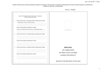 Zał. nr 3b do ZW 57/2014 WZÓR WYPEŁNIANIA DODATKOWEGO ODPISU DYPLOMU UKOŃCZENIA STUDIÓW PIERWSZEGO STOPNIA PROWADZONYCH WSPÓLNIE – WERSJA W JĘZYKU ANGIELSKIM strona 1, okładka Space for information about the universities or institutions jointly conducting the studies 1. Name of university or institution jointly conducting the studies Technische Universität Dresden …………………………………………………………………… …………………………………………………………………… …………………………………………………………………… Name of unit jointly conducting the studies Faculty of Mechanical Science and Engineering …………………………………………………………………… …………………………………………………………………… …………………………………………………………………… 2. godło państwowe Name of university or institution jointly conducting the studies …………………………………………………………………… …………………………………………………………………… …………………………………………………………………… Name of unit jointly conducting the studies …………………………………………………………………… …………………………………………………………………… …………………………………………………………………… 3. Name of university or institution jointly conducting the studies …………………………………………………………………… …………………………………………………………………… …………………………………………………………………… Name of unit jointly conducting the studies …………………………………………………………………… …………………………………………………………………… …………………………………………………………………….. DIPLOMA OF COMPLETION OF FIRST-LEVEL STUDIES CONDUCTED JOINTLY ISSUED IN THE REPUBLIC OF POLAND 1 Zał. nr 3b do ZW 57/2014 WZÓR WYPEŁNIANIA DODATKOWEGO ODPISU DYPLOMU UKOŃCZENIA STUDIÓW PIERWSZEGO STOPNIA PROWADZONYCH WSPÓLNIE – WERSJA W JĘZYKU ANGIELSKIM strona 2, lewa wewnętrzna (wyklejka) strona 3, prawa of Mechanical Engineering Faculty ……………………………………………………………………….. DIPLOMA OF COMPLETION OF FIRST-LEVEL STUDIES CONDUCTED JOINTLY a photo 45x65 mm of full-time studies / of part-time studies in the form ........................................................................... in general academic profile of study and gaining qualifications of first technological sciences level studies in the area of………………………..…………………………… Management and Manufacturing Engineering in the main field of studies............................................................. mp. specialization in the specialization ….without ................................................................. …………………………………………………………… bardzo dobry with the grade ............................................................................ Paweł Nowak Mr/Mrs................................................................................. (first name/names and surname) March 18, 1992 born on................................................................................. Wrocław in........................................................................................ …………..................... (diploma holders signature) Diploma No ................................................................. and gaining on January 28, 2014 .......................................................................... inżynier the professional degree.................................................................. Dean ..................................... (name stamp and signature) Wrocław Rector mp. mp ..................................... (name stamp and signature) Date January 30, 2014 2
