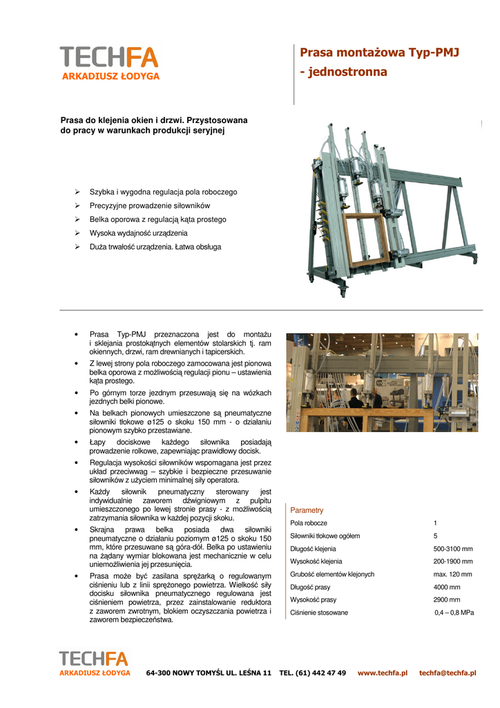 Prasa montażowa Typ-PMJ ARKADIUSZ ŁODYGA - jednostronna Prasa do klejenia okien i drzwi. Przystosowana do pracy w warunkach produkcji seryjnej Szybka i wygodna regulacja pola roboczego Precyzyjne prowadzenie siłowników Belka oporowa z regulacją kąta prostego Wysoka wydajność urządzenia Duża trwałość urządzenia. Łatwa obsługa • Prasa Typ-PMJ przeznaczona jest do montażu i sklejania prostokątnych elementów stolarskich tj. ram okiennych, drzwi, ram drewnianych i tapicerskich. • Z lewej strony pola roboczego zamocowana jest pionowa belka oporowa z możliwością regulacji pionu – ustawienia kąta prostego. • Po górnym torze jezdnym przesuwają się na wózkach jezdnych belki pionowe. • Na belkach pionowych umieszczone są pneumatyczne siłowniki tłokowe ø125 o skoku 150 mm - o działaniu pionowym szybko przestawiane. • Łapy dociskowe każdego siłownika posiadają prowadzenie rolkowe, zapewniając prawidłowy docisk. • Regulacja wysokości siłowników wspomagana jest przez układ przeciwwag – szybkie i bezpieczne przesuwanie siłowników z użyciem minimalnej siły operatora. • Każdy siłownik pneumatyczny sterowany jest indywidualnie zaworem dźwigniowym z pulpitu umieszczonego po lewej stronie prasy - z możliwością zatrzymania siłownika w każdej pozycji skoku. • • Skrajna prawa belka posiada dwa siłowniki pneumatyczne o działaniu poziomym ø125 o skoku 150 mm, które przesuwane są góra-dół. Belka po ustawieniu na żądany wymiar blokowana jest mechanicznie w celu uniemożliwienia jej przesunięcia. Prasa może być zasilana sprężarką o regulowanym ciśnieniu lub z linii sprężonego powietrza. Wielkość siły docisku siłownika pneumatycznego regulowana jest ciśnieniem powietrza, przez zainstalowanie reduktora z zaworem zwrotnym, blokiem oczyszczania powietrza i zaworem bezpieczeństwa. ARKADIUSZ ŁODYGA 64-300 NOWY TOMYŚL UL. LEŚNA 11 Parametry Pola robocze 1 Siłowniki tłokowe ogółem 5 Długość klejenia 500-3100 mm Wysokość klejenia 200-1900 mm Grubość elementów klejonych max. 120 mm Długość prasy 4000 mm Wysokość prasy 2900 mm Ciśnienie stosowane 0,4 – 0,8 MPa TEL. (61) 442 47 49 www.techfa.pl [email protected]
