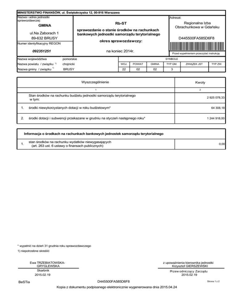 MINISTERSTWO FINANSÓW, ul. Świętokrzyska 12, 00-916 Warszawa Nazwa i adres jednostki sprawozdawczej: Regionalna Izba Obrachunkowa w Gdańsku Rb-ST GMINA sprawozdanie o stanie środków na rachunkach bankowych jednostki samorządu terytorialnego ul.Na Zaborach 1 89-632 BRUSY na koniec 2014r. 092351251 Nazwa województwa Nazwa powiatu / związku 1) 1) D445500FA585D6F8 okres sprawozdawczy: Numer identyfikacyjny REGON Nazwa gminy / związku Adresat: pomorskie chojnicki WOJ. BRUSY 22 Przed wypełnieniem przeczytać instrukcję POWIAT 02 SYMBOLE GMINA TYP GM. 02 3 ZWIĄZEK JST Wyszczególnienie Kwoty 1 2 Stan środków na rachunku budżetu jednostki samorządu terytorialnego w tym: 1. środki niewykorzystanych dotacji w roku budżetowym* 2. środki dotacji i subwencji przekazane w grudniu na styczeń następnego roku* TYP ZW. 2 925 078,33 64 308,18 1 244 918,00 Informacja o środkach na rachunkach bankowych jednostek samorządu terytorialnego 1. stan środków na rachunku wydatków niewygasających (art. 263 ust. 6 ustawy o finansach publicznych) 0,00 * wypełnić na dzień 31 grudnia roku sprawozdawczego 1) niepotrzebne skreślić BeSTia Ewa TRZEBIATOWSKAGRYGLEWSKA Skarbnik 2015.02.19 D445500FA585D6F8 z upoważnienia kierownika jednostki Krzysztof GIERSZEWSKI Przew odniczący Zarządu 2015.02.19 Kopia z dokumentu podpisanego elektronicznie wygenerowana dnia 2015.04.24 Strona 1 z 2 Wyjaśnienia do sprawozdania Rb-ST Ewa TRZEBIATOWSKAGRYGLEWSKA Skarbnik 2015.02.19 BeSTia z upoważnienia kierownika jednostki Krzysztof GIERSZEWSKI Przew odniczący Zarządu D445500FA585D6F8 Kopia z dokumentu podpisanego elektronicznie wygenerowana dnia 2015.04.24 2015.02.19 Strona 2 z 2