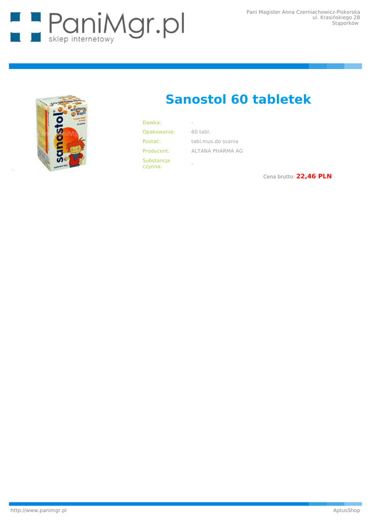 Pani Magister Anna Czerniachowicz-Piskorska ul. Krasińskiego 2B Stąporków Sanostol 60 tabletek Dawka: - Opakowanie: 60 tabl. Postać: tabl.mus.do ssania Producent: ALTANA PHARMA AG Substancja czynna: Cena brutto: http://www.panimgr.pl 22,46 PLN AptusShop