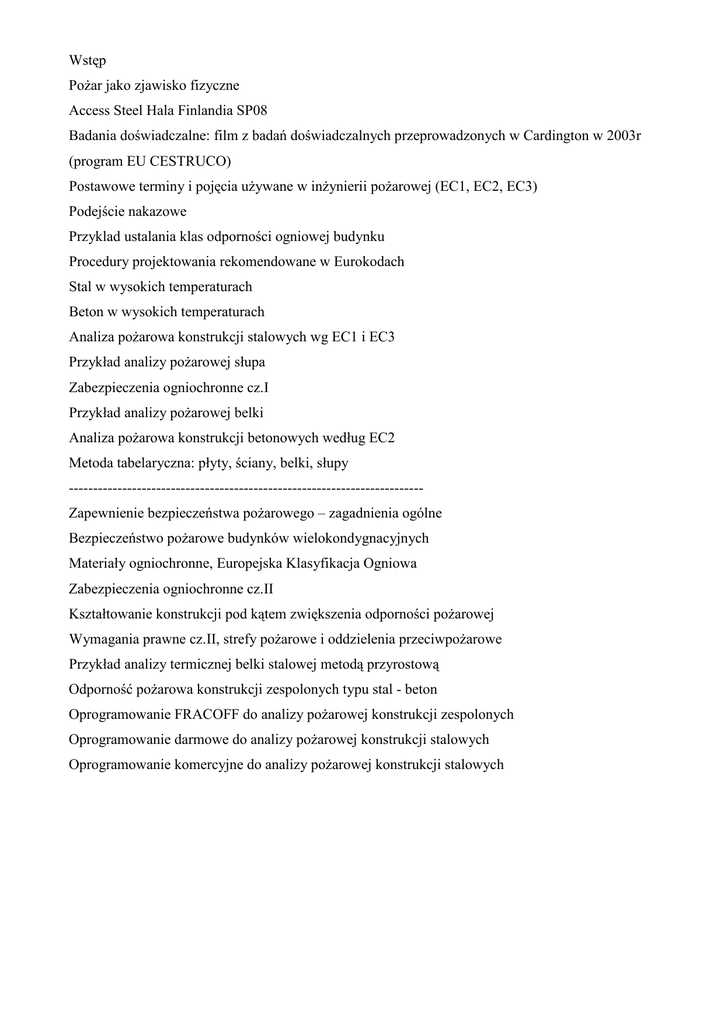 Wstęp PoŜar jako zjawisko fizyczne Access Steel Hala Finlandia SP08 Badania doświadczalne: film z badań doświadczalnych przeprowadzonych w Cardington w 2003r (program EU CESTRUCO) Postawowe terminy i pojęcia uŜywane w inŜynierii poŜarowej (EC1, EC2, EC3) Podejście nakazowe Przyklad ustalania klas odporności ogniowej budynku Procedury projektowania rekomendowane w Eurokodach Stal w wysokich temperaturach Beton w wysokich temperaturach Analiza poŜarowa konstrukcji stalowych wg EC1 i EC3 Przykład analizy poŜarowej słupa Zabezpieczenia ogniochronne cz.I Przykład analizy poŜarowej belki Analiza poŜarowa konstrukcji betonowych według EC2 Metoda tabelaryczna: płyty, ściany, belki, słupy ------------------------------------------------------------------------Zapewnienie bezpieczeństwa poŜarowego – zagadnienia ogólne Bezpieczeństwo poŜarowe budynków wielokondygnacyjnych Materiały ogniochronne, Europejska Klasyfikacja Ogniowa Zabezpieczenia ogniochronne cz.II Kształtowanie konstrukcji pod kątem zwiększenia odporności poŜarowej Wymagania prawne cz.II, strefy poŜarowe i oddzielenia przeciwpoŜarowe Przykład analizy termicznej belki stalowej metodą przyrostową Odporność poŜarowa konstrukcji zespolonych typu stal - beton Oprogramowanie FRACOFF do analizy poŜarowej konstrukcji zespolonych Oprogramowanie darmowe do analizy poŜarowej konstrukcji stalowych Oprogramowanie komercyjne do analizy poŜarowej konstrukcji stalowych