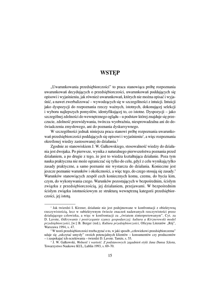 WSTÊP „Uwarunkowania przedsiêbiorczoœci” to praca stanowi¹ca próbê rozpoznania uwarunkowañ decyduj¹cych o przedsiêbiorczoœci, uwarunkowañ poddaj¹cych siê opisowi i wyjaœnieniu, jak równie¿ uwarunkowañ, których nie mo¿na opisaæ i wyjaœniæ, a nawet zwerbalizowaæ – wywodz¹cych siê w szczególnoœci z intuicji. Intuicji jako dyspozycji do rozpoznania rzeczy wa¿nych, istotnych, dokonuj¹cej selekcji i wyboru najlepszych pomys³ów, identyfikuj¹cej to, co istotne. Dyspozycji – jako szczególnej zdolnoœci do wewnêtrznego ogl¹du – u podstaw której znajduje siê przeczucie, zdolnoœæ przewidywania, twórcza wyobraŸnia, niesprowadzalna ani do doœwiadczenia zmys³owego, ani do poznania dyskursywnego. W szczególnoœci jednak niniejsza praca stanowi próbê rozpoznania uwarunkowañ przedsiêbiorczoœci poddaj¹cych siê opisowi i wyjaœnieniu1, a wiêc rozpoznania okreœlonej wiedzy zastosowanej do dzia³ania.2 Zgodnie ze stanowiskiem J. W. Ga³kowskiego, stosowalnoœæ wiedzy do dzia³ania jest dwojaka. Po pierwsze, wynika z naturalnego pierwszeñstwa poznania przed dzia³aniem, a po drugie z tego, ¿e jest to wiedza kszta³tuj¹ca dzia³anie. Poza tym nauka praktyczna nie mo¿e ograniczaæ siê tylko do celu, gdy¿ z celu wynikaj¹ tylko zasady praktyczne, a samo poznanie nie wystarcza do dzia³ania. Konieczne jest jeszcze poznanie warunków i okolicznoœci, a wiêc tego, do czego stosuj¹ siê zasady.3 Warunków stanowi¹cych zespó³ cech koniecznych komu, czemu, do bycia kim, czym, do wykonywania czego. Warunków pozostaj¹cych w bezpoœrednim, œcis³ym zwi¹zku z przedsiêbiorczoœci¹, jej dzia³aniem, przejawami. W bezpoœrednim œcis³ym zwi¹zku istotnoœciowym ze struktur¹ wewnêtrzn¹ kategorii przedsiêbiorczoœci, jej istot¹. Jak twierdzi I. Kirzner, dzia³anie nie jest podejmowane w konfrontacji z obiektywn¹ rzeczywistoœci¹, lecz w subiektywnym œwiecie znaczeñ nadawanych rzeczywistoœci przez dzia³aj¹cego cz³owieka, a wiêc w konfrontacji za „œwiatem zinterpretowanym”. Cyt. za D. Lavoie, Odkrywanie i postrzeganie szansy gospodarczej: kultura a Kirznerowski model przedsiêbiorczoœci, [w:] B. Berger (red.), Kultura przedsiêbiorczoœci, Oficyna Literatów „Rój”, Warszawa 1994, s. 47. 2 W teorii przedsiêbiorczoœci trzeba pytaæ o to, w jaki sposób „cz³owiekowi przedsiêbiorczemu” udaje siê „odczytaæ umys³y” swoich potencjalnych klientów – konsumentów czy producentów – i zaspokajaæ ich oczekiwania – twierdzi D. Lavoie. Tam¿e, s. 55. 3 J. W. Ga³kowski, Wolnoœæ i wartoœæ. Z podstawowych zagadnieñ etyki Jana Dunsa Szkota, Towarzystwo Naukowe KUL, Lublin 1993, s. 69–70. 1 15 W coraz liczniejszych studiach teoretycznych i badaniach empirycznych4 z zakresu przedsiêbiorczoœci formu³owany jest pogl¹d, ¿e kategoria przedsiêbiorczoœci to nie tylko kategoria, w której dominuje skwantyfikowany cel ekonomiczny, ale równie¿ kreatywna wolnoœæ cz³owieka. Konstatuje siê, ¿e przedsiêbiorczoœæ posiada nie tylko wymiar ekonomiczny, ale równie¿ osobowy, spo³eczny, kulturowy.5 Inaczej, mo¿na na bazie definicji dzia³ania L. von Misesa stwierdziæ, ¿e przedsiêbiorczoœæ to manifestacja woli cz³owieka.6 Przedsiêbiorcy wprowadzaj¹ – jak twierdzi P. F. Drucker7 – innowacje, które s¹ specyficznym narzêdziem przedsiêbiorczoœci, to znaczy dzia³aniem, które nadaje zasobom nowe mo¿liwoœci tworzenia bogactwa.8 Specyficzne zadanie przedsiêbiorcy polega zatem na ³amaniu starej tradycji i tworzeniu nowej, na twórczej W 2004 r. przeprowadzono cykliczne badania ankietowe wœród studentów trzeciego roku Pañstwowej Wy¿szej Szko³y Zawodowej im. prof. Stanis³awa Tarnowskiego w Tarnobrzegu, na specjalnoœci Przedsiêbiorczoœæ i Zarz¹dzanie. Uzyskano 171 wype³nionych ankiet, które sta³y siê przedmiotem analizy. Okaza³o siê, ¿e oko³o 1/3 respondentów deklaruje, ¿e po ukoñczeniu studiów chc¹ za³o¿yæ w³asne przedsiêbiorstwo. Jednoczeœnie 26% ankietowanych jest przeœwiadczonych zdecydowanie, i¿ maj¹ wp³yw na swoj¹ przysz³oœæ, 53% – ¿e raczej ma, a blisko 3% – ¿e nie ma na to wp³ywu. Dla 75% respondentów pojêcie „przedsiêbiorczoœæ” kojarzy siê „z postaw¹ cz³owieka wobec rzeczywistoœci, charakteryzuj¹c¹ siê inicjatyw¹, dynamizmem, pomys³owoœci¹, sk³onnoœci¹ do podejmowania ryzyka i umiejêtnoœci¹ rozwi¹zywania problemów”. Prawie 58% badanych identyfikuje przedsiêbiorczoœæ w ma³ych i œrednich przedsiêbiorstwach. Wœród cech, jakimi powinien siê wyró¿niaæ przedsiêbiorca, studenci wskazywali na: – umiejêtnoœæ szybkiego podejmowania decyzji – 35%, – kreatywnoœæ – 33%, – komunikatywnoœæ i otwartoœæ – 28% oraz – wynalazczoœæ – 3%. 5 Praca pod redakcj¹ K. Jaremczuka, Uwarunkowania rozwoju przedsiêbiorczoœci – szanse i zagro¿enia, PWSZ w Tarnobrzegu, Tarnobrzeg 2003, s. 10. 6 L. von Mises, Ludzkie dzia³anie. Traktat o ekonomii, „Prakseologia” nr 3–4/1996. Termin wola – uzasadnia L. von Mises – oznacza bowiem nie wiêcej, jak zdolnoœæ cz³owieka do wybierania pomiêdzy ró¿nymi stanami rzeczy, preferowanie jednych, a odrzucanie drugich, zdolnoœæ zachowañ odpowiadaj¹cych podjêtym decyzjom, a zmierzaj¹cych do realizacji wybranych stanów rzeczy lub zapobiegania zaistnieniu innych stanów rzeczy. Tam¿e. 7 P. F. Drucker, Innowacje i przedsiêbiorczoœæ. Praktyka i zasady, PWE, Warszawa 1992, s. 39. 8 Zawsze d¹¿enie do optymalnego po³¹czenia racjonalnego gospodarowania zasobami z maksymalizacj¹ wartoœci postrzeganych przez klientów (ceny) by³o cech¹ przedsiêbiorstwa. Jednak¿e wspó³czeœnie pojawia siê konflikt – problem miêdzy produkcj¹ realizowan¹ zgodnie z wymogami racjonalnoœci a wartoœciami postrzeganymi przez klientów. Przyk³adem jest sprzecznoœæ pomiêdzy korzyœciami skali a preferowanym przez klientów zró¿nicowaniem. W. Szymañski, Wsp