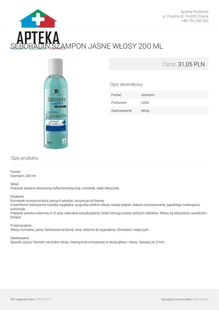 Apteka Rodzinna ul. Piastów 8, 74-500 Chojna +48 725 298 530 SEBORADIN SZAMPON JASNE WŁOSY 200 ML Cena: 31,05 PLN Opis słownikowy Postać szampon Producent LARA Zastosowanie włosy Opis produktu Postać Szampon, 200 ml Skład Preparat zawiera: bezwonną naftę kosmetyczną, rumianek, olejki eteryczne. Działanie Rumianek wzmacnia kolor jasnych włosów, utrzymuje ich barwę. D-panthenol intensywnie nawilża, wygładza i pogrubia włókno włosa, nadaje połysk, ułatwia rozczesywanie, zapobiega rozdwajaniu końcówek. Preparat zawiera witaminy A i E oraz naturalne antyoksydanty, które hamują rozwój wolnych rodników. Włosy są odżywione, nawilżone i lśniące. Przeznaczenie Włosy normalne, jasne, farbowane na blond, siwe, skłonne do wypadania. Dla kobiet i mężczyzn. Dawkowanie Sposób użycia: Nanieść na mokre włosy, intensywnie wmasować w skórę głowy i włosy. Spłukać po 2 min. Plik wygenerowano: 08-03-2017 Powered by TCPDF (www.tcpdf.org) Oprogramowanie sklepu: AptusShop