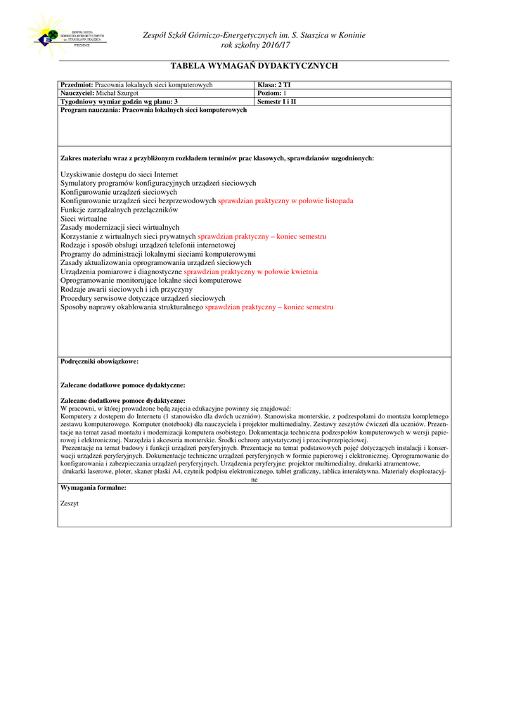 Zespół Szkół Górniczo-Energetycznych im. S. Staszica w Koninie rok szkolny 2016/17 TABELA WYMAGAŃ DYDAKTYCZNYCH Przedmiot: Pracownia lokalnych sieci komputerowych Nauczyciel: Michał Szurgot Tygodniowy wymiar godzin wg planu: 3 Program nauczania: Pracownia lokalnych sieci komputerowych Klasa: 2 TI Poziom: 1 Semestr I i II Zakres materiału wraz z przybliżonym rozkładem terminów prac klasowych, sprawdzianów uzgodnionych: Uzyskiwanie dostępu do sieci Internet Symulatory programów konfiguracyjnych urządzeń sieciowych Konfigurowanie urządzeń sieciowych Konfigurowanie urządzeń sieci bezprzewodowych sprawdzian praktyczny w połowie listopada Funkcje zarządzalnych przełączników Sieci wirtualne Zasady modernizacji sieci wirtualnych Korzystanie z wirtualnych sieci prywatnych sprawdzian praktyczny – koniec semestru Rodzaje i sposób obsługi urządzeń telefonii internetowej Programy do administracji lokalnymi sieciami komputerowymi Zasady aktualizowania oprogramowania urządzeń sieciowych Urządzenia pomiarowe i diagnostyczne sprawdzian praktyczny w połowie kwietnia Oprogramowanie monitorujące lokalne sieci komputerowe Rodzaje awarii sieciowych i ich przyczyny Procedury serwisowe dotyczące urządzeń sieciowych Sposoby naprawy okablowania strukturalnego sprawdzian praktyczny – koniec semestru Podręczniki obowiązkowe: Zalecane dodatkowe pomoce dydaktyczne: Zalecane dodatkowe pomoce dydaktyczne: W pracowni, w której prowadzone będą zajęcia edukacyjne powinny się znajdować: Komputery z dostępem do Internetu (1 stanowisko dla dwóch uczniów). Stanowiska monterskie, z podzespołami do montażu kompletnego zestawu komputerowego. Komputer (notebook) dla nauczyciela i projektor multimedialny. Zestawy zeszytów ćwiczeń dla uczniów. Prezentacje na temat zasad montażu i modernizacji komputera osobistego. Dokumentacja techniczna podzespołów komputerowych w wersji papierowej i elektronicznej. Narzędzia i akcesoria monterskie. Środki ochrony antystatycznej i przeciwprzepięciowej. Prezentacje na temat budowy i funkcji urządzeń peryferyjnych. Prezentacje na temat podstawowych pojęć dotyczących instalacji i konserwacji urządzeń peryferyjnych. Dokumentacje techniczne urządzeń peryferyjnych w formie papierowej i elektronicznej. Oprogramowanie do konfigurowania i zabezpieczania urządzeń peryferyjnych. Urządzenia peryferyjne: projektor multimedialny, drukarki atramentowe, drukarki laserowe, ploter, skaner płaski A4, czytnik podpisu elektronicznego, tablet graficzny, tablica interaktywna. Materiały eksploatacyjne Wymagania formalne: Zeszyt