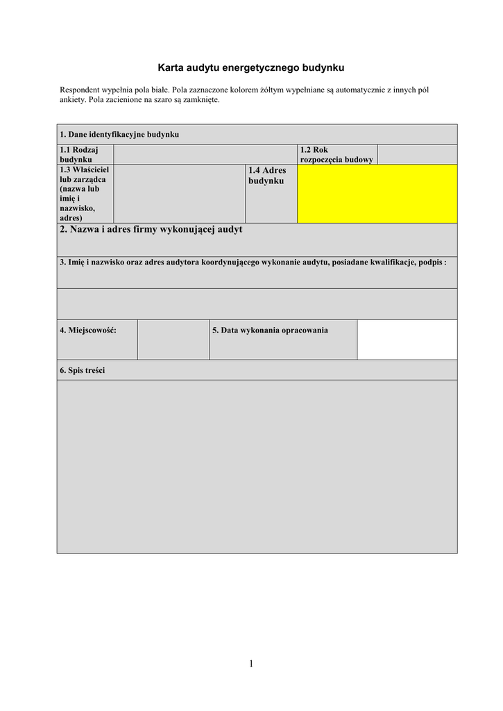 Karta audytu energetycznego budynku Respondent wypełnia pola białe. Pola zaznaczone kolorem żółtym wypełniane są automatycznie z innych pól ankiety. Pola zacienione na szaro są zamknięte. 1. Dane identyfikacyjne budynku 1.1 Rodzaj budynku 1.3 Właściciel lub zarządca (nazwa lub imię i nazwisko, adres) 1.2 Rok rozpoczęcia budowy 1.4 Adres budynku 2. Nazwa i adres firmy wykonującej audyt 3. Imię i nazwisko oraz adres audytora koordynującego wykonanie audytu, posiadane kwalifikacje, podpis: 4. Miejscowość: 5. Data wykonania opracowania 6. Spis treści 1 Karta audytu energetycznego budynku (dok.) 1. Dane ogólne 1. 2. 3. 4. 5. 6. 7. 8. 9. 10. Konstrukcja/technologia budynku Liczba kondygnacji Kubatura części ogrzewanej Powierzchnia netto budynku = powierzchnia ogrzewana Powierzchnia użytkowa budynku Liczba mieszkań Liczba osób użytkujących budynek Sposób przygotowania ciepłej wody Rodzaj systemu ogrzewania budynku Współczynnik kształtu A/V 2. Współczynniki przenikania ciepła przez przegrody zewnętrzne 1. 2. 3. 4. 5. 6. 7. 8. 9. [m3] [m2] [m2] [1/m] [W/(m2K)] Ściany zewnętrzne Dach/stropodach Strop piwnicy Okna Drzwi/bramy Podłoga na gruncie Inne Inne Inne 3. Sprawności składowe systemu ogrzewania 1. 2. 3. 4. 5. 6. Sprawność wytwarzania Sprawność przesyłania Sprawność regulacji Sprawność wykorzystania Uwzględnienie przerw na ogrzewanie w okresie tygodnia Uwzględnienie przerw na ogrzewanie w ciągu doby 4. Charakterystyka systemu wentylacji 1. 2. 3. 4. Rodzaj wentylacji (naturalna, mechaniczna) Sposób doprowadzenia i odprowadzenia powietrza Strumień powietrza wentylacyjnego Liczba wymian [m3/h] [1/h] 5. Charakterystyka energetyczna budynku 1. 2. 3. 4. 5. 6. 7. 8. 9. Obliczeniowa moc cieplna systemu ogrzewania [kW] Obliczeniowa moc cieplna na przygotowanie cwu [kW] Roczne zapotrzebowanie na ciepło do ogrzewania budynku (bez uwzględnienia sprawności systemu grzewczego i przerw w ogrzewaniu) [GJ/rok] Roczne zapotrzebowanie na ciepło do ogrzewania budynku (z uwzględnieniem sprawności systemu grzewczego i przerw w ogrzewaniu) [GJ/rok] Obliczeniowe zużycie energii do podgrzewania ciepłej wody użytkowej [GJ/rok] Zmierzone zużycie ciepła na ogrzewanie przeliczone na warunki sezonu standardowego i na przygotowanie cwu (służące do weryfikacji przyjętych składowych danych obliczeniowych bilansu ciepła) [GJ/rok] Wskaźnik sezonowego zapotrzebowania na ciepło do ogrzewania budynku (bez uwzględnienia sprawności systemu grzewczego i przerw w ogrzewaniu) (w standardowym sezonie grzewczym) [kWh/(m2 ·rok)] Wskaźnik sezonowego zapotrzebowania na ciepło do ogrzewania budynku (z uwzględnieniem sprawności systemu grzewczego i przerw w ogrzewaniu) (w standardowym sezonie grzewczym) [kWh/(m2 ·rok)] Wskaźnik sezonowego zapotrzebowania na ciepło do ogrzewania budynku (z uwzględnieniem sprawności systemu grzewczego i przerw w ogrzewaniu) (w standardowym sezonie grzewczym) [kWh/(m3 ·rok)] 2 Stan przed termomodernizacją Stan po termomodernizacji 6. Opłaty jednostkowe (obowiązujące w dniu sporządzenia audytu) 1. 2. 3. 4. 5. 6. Cena 1GJ za ogrzewanie Opłata 1 MW mocy zamówionej za ogrzewanie na miesiąc Opłata za podgrzanie 1m3 wody użytkowej Opłata 1 MW mocy zamówionej na podgrzanie cwu na miesiąc Opłata za ogrzanie 1m2 powierzchni użytkowej miesięcznie Inne [zł] [zł] [zł] [zł] [zł] [zł] 7. Charakterystyka ekonomiczna optymalnego wariantu przedsięwzięcia termomodernizacyjnego Planowana suma kredytu [zł] Planowane koszty całkowite [zł] Roczne zmniejszenie zapotrzebowania na energię [%] Premia termomodernizacyjna [zł] 3