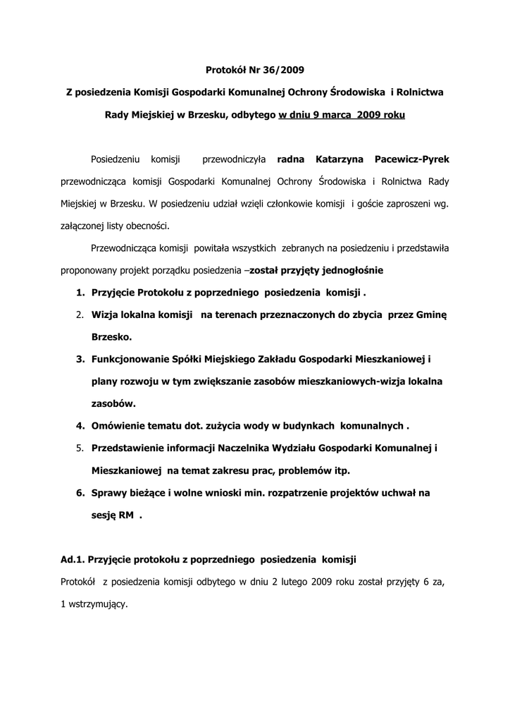 Protokół Nr 36/2009 Z posiedzenia Komisji Gospodarki Komunalnej Ochrony Środowiska i Rolnictwa Rady Miejskiej w Brzesku, odbytego w dniu 9 marca 2009 roku Posiedzeniu komisji przewodniczyła radna Katarzyna Pacewicz-Pyrek przewodnicząca komisji Gospodarki Komunalnej Ochrony Środowiska i Rolnictwa Rady Miejskiej w Brzesku. W posiedzeniu udział wzięli członkowie komisji i goście zaproszeni wg. załączonej listy obecności. Przewodnicząca komisji powitała wszystkich zebranych na posiedzeniu i przedstawiła proponowany projekt porządku posiedzenia –został przyjęty jednogłośnie 1. Przyjęcie Protokołu z poprzedniego posiedzenia komisji . 2. Wizja lokalna komisji na terenach przeznaczonych do zbycia przez Gminę Brzesko. 3. Funkcjonowanie Spółki Miejskiego Zakładu Gospodarki Mieszkaniowej i plany rozwoju w tym zwiększanie zasobów mieszkaniowych-wizja lokalna zasobów. 4. Omówienie tematu dot. zużycia wody w budynkach komunalnych . 5. Przedstawienie informacji Naczelnika Wydziału Gospodarki Komunalnej i Mieszkaniowej na temat zakresu prac, problemów itp. 6. Sprawy bieżące i wolne wnioski min. rozpatrzenie projektów uchwał na sesję RM . Ad.1. Przyjęcie protokołu z poprzedniego posiedzenia komisji Protokół z posiedzenia komisji odbytego w dniu 2 lutego 2009 roku został przyjęty 6 za, 1 wstrzymujący. 2 Ad.2 i AD.3 Wizja lokalna komisji na terenach przeznaczonych do zbycia przez Gminę Brzesko, oraz Funkcjonowanie Spółki Miejskiego Zakładu Gospodarki Mieszkaniowej i plany rozwoju w tym zwiększanie zasobów mieszkaniowychwizja lokalna zasobów. Ad.3. Dyrektor MZGM Franciszek Mrzygłód przybliżył komisji temat dot. rozliczania ubytków wody w budynkach komunalnych wielorodzinnych .Pan dyrektor przedstawił zapisy ustawy , które wyraźnie wskazują kogo należy obciążyć kosztami za brakującą wodę. Są w zarządzie spółki budynki komunalne , które tych kosztów nie mają i wychodzą na zero w tych mieszkaniach wodomierze są poza lokalem na zewnątrz. W starych budynkach komunalnych są różne przyczyny techniczne , które mają wpływ na to iż nie zgadza się pobór wody zarejestrowany na licznikach indywidualnych ze wskazaniami na liczniku głównym,na przykład w budynku Ogrodowa 2 różnica w poborze wody wynosiła 15 % .Jest to problem nie tylko u nas ale całej Polski .On osobiście jest zwolennikiem aby wodomierze w mieszkaniach dalej funkcjonowały bo w przeciwnym razie gdyby ich nie było to zużycie wody byłoby 2 razy większe .W chwili obecnej problem z rozliczeniem wody pojawił się w budynkach wielorodzinnych zarządzanych również przez SM .W zarządzie spółki są budynki wielorodzinne gdzie brakuje nawet 20 % wody , mieszkają tam rodziny wielodzietne gdzie zużycie wody na miesiąc wynosi 0,5 m3 na członka rodziny. Planujemy po wcześniejszym uzgodnieniu na zebraniu wspólnot mieszkaniowych wprowadzić ryczałt poboru wody tj.1,5 m3 wody na miesiąc na 1 członka rodziny.Problem ten przez częste kontrole i rozliczanie wody na budynkach spowodował ,że różnice w ilości pobranej wody znacznie spadły. Największe różnice w chwili obecnej w ilości pobranej wody występują w bloku Ogrodowa 11, trudno jest nam uchwycić co jest tego powodem , w tym bloku znajduje się również dużą ilość prywatnych gabinetów lekarskich ale są również lokatorzy o niskich zasobach. Woda z 3 wodociągu niesie ze sobą bardzo dużo zanieczyszczeń i możliwości zablokowania wodomierza realnie istnieją bo w starych budynkach brak jest filtrów. Prezes RPWiK Zbigniew Gładyś przybliżył komisji jakie są realne możliwości przeniesienia wodomierzy z poszczególnych mieszkań komunalnych na zewnątrz lokalu i zamontowania go w ciągu komunikacyjnym. Na wszystkie przeróbki w tym zakresie musi wyrazić zgodę wspólnota mieszkaniowa .Co 5 lat każdy wodomierz winien być legalizowany , w chwili obecnej mamy wodomierze klasy B ale przymierzamy się do wprowadzenia wodomierzy klasy C i usytuowanie ich na klatkach schodowych. Prezes Franciszek Mrzygłód zwrócił uwagę ,że w starych budynkach komunalnych nie ma możliwości aby wodomierze zostały umieszczone na klatkach schodowych , należałoby w związku z tym przebudować wszystkie piony instalacji wewnętrznych i umiejscowić je na klatkach ale są to straszne koszty .Takie prace wykonaliśmy w małym budynku na ulicy Kościuszki 64a, ale nic nam to nie dało indywidualnych i nie zmieniło zużycia wody na wodomierzach i wodomierzu głównym , dlatego chyba najlepszym rozwiązaniem jest zmiana pionów. Wniosek Komisji: Komisja wnioskuje aby w blokach w których są duże różnice w zużyciu wody pomiędzy wodomierzem głównym a wodomierzami indywidualnymi rozważyć możliwość zainstalowania podliczników na każdym pionie. Komisja uważa iż należy zwiększyć częstotliwość kontroli i odczytu liczników wody , jednocześnie należy uświadomić mieszkańców iż okradają się nawzajem a koszty ponoszą wspólnie. Głosowano jednogłośnie Dyskusja po odbytej wizji lokalnej komisja podjęła wniosek : Komisja pozytywnie jednogłośnie zaopiniowała przeznaczenie do sprzedaży : 4 działki ewidencyjnej nr 278/4 położonej w Wokowicach , działki ewidencyjnej nr 2518 położonej w Porębie Spytkowskiej , działek ewidencyjnych nr 691/6 i 691/7 położonych w Buczu . Zastępca Burmistrza Jerzy Tyrkiel poinformował komisję iż został rozeznany temat dot. możliwości rozbudowy budynku noclegowni na mieszkania komunalne. Przy tej działce którą mamy w chwili obecnej nie jesteśmy w stanie w poziomie poszerzyć tego kompleksu , nie jesteśmy również w stanie rozbudować tego budynku w pionie bez potężnych kosztów co w praktyce jest to opiniowane negatywnie . Jeśli chodzi o samą działkę jest możliwość potencjalnie ja poszerzyć w kierunku zachodnim od browaru , ale wg. wiedzy jaka posiada nie ma takiej możliwości abyśmy tą działkę pozyskali głowni