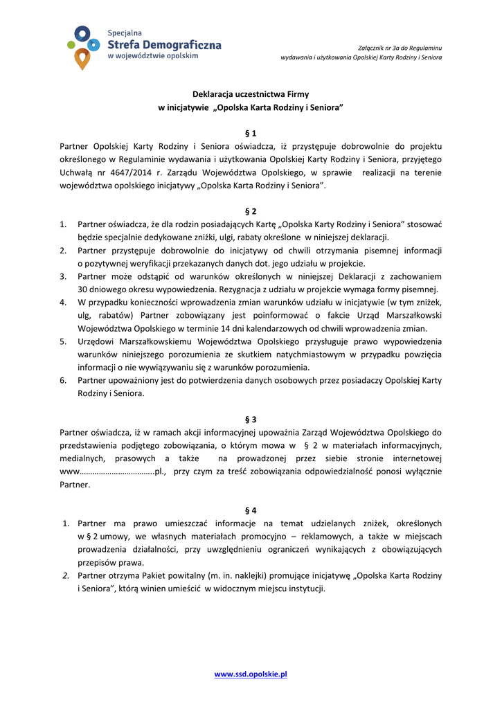 Załącznik nr 3a do Regulaminu wydawania i użytkowania Opolskiej Karty Rodziny i Seniora Deklaracja uczestnictwa Firmy w inicjatywie „Opolska Karta Rodziny i Seniora” §1 Partner Opolskiej Karty Rodziny i Seniora oświadcza, iż przystępuje dobrowolnie do projektu określonego w Regulaminie wydawania i użytkowania Opolskiej Karty Rodziny i Seniora, przyjętego Uchwałą nr 4647/2014 r. Zarządu Województwa Opolskiego, w sprawie realizacji na terenie województwa opolskiego inicjatywy „Opolska Karta Rodziny i Seniora”. 1. 2. 3. 4. 5. 6. §2 Partner oświadcza, że dla rodzin posiadających Kartę „Opolska Karty Rodziny i Seniora” stosować będzie specjalnie dedykowane zniżki, ulgi, rabaty określone w niniejszej deklaracji. Partner przystępuje dobrowolnie do inicjatywy od chwili otrzymania pisemnej informacji o pozytywnej weryfikacji przekazanych danych dot. jego udziału w projekcie. Partner może odstąpić od warunków określonych w niniejszej Deklaracji z zachowaniem 30 dniowego okresu wypowiedzenia. Rezygnacja z udziału w projekcie wymaga formy pisemnej. W przypadku konieczności wprowadzenia zmian warunków udziału w inicjatywie (w tym zniżek, ulg, rabatów) Partner zobowiązany jest poinformować o fakcie Urząd Marszałkowski Województwa Opolskiego w terminie 14 dni kalendarzowych od chwili wprowadzenia zmian. Urzędowi Marszałkowskiemu Województwa Opolskiego przysługuje prawo wypowiedzenia warunków niniejszego porozumienia ze skutkiem natychmiastowym w przypadku powzięcia informacji o nie wywiązywaniu się z warunków porozumienia. Partner upoważniony jest do potwierdzenia danych osobowych przez posiadaczy Opolskiej Karty Rodziny i Seniora. §3 Partner oświadcza, iż w ramach akcji informacyjnej upoważnia Zarząd Województwa Opolskiego do przedstawienia podjętego zobowiązania, o którym mowa w § 2 w materiałach informacyjnych, medialnych, prasowych a także na prowadzonej przez siebie stronie internetowej www……………………………..pl., przy czym za treść zobowiązania odpowiedzialność ponosi wyłącznie Partner. §4 1. Partner ma prawo umieszczać informacje na temat udzielanych zniżek, określonych w § 2 umowy, we własnych materiałach promocyjno – reklamowych, a także w miejscach prowadzenia działalności, przy uwzględnieniu ograniczeń wynikających z obowiązujących przepisów prawa. 2. Partner otrzyma Pakiet powitalny (m. in. naklejki) promujące inicjatywę „Opolska Karta Rodziny i Seniora”, którą winien umieścić w widocznym miejscu instytucji. www.ssd.opolskie.pl Deklaracja przystąpienia Firmy do inicjatywy „Opolska Karta Rodziny i Seniora” Nazwa firmy: ……………………………………….…………………………………………………………………………………………………………………...……………… Adres siedziby: …………………………………………………………………………………………………………………………………………………………………………… NIP i REGON: …………………………….……………………………………………………………………………………………………………………………………………… Numer telefonu i adres e-mail: …………………………………………………………………….……………………………………………………………………………………………………… Osoba do kontaktu: …………………………………………………………………………………………………….……………………………………………………………………… Zakres działalności firmy: ……………………………………………………………………………………………………………………………….…………………………………………… Proponowane ulgi, zniżki, rabaty w ramach Opolskiej Karty Rodziny i Seniora ……………………………………………………………………………………………………………………………….…………………………………………… …………………………………………………………………………………….……………………………………………….…………………………………….. ……………………………………………………………………………………………………………………………………………….……………………….… …..…………….………..………... Data/Pieczątka firmowa/Podpis „Wyrażam zgodę na przetwarzanie moich danych osobowych przez Administratora, którym jest Departament Polityki Regionalnej i Przestrzennej Urzędu Marszałkowskiego Województwa Opolskiego ul. Piastowska 14 45-082 Opole dla celów związanych z realizacją inicjatywy Opolska Karta Rodziny i Seniora. Zostałem poinformowany, że podanie danych jest dobrowolne, lecz niezbędne do korzystania udziału w inicjatywie oraz, że przysługuje mi prawo dostępu do moich danych i prawo ich poprawiania oraz odwołania zgody w każdym czasie. Potwierdzam, że zapoznałem się z Regulaminem wydawania i użytkowania Opolskiej Karty Rodziny i Seniora, akceptuję jego treść, a podane przeze mnie dane są prawdziwe”. …..…………….………..………... Data/Pieczątka firmowa/Podpis www.ssd.opolskie.pl