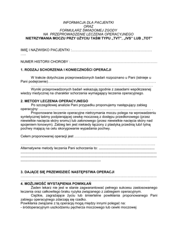 INFORMACJA DLA PACJENTKI ORAZ FORMULARZ ŚWIADOMEJ ZGODY NA PRZEPROWADZENIE LECZENIA OPERACYJNEGO NIETRZYMANIA MOCZU PRZY UŻYCIU TAŚM TYPU „TVT”, „IVS” LUB „TOT” IMIĘ I NAZWISKO PACJENTKI :…………………………………………………………… ….. NUMER HISTORII CHOROBY :………………………………………………………………… 1. RODZAJ SCHORZENIA I KONIECZNOŚCI OPERACJI W trakcie dotychczas przeprowadzonych badań rozpoznano u Pani (istnieje u Pani podejrzenie)………………………………………………………………………………… …………………………………………………………………………………………… Wyniki przeprowadzonych badań wskazują zgodnie z zasadami współczesnej wiedzy medycznej na charakter schorzenia wymagający leczenia operacyjnego. 2. METODY LECZENIA OPERACYJNEGO Po szczegółowej analizie Pani przypadku proponujemy następujący zabieg operacyjny: …………………………………………………………………………………… . Proponowane leczenie operacyjne nietrzymania moczu polega na wprowadzeniu syntetycznej taśmy podpierającej cewkę moczową z dostępu przedłonowego (przez niewielkie nacięcia skóry sromu) lub załonowego (przez niewielkie nacięcia skóry nad spojeniem łonowym). Zabieg ten jest niekiedy łączony z plastyką przednią lub/i tylną pochwy mającą na celu skorygowanie wypadania pochwy. Celem proponowanej operacji jest …………………………………………………................. …………………………………………………………………………………………………….. Alternatywne metody leczenia Pani schorzenia to: ………………………………………… ……………………………………………………………………………………………………… ……………………………………………………………………………………………………… …………………………………………………………… 3. DAJĄCE SIĘ PRZEWIDZIEĆ NASTĘPSTWA OPERACJI ……………………………………………………………………………………………………… ………………………………………………………………………………………………… 4. MOŻLIWOŚĆ WYSTĄPIENIA POWIKŁAŃ Żaden lekarz nie jest w stanie zagwarantować pełnego sukcesu zastosowanego leczenia oraz całkowitego braku ryzyka związanego z zabiegiem operacyjnym. Ciężkie, zagrażające życiu lub śmiertelne powikłania proponowanego Pani zabiegu operacyjnego zdarzają się rzadko. Powikłania związane z tą operacją mogą między innymi polegać na: - śródoperacyjnym uszkodzeniu pęcherza moczowego lub cewki moczowej - krwotoku śródoperacyjnym - wtórnym krwawieniu lub krwiakach wymagających przetoczenia krwi i/lub ponownej interwencji operacyjnej (otwarcia jamy brzusznej) - powstaniu przetoki dróg moczowych (np. pęcherzowo-pochwowej) - powikłaniach zakrzepowo-zatorowych (tworzenie się skrzeplin i zatykanie naczyń krwionośnych przez skrzepy) - zakażeniu rany pooperacyjnej - zapaleniu pęcherza moczowego - zaburzeniach w opróżnianiu pęcherza moczowego 5. ROKOWANIE Prawdopodobieństwo powodzenia proponowanej operacji jest w Pani przypadku: [ ] duże [ ] średnie [ ] ograniczone Jeżeli nie wyrazi Pani zgody na proponowany zabieg rokowanie co do Pani stanu zdrowia w przyszłości jest następujące: ……………………………………………….. ……………………………………………………………………………………………………… 6. ROZMOWA Z LEKARZEM Prosimy, aby Pani zapytała nas o wszystko co chciałaby Pani wiedzieć w związku z planowanym leczeniem. Wszelkie informacje dodatkowe dotyczące planowanego leczenia oraz wszelkie oczekiwane przez Panią wyjaśnienia można uzyskać u każdego specjalisty w zakresie ginekologii i położnictwa zatrudnionego w naszym Oddziale/Klinice. Chętnie odpowiemy na wszystkie Pani pytania. ZASTRZEŻENIA PACJENTKI CO DO PROPONOWANEGO LECZENIA OPERACYJNEGO ……………………………………………………………………………………………………… ……………………………………………………………………………………………………… ……………………………………………………………………………………………………… 7. KONIECZNOŚĆ ZMIANY/ROZSZERZENIA ZABIEGU OPERACYJNEGO WYSTĘPUJĄCA PODCZAS JEGO TRWANIA W czasie zabiegu operacyjnego możemy stwierdzić istnienie szczególnych i trudnych do przewidzenia okoliczności, które mogą wymagać zmiany lub rozszerzenia wstępnie proponowanej operacji. Prosimy o wyrażenie zgody także i na tę okoliczność. Przy braku Pani zgody zabieg operacyjny musiałby zostać przerwany i ponownie później powtórzony, co stanowiłoby dodatkowe obciążenie dla Pani zdrowia. Konieczne byłoby wówczas również ponowne znieczulenie. 8. OŚWIADCZENIE PACJENTKI W pełni zrozumiałam informacje zawarte w tym formularzu oraz przekazane mi podczas rozmowy w lekarzem. Zapewniono mi nieograniczone możliwości zadania pytań i na wszystkie udzielono mi odpowiedzi i wyjaśnień w sposób satysfakcjonujący. Po zapoznaniu się z treścią tego formularza i rozmowie wyjaśniającej z Panem/Panią Dr………………….........spełnione zostały wszelkie moje wymagania co do informacji na temat: -rozpoznania -proponowanych oraz alternatywnych metod diagnostycznych i leczniczych -dających się przewidzieć następstw zastosowania tych metod lub ich zaniechania -wyników leczenia operacyjnego -rokowania -ewentualnego leczenia pooperacyjnego Znane mi są możliwe powikłania związane z tym zabiegiem operacyjnym. Bez zastrzeżeń (lub z powyższymi zastrzeżeniami) zgadzam się na przeprowadzenie u mnie