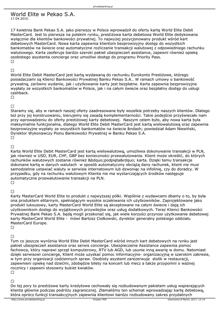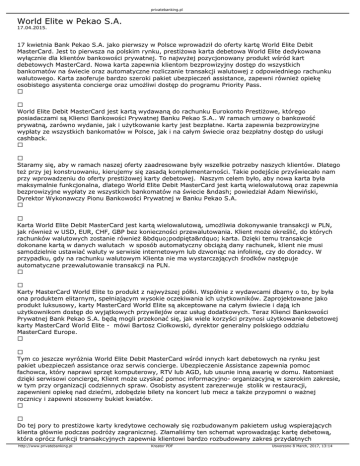 privatebanking.pl World Elite w Pekao S.A. 17.04.2015. 17 kwietnia Bank Pekao S.A. jako pierwszy w Polsce wprowadził do oferty kartę World Elite Debit MasterCard. Jest to pierwsza na polskim rynku, prestiżowa karta debetowa World Elite dedykowana wyłącznie dla klientów bankowości prywatnej. To najwyżej pozycjonowany produkt wśród kart debetowych MasterCard. Nowa karta zapewnia klientom bezprowizyjny dostęp do wszystkich bankomatów na świecie oraz automatyczne rozliczanie transakcji walutowej z odpowiedniego rachunku walutowego. Karta zaoferuje bardzo szeroki pakiet ubezpieczeń assistance, zapewni również opiekę osobistego asystenta concierge oraz umożliwi dostęp do programu Priority Pass. World Elite Debit MasterCard jest kartą wydawaną do rachunku Eurokonto Prestiżowe, którego posiadaczami są Klienci Bankowości Prywatnej Banku Pekao S.A.. W ramach umowy o bankowość prywatną, zarówno wydanie, jak i użytkowanie karty jest bezpłatne. Karta zapewnia bezprowizyjne wypłaty ze wszystkich bankomatów w Polsce, jak i na całym świecie oraz bezpłatny dostęp do usługi cashback. Staramy się, aby w ramach naszej oferty zaadresowane były wszelkie potrzeby naszych klientów. Dlatego też przy jej konstruowaniu, kierujemy się zasadą komplementarności. Takie podejście przyświecało nam przy wprowadzeniu do oferty prestiżowej karty debetowej. Naszym celem było, aby nowa karta była maksymalnie funkcjonalna, dlatego World Elite Debit MasterCard jest kartą wielowalutową oraz zapewnia bezprowizyjne wypłaty ze wszystkich bankomatów na świecie – powiedział Adam Niewiński, Dyrektor Wykonawczy Pionu Bankowości Prywatnej w Banku Pekao S.A. Karta World Elite Debit MasterCard jest kartą wielowalutową, umożliwia dokonywanie transakcji w PLN, jak również w USD, EUR, CHF, GBP bez konieczności przewalutowania. Klient może określić, do których rachunków walutowych zostanie również „podpięta” karta. Dzięki temu transakcje dokonane kartą w danych walutach w sposób automatyczny obciążą dany rachunek, klient nie musi samodzielnie ustawiać waluty w serwisie internetowym lub dzwoniąc na infolinię, czy do doradcy. W przypadku, gdy na rachunku walutowym Klienta nie ma wystarczających środków następuje automatyczne przewalutowanie transakcji na PLN. Karty MasterCard World Elite to produkt z najwyższej półki. Wspólnie z wydawcami dbamy o to, by była ona produktem elitarnym, spełniającym wysokie oczekiwania ich użytkowników. Zaprojektowane jako produkt luksusowy, karty MasterCard World Elite są akceptowane na całym świecie i dają ich użytkownikom dostęp do wyjątkowych przywilejów oraz usług dodatkowych. Teraz Klienci Bankowości Prywatnej Bank Pekao S.A. będą mogli przekonać się, jak wiele korzyści przynosi użytkowanie debetowej karty MasterCard World Elite - mówi Bartosz Ciołkowski, dyrektor generalny polskiego oddziału MasterCard Europe. Tym co jeszcze wyróżnia World Elite Debit MasterCard wśród innych kart debetowych na rynku jest pakiet ubezpieczeń assistance oraz serwis concierge. Ubezpieczenie Assistance zapewnia pomoc fachowca, który naprawi sprzęt komputerowy, RTV lub AGD, lub usunie inną awarię w domu. Natomiast dzięki serwisowi concierge, Klient może uzyskać pomoc informacyjno- organizacyjną w szerokim zakresie, w tym przy organizacji codziennych spraw. Osobisty asystent zarezerwuje stolik w restauracji, zapewnieni opiekę nad dziećmi, zdobędzie bilety na koncert lub mecz a także przypomni o ważnej rocznicy i zapewni stosowny bukiet kwiatów. Do tej pory to prestiżowe karty kredytowe cechowały się rozbudowanym pakietem usług wspierających klienta głównie podczas podróży zagranicznej. Złamaliśmy ten schemat wprowadzając kartę debetową, która oprócz funkcji transakcyjnych zapewnia klientowi bardzo rozbudowany zakres przydatnych http://www.privatebanking.pl Kreator PDF Utworzono 8 March, 2017, 13:14 privatebanking.pl ubezpieczeń oraz daje możliwość skorzystania z pomocy osobistego asystenta,. Szczególny nacisk położyliśmy na zakres ubezpieczeń działających na terenie Polski, gdyż rozbudowaną ochronę podczas podróży za granicą zapewniają nasze prestiżowe karty kredytowe- powiedziała Katarzyna Tomaszewska, Dyrektor Zarządzający, Departament Produktów i Marketingu w Pionie Bankowości Prywatnej Banku Pekao S.A. Oprócz prestiżowej karty World Elite Debit MasterCard, klienci Pekao mogą również korzystać z elitarnej karty kredytowej Pekao World Elite MasterCard, które razem tworzą idealny pakiet World Elite najwyżej pozycjonowanych kart na rynku w Polsce i Europie. Bank Pekao S.A. jest liderem na rynku usług private banking, szczególnie biorąc pod uwagę podstawowy wyznacznik w tym obszarze – poziom aktywów. Ponad 6000 Klientów bankowości prywatnej na koniec 2014 roku zdeponowało w Banku 11,2 mld PLN uwzględniając depozyty, fundusze oraz giełdę. źródło: Biuro Prasowe Pekao SA http://www.privatebanking.pl Kreator PDF Utworzono 8 March, 2017, 13:14
