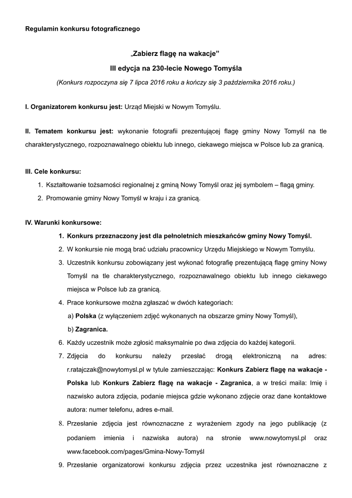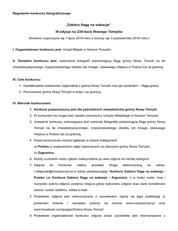 Regulamin konkursu fotograficznego „Zabierz flagę na wakacje” III edycja na 230-lecie Nowego Tomyśla (Konkurs rozpoczyna się 7 lipca 2016 roku a kończy się 3 października 2016 roku.) I. Organizatorem konkursu jest: Urząd Miejski w Nowym Tomyślu. II. Tematem konkursu jest: wykonanie fotografii prezentującej flagę gminy Nowy Tomyśl na tle charakterystycznego, rozpoznawalnego obiektu lub innego, ciekawego miejsca w Polsce lub za granicą. III. Cele konkursu: 1. Kształtowanie tożsamości regionalnej z gminą Nowy Tomyśl oraz jej symbolem – flagą gminy. 2. Promowanie gminy Nowy Tomyśl w kraju i za granicą. IV. Warunki konkursowe: 1. Konkurs przeznaczony jest dla pełnoletnich mieszkańców gminy Nowy Tomyśl. 2. W konkursie nie mogą brać udziału pracownicy Urzędu Miejskiego w Nowym Tomyślu. 3. Uczestnik konkursu zobowiązany jest wykonać fotografię prezentującą flagę gminy Nowy Tomyśl na tle charakterystycznego, rozpoznawalnego obiektu lub innego ciekawego miejsca w Polsce lub za granicą. 4. Prace konkursowe można zgłaszać w dwóch kategoriach: a) Polska (z wyłączeniem zdjęć wykonanych na obszarze gminy Nowy Tomyśl), b) Zagranica. 6. Każdy uczestnik może zgłosić maksymalnie po dwa zdjęcia do każdej kategorii. 7. Zdjęcia do konkursu należy przesłać drogą elektroniczną na adres: [email protected] w tytule zamieszczając: Konkurs Zabierz flagę na wakacje Polska lub Konkurs Zabierz flagę na wakacje - Zagranica, a w treści maila: Imię i nazwisko autora zdjęcia, podanie miejsca gdzie wykonano zdjęcie oraz dane kontaktowe autora: numer telefonu, adres e-mail. 8. Przesłanie zdjęcia jest równoznaczne z wyrażeniem zgody na jego publikację (z podaniem imienia i nazwiska autora) na stronie www.nowytomysl.pl oraz www.facebook.com/pages/Gmina-Nowy-Tomyśl 9. Przesłanie organizatorowi konkursu zdjęcia przez uczestnika jest równoznaczne z zapewnieniem przez uczestnika, że osoby trzecie przedstawione na zdjęciu nie wnoszą zastrzeżeń wobec publicznego prezentowania swojego wizerunku na zdjęciu zgłaszanym do konkursu. 10.Do konkursu mogą zostać zgłoszone jedynie te fotografie, które nie zostały uprzednio zgłoszone do innego konkursu. 11.Zdjęcia należy przesyłać w formacie JPG. 12.Uczestnik zobowiązuje się do zachowania w oryginale zdjęcia zgłoszonego do konkursu, jeżeli zdjęcie było poddane obróbce. 13.Przy wykonywaniu zdjęć należy pamiętać o wykorzystaniu flagi gminy Nowy Tomyśl w sposób, który nie narusza “dobra osobistego gminy Nowy Tomyśl”. Reguluje to Uchwała Rady Miejskiej w Nowym Tomyślu Nr XXVIII/280/2013 z dnia 22 lutego 2013 roku. Tekst Uchwały pod linkiem: http://nowytomysl.pl/insygnia-gminy 16.Organizator konkursu zastrzega sobie prawo do wyłączenia z udziału w konkursie fotografii o niskiej jakości technicznej, przesłanych w złym formacie, rozdzielczości i wielkości pliku oraz prac, które w inny sposób naruszają niniejszy regulamin. 17.Zdjęcia niezgodne z regulaminem nie będą brane pod uwagę przy ocenie. 18.Zdjęcia nadesłane na konkurs oceni komisja powołana przez organizatora, która również ma decydujący głos w kwestiach nie objętych niniejszym regulaminem. Decyzje Jury będą ostateczne. 19.Autorzy najciekawszych i najoryginalniejszych zdjęć otrzymają nagrody w dwóch kategoriach: a) Polska, b) Zagranica. 20.Zdjęcia nadesłane na konkurs przechodzą na własność organizatora, który zastrzega sobie możliwość późniejszej ich prezentacji oraz publikacji. Uczestnicy konkursu przenoszą nieodpłatnie na organizatora prawa autorskie związane z przedłożonymi na konkurs pracami 21.Przystąpienie do konkursu oznacza akceptację niniejszego regulaminu. V. Terminarz konkursu 1. Konkurs rozpoczyna się 7 lipca 2016 roku, a kończy się 3 października 2016 roku. 2. Fotografie konkursowe należy przesłać na adres e-mailowy: [email protected] do dnia 3 października 2015 roku. 3. Rozstrzygnięcie konkursu i ogłoszenie wyników konkursu nastąpi w ciągu dwóch tygodni od zakończenia konkursu. 4. Organizatorzy konkursu zastrzegają sobie możliwość zmiany terminów opublikowania na stronie internetowej wyników konkursu oraz terminu wręczenia nagród, nie dalej jednak niż 1 miesiąc od dnia zakończenia konkursu. 5. Nagrodami w konkursie będą: urządzenia elektroniczne oraz materiały promocyjne. 6. Autorzy wyróżnionych zdjęć zostaną poinformowani przez organizatora o terminie i miejscu wręczenia nagród. 7. Informacji na temat konkursu udziela: Ryszard Ratajczak (tel. 61 44 26 677) oraz Sławomira Ksiąg – Górna (tel. 61 44 26 614) . Zapytania dotyczące konkursu można również przesyłać na adres mailowy: [email protected] 8. Regulamin konkursu dostępny na stronie internetowej Urzędu Miejskiego w Nowym Tomyślu: www.nowytomysl.pl