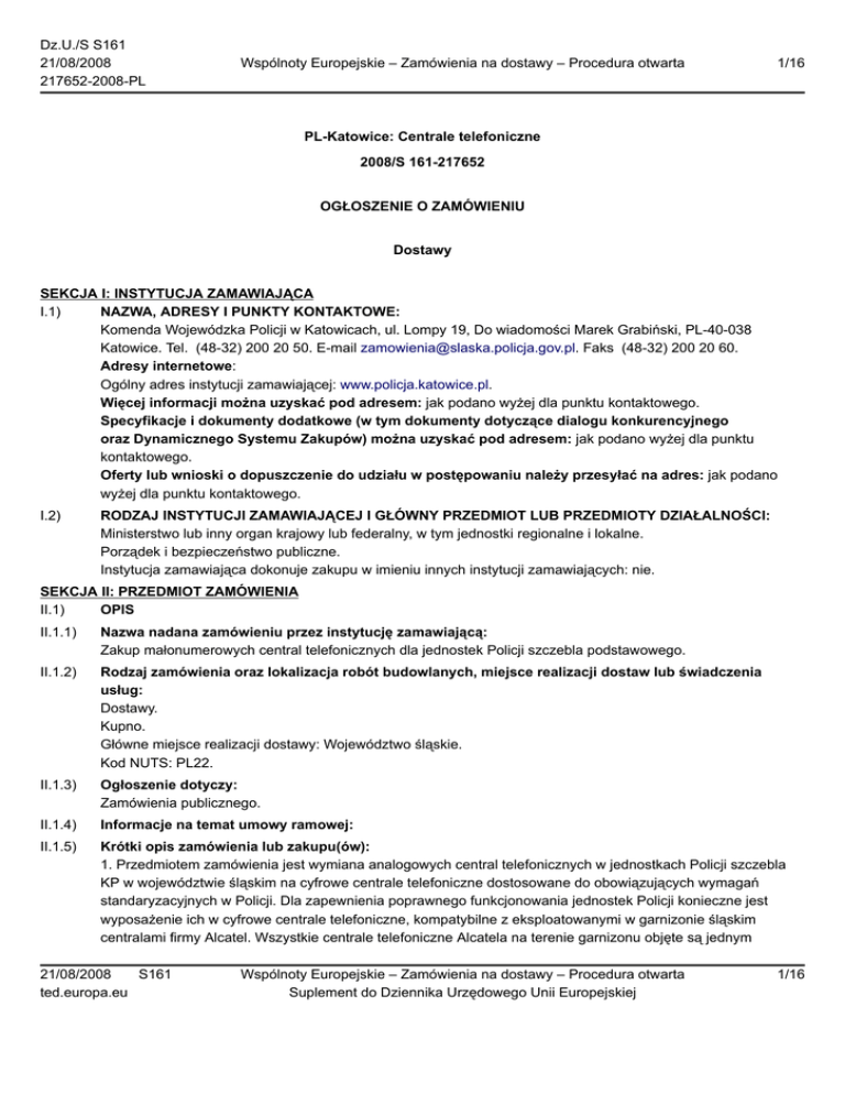 Dz.U./S S161 21/08/2008 217652-2008-PL Wspólnoty Europejskie – Zamówienia na dostawy – Procedura otwarta 1/16 PL-Katowice: Centrale telefoniczne 2008/S 161-217652 OGŁOSZENIE O ZAMÓWIENIU Dostawy SEKCJA I: INSTYTUCJA ZAMAWIAJĄCA I.1) NAZWA, ADRESY I PUNKTY KONTAKTOWE: Komenda Wojewódzka Policji w Katowicach, ul. Lompy 19, Do wiadomości Marek Grabiński, PL-40-038 Katowice. Tel. (48-32) 200 20 50. E-mail [email protected]. Faks (48-32) 200 20 60. Adresy internetowe: Ogólny adres instytucji zamawiającej: www.policja.katowice.pl. Więcej informacji można uzyskać pod adresem: jak podano wyżej dla punktu kontaktowego. Specyfikacje i dokumenty dodatkowe (w tym dokumenty dotyczące dialogu konkurencyjnego oraz Dynamicznego Systemu Zakupów) można uzyskać pod adresem: jak podano wyżej dla punktu kontaktowego. Oferty lub wnioski o dopuszczenie do udziału w postępowaniu należy przesyłać na adres: jak podano wyżej dla punktu kontaktowego. I.2) RODZAJ INSTYTUCJI ZAMAWIAJĄCEJ I GŁÓWNY PRZEDMIOT LUB PRZEDMIOTY DZIAŁALNOŚCI: Ministerstwo lub inny organ krajowy lub federalny, w tym jednostki regionalne i lokalne. Porządek i bezpieczeństwo publiczne. Instytucja zamawiająca dokonuje zakupu w imieniu innych instytucji zamawiających: nie. SEKCJA II: PRZEDMIOT ZAMÓWIENIA II.1) OPIS II.1.1) Nazwa nadana zamówieniu przez instytucję zamawiającą: Zakup małonumerowych central telefonicznych dla jednostek Policji szczebla podstawowego. II.1.2) Rodzaj zamówienia oraz lokalizacja robót budowlanych, miejsce realizacji dostaw lub świadczenia usług: Dostawy. Kupno. Główne miejsce realizacji dostawy: Województwo śląskie. Kod NUTS: PL22. II.1.3) Ogłoszenie dotyczy: Zamówienia publicznego. II.1.4) Informacje na temat umowy ramowej: II.1.5) Krótki opis zamówienia lub zakupu(ów): 1. Przedmiotem zamówienia jest wymiana analogowych central telefonicznych w jednostkach Policji szczebla KP w województwie śląskim na cyfrowe centrale telefoniczne dostosowane do obowiązujących wymagań standaryzacyjnych w Policji. Dla zapewnienia poprawnego funkcjonowania jednostek Policji konieczne jest wyposażenie ich w cyfrowe centrale telefoniczne, kompatybilne z eksploatowanymi w garnizonie śląskim centralami firmy Alcatel. Wszystkie centrale telefoniczne Alcatela na terenie garnizonu objęte są jednym 21/08/2008 S161 ted.europa.eu Wspólnoty Europejskie – Zamówienia na dostawy – Procedura otwarta Suplement do Dziennika Urzędowego Unii Europejskiej 1/16 Dz.U./S S161 21/08/2008 217652-2008-PL Wspólnoty Europejskie – Zamówienia na dostawy – Procedura otwarta 2/16 spójnym systemem zdalnego zarządzania. Przedmiot zamówienia obejmuje dostawę, montaż, instalacja i konfigurację każdej centrali telefonicznej Alcatel OmniPCX Enterprise we wskazanych lokalizacjach w poszczególnych zadaniach oraz pełna integracja z systemem telekomutacyjnym Alcatel. Dołączenie do sieci publicznej poprzez interfejsy ISDN typu S0 i łącza analogowe od operatora publicznego. Dołączenie do sieci resortowej poprzez łącza FXS z wykorzystaniem sygnalizacji w kanale transmisji danych (tzw. HYBRYDLINK), interfejs ISDN typu S0 oraz VoIP z wykorzystaniem funkcjonującego systemu teletransmisyjnego na bazie urządzeń Vanguard. Wykonanie połączeń kablowych pomiędzy szafami WSZ-06 a szafą GPD na patchpanelu. Dołączenie do istniejącego systemu zarządzania i taryfikacji OmniVista 4760. Zainstalowana centrala winna posiadać pełną funkcjonalność operacyjną taką jak istniejący obecnie system telekomutacyjny w zakresie planu numeracji, usług, taryfikacji, nadzoru i zarządzania. Ponadto realizacja obejmuje: a.dostarczenie i zainstalowanie centrali telefonicznej w szafach teletechnicznych 19”, b.dołączenie do istniejącego systemu zasilania gwarantowanego DC 48V zainstalowanego w szafie teletechnicznej 19”, długość przewodu do 2 m c.wykonanie połączenia kablowego pomiędzy szafą WSZ-06 gdzie zainstalowana zostanie centrala, a szafą Głównego Punktu Dystrybucyjnego GPD, połączenie zakończone czteroma patchpanelami po 50 gniazd typu RJ45, długość kabla 20 m Przedmiot zamówienia podzielono na cztery zadania. Wykonawcy mogą składać ofertę na dowolną ilość zadań. 2. Zadanie nr 1 2.1 Przedmiotem zamówienia jest dostawa, montaż, instalacja i konfiguracja cyfrowych central telefonicznych określonego typu, fabrycznie nowych wyprodukowanych w 2008r., gatunku I-go w poniższych lokalizacjach: l.p. Lokalizacja - Typ centrali 1 licencja na rozbudowę systemu zarządzania o 2600 użytkowników KWP - 2 KP I Chorzów ul. Batorego 19 - 1 3 KP II Ruda Śląska ul. Pocztowa 3 - 2 4 KP III Ruda Śląska ul. Solna 4 - 2 5 KP Boguszowice ul. Osiedle Południe 37a - 2 6 KP III Katowice ul. Książęca 20 - 2 7 KP IV Katowice ul. Policyjna 7 - 2 8 KP V Katowice ul. Zamenhoffa 16 - 2 9 KP I Dąbrowa Górnicza ul. Hetmańska 17 - 3 10 KP II Dąbrowa Górnicza ul. Aleje Zwycięstwa 7 - 3 11 KP IV Sosnowiec ul. Wojska Polskiego 34 - 2 Typ poszczególnych centrali określono w punkcie 6. 2.2 Dokładne miejsce wykonania prac związanych z zamówieniem zostaną wskazane przez Zamawiającego, 2.3 Rezultatem wykonanych prac musi być doprowadzenie do pełnej funkcjonalności budowanych systemów i ich pełnej integracji z systemami istniejącymi. 2.4 Dokumentacja - Wykonanie i dostarczenie w języku polskim dokumentacji techniczno-eksploatacyjnej oraz powykonawczej dokumentacji projektowej (2 kpl. w formie papierowej oraz w formie elektronicznej). 2.5 Szkolenie dla dwóch osób: 2.5.1 w zakresie podstawowej obsługi central. a. Szkolenie podstawowe obejmuje: zrozumienie pracy systemu aparatów UA, kreowanie i modyfikacja podstawowych właściwości abonentów, programowanie grup abonenckich, zestawów sekretarsko – dyrektorskich. b. szkolenia w zakresie podstawowym będzie trwało nie krócej niż 3 dni robocze c. Zamawiający nie dopuszcza przeprowadzenia szkolenia w siedzibie Zam