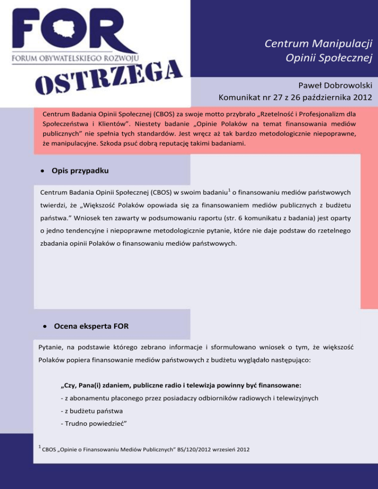 Centrum Manipulacji Opinii Społecznej Paweł Dobrowolski Komunikat nr 27 z 26 października 2012 Centrum Badania Opinii Społecznej (CBOS) za swoje motto przybrało „Rzetelność i Profesjonalizm dla Społeczeństwa i Klientów”. Niestety badanie „Opinie Polaków na temat finansowania mediów publicznych” nie spełnia tych standardów. Jest wręcz aż tak bardzo metodologicznie niepoprawne, że manipulacyjne. Szkoda psuć dobrą reputację takimi badaniami. Opis przypadku Centrum Badania Opinii Społecznej (CBOS) w swoim badaniu 1 o finansowaniu mediów państwowych twierdzi, że „Większość Polaków opowiada się za finansowaniem mediów publicznych z budżetu państwa.” Wniosek ten zawarty w podsumowaniu raportu (str. 6 komunikatu z badania) jest oparty o jedno tendencyjne i niepoprawne metodologicznie pytanie, które nie daje podstaw do rzetelnego zbadania opinii Polaków o finansowaniu mediów państwowych. Ocena eksperta FOR Pytanie, na podstawie którego zebrano informacje i sformułowano wniosek o tym, że większość Polaków popiera finansowanie mediów państwowych z budżetu wyglądało następująco: „Czy, Pana(i) zdaniem, publiczne radio i telewizja powinny być finansowane: - z abonamentu płaconego przez posiadaczy odbiorników radiowych i telewizyjnych - z budżetu państwa - Trudno powiedzieć” 1 CBOS „Opinie o Finansowaniu Mediów Publicznych” BS/120/2012 wrzesień 2012 Gdy ktoś rzeczywiście chce poznać opinie, zadaje pytanie przedstawiając istniejące alternatywy w sposób neutralny i nie sugerujący odpowiedzi. Stosując ten swoisty rodzaj metodologii użytej w opisywanym badaniu można zadać pytanie: „Czy CBOS potrafi prowadzić uczciwe i wiarygodne badania opinii społecznej: - Nie, nie potrafi, - Chciałby, ale nie może, - Trudno powiedzieć.” Centrum Badania Opinii Społecznej uznawane jest za wiarygodny ośrodek badawczy. A jego badania mają charakter opiniotwórczy. Sam często z nich korzystam. Przykro mi, że takie słabe metodologicznie badanie ukazało się pod szyldem tak szacownej instytucji. Mam nadzieję, że taki wypadek przy pracy już nigdy więcej się nie powtórzy. Kontakt do eksperta Paweł Dobrowolski e-mail: [email protected] tel.: +48 660 763 057 Forum Obywatelskiego Rozwoju Al. J. Ch. Szucha 2/4 lok. 20, 00-582 Warszawa tel. +48 22 628 85 11, fax +48 22 213 37 85 e-mail: [email protected] www.for.org.pl