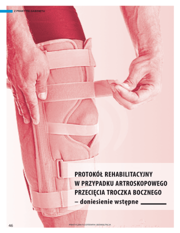 Z PRAKTYKI GABINETU Protokół rehabilitacyjny w przypadku artroskopowego przecięcia troczka bocznego – doniesienie wstępne 46 Praktyczna fizjoterapia i rehabilitacja Z PRAKTYKI GABINETU Artroskopowe przecięcie troczka bocznego jest postępowaniem chirurgicznym polegającym na przecięciu troczka bocznego w celu uwolnienia rzepki i uniknięcia powstania patologii w stawie rzepkowo-udowym. Istotny jest fakt, że tylko 10% osób z bólem przedniego przedziału stawu kolanowego wymaga interwencji chirurgicznej. Pozostały odsetek chorych (90%) udaje się wyleczyć w sposób zachowawczy. T roczek, składający się z trzech warstw, jest długim, grubym i gęstym tworem siateczkowatym, leżącym nad torebką stawową. W wyniku zwichnięcia lub bocznego przemieszczenia rzepki dochodzi do niewłaściwego rozłożenia sił na rzepkę, co w konsekwencji prowadzi do przykurczu troczka i struktur okalających od strony bocznej oraz rozciągnięciu struktur od strony przyśrodkowej. Konsekwencją złego ułożenia rzepki jest chondromalacja, niestabilność kolana i ból. Aby temu zapobiec, wykonuje się resekcję troczka bocznego metodą otwartą, artroskopową lub półzamkniętą. W 1974 r. Merchant jako pierwszy opisał zabieg uwolnienia rzepki. Obecnie najczęściej wykorzystuje się metodę artroskopową z dojścia przedniobocznego i przednioprzyśrodkowego lub górnoprzyśrodkowego. Do cięcia używa się: noża w kształcie haka, noża typu Smillie, elektrokoagulacji, lasera lub noża ultradźwiękowego. Przyjmuje się, że uwolnienie boczne jest wystarczające, kiedy podniesienie bocznego brzegu rzepki spowoduje dotknięcie do bruzdy międzykłykciowej lub kiedy można pochylić ją pod kątem 70–90º [1–3, 5–7]. Poniżej przedstawiono szczegółową klasyfikację chorób stawu rzepkowo-udowego wg Merchanta [1994]: 1. Urazy stawu rzepkowo-udowego (urazy stawu o prawidłowej budowie): ostre (stłuczenia, zwichnięcia, złamania, urazy ścięgna mięśnia czworogłowego i więzadła rzepki), powtarzające się przeciążenia (zapalenie ścięgna mięśnia czworogłowego, tendinopatia więzadła rzepki, zapalenie kaletki nadrzepkowej, choroba Osgood-Schlattera oraz Sinding-Larsen-Johanssena), odległe skutki urazów (chondromalacja rzepki, zmiany zwyrodnieniowe stawu rzepkowo-udowego, zwłóknienia ciała tłuszczowego Hoffy, nabyte niskie ustawienie rzepki, dystrofia rzepki, algodystrofia). 2. Dysplazja stawu rzepkowo-udowego: zespół nadmiernego bocznego nacisku rzepki, przewlekłe boczne podwichnięcie rzepki, nawrotowe zwichnięcie rzepki, przewlekłe zwichnięcie rzepki. 3. Idiopatyczna chondromalacja rzepki. 4. Aseptyczna martwica kostno-chrzęstna (rzepki, bruzdy międzykłykciowej). 5. Zespół fałdu błony maziowej (przyśrodkowy, boczny, nadrzepkowy). 6. Jatrogenne choroby stawu rzepkowo-udowego (zespół nadmiernego przyśrodkowego przyparcia rzepki, podwichnięcie przyśrodkowe rzepki, niskie ustawienie rzepki). Wskazaniem do przecięcia troczka bocznego są niepoddające się leczeniu zachowawczemu (trwającemu minimum 6 miesięcy) objawy ze strony przedniego przedziału stawu kolanowego oraz zwiększone napięcie troczka bocznego rzepki. Określenie jednoznacznych wska- lipiec/sierpień 2012 zań do przecięcia troczka bocznego jest trudne. Ten rodzaj zabiegu wymagany jest średnio jedynie u 10% pacjentów ze względu na wysoką skuteczność leczenia zachowawczego. Badanie kliniczne polega na przesuwaniu rzepki od przyśrodka do boku przy rozluźnionych mięśniach. Prawidłowo rzepka powinna przemieszczać się o ok. 1 cm. Nadmierne boczne przesunięcie rzepki prawdopodobnie oznacza uszkodzenie przyśrodkowego troczka, natomiast ograniczenie ruchu rzepki do przyśrodka będzie oznaczało nadmierne napięcie troczka bocznego [2]. Niewłaściwe ustawienie rzepki można podzielić na: zespół bocznego przyparcia rzepki – powierzchnie stawowe rzepki mają pełen kontakt w bruździe międzykłykciowej. Występuje boczne pochylenie rzepki powodujące chondromalację bocznego przedziału rzepki; lateralizacja rzepki – dopiero ok. 30– –90° zgięcia w stawie kolanowym dochodzi do pełnego kontaktu powierzchni stawowych rzepki z bruzdą międzykłykciową; podwichnięcie boczne rzepki – kontakt rzepki z bruzdą międzykłykciową przy kącie zgięcia w stawie kolanowym powyżej 90° lub całkowity brak kontaktu [7]. Pamiętać należy o przyczynach powodujących złe ustawienie rzepki. Trzeba zapobiegać ich pogłębianiu poprzez wdrożenie odpowiedniego postępowania, ponieważ lepiej zapobiegać przyczynom przemieszczenia rzepki, niż leczyć ich skutek. Główną przyczyną przemieszczania rzepki w kierunku bocznym jest zwiększenie sił działających z boku rzepki z równoczesnym zmniejszeniem sił po stronie przyśrodkowej. Przyczyny powodujące niewłaściwe ustawienie rzepki [8, 9] są następujące: osłabienie mięśnia czworogłowego obszernego przyśrodkowego (vastus medialis obliquus – VMO), przykurcz pasma biodrowo-piszczelowego (iliotibial band – ITB) powodujący rotację zewnętrzną piszczeli oraz przemieszczenie boczne rzepki, 47 Z PRAKTYKI GABINETU pronacja stopy powodująca wewnętrzną rotację podudzia skutkującą koślawym ustawieniem kolana; nadmierna ruchomość rzepki; urazy sportowe, błędy treningowe. Poniższy protokół rehabilitacyjny opracowany jest dla pacjentów po artroskopowym uwolnieniu troczka bocznego. Protokół podzielony jest na 4 fazy, dostosowane do potrzeb pacjenta. Ramy czasowe procesu rehabilitacji zależne są od przebiegu zabiegu chirurgicznego i klinicznej oceny stanu pacjenta. ❚ ZDJ. 1. Stretching mięśnia brzuchatego łydki ❚ ZDJ. 2. Stretching grupy tylnej mięśni uda ❚ ZDJ. 3. Kokontrakcja przykurcz mięśni grupy goleniowo-kulszowej powodujący przeciążenie aparatu wyprostnego kolana oraz zwiększenie nacisku rzepki na kość udową; przykurcz mięśnia trójgłowego łydki powodujący ustawie