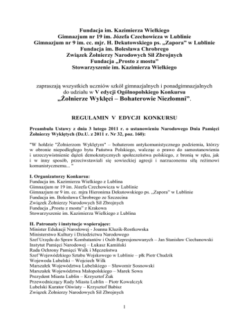 Fundacja im. Kazimierza Wielkiego Gimnazjum nr 19 im. Józefa Czechowicza w Lublinie Gimnazjum nr 9 im. cc. mjr. H. Dekutowskiego ps. „Zapora” w Lublinie Fundacja im. Bolesława Chrobrego Związek Żołnierzy Narodowych Sił Zbrojnych Fundacja „Prosto z mostu” Stowarzyszenie im. Kazimierza Wielkiego zapraszają wszystkich uczniów szkół gimnazjalnych i ponadgimnazjalnych do udziału w V edycji Ogólnopolskiego Konkursu „Żołnierze Wyklęci – Bohaterowie Niezłomni”. REGULAMIN V EDYCJI KONKURSU Preambuła Ustawy z dnia 3 lutego 2011 r. o ustanowieniu Narodowego Dnia Pamięci Żołnierzy Wyklętych (Dz.U. z 2011 r. Nr 32, poz. 160): "W hołdzie "Żołnierzom Wyklętym" – bohaterom antykomunistycznego podziemia, którzy w obronie niepodległego bytu Państwa Polskiego, walcząc o prawo do samostanowienia i urzeczywistnienie dążeń demokratycznych społeczeństwa polskiego, z bronią w ręku, jak i w inny sposób, przeciwstawiali się sowieckiej agresji i narzuconemu siłą reżimowi komunistycznemu... " I. Organizatorzy Konkursu: Fundacja im. Kazimierza Wielkiego z Lublina Gimnazjum nr 19 im. Józefa Czechowicza w Lublinie Gimnazjum nr 9 im. cc. mjra Hieronima Dekutowskiego ps. „Zapora” w Lublinie Fundacja im. Bolesława Chrobrego ze Szczecina Związek Żołnierzy Narodowych Sił Zbrojnych Fundacja „Prostu z mostu” z Krakowa Stowarzyszenie im. Kazimierza Wielkiego z Lublina II. Patronaty i instytucje wspierające: Minister Edukacji Narodowej - Joanna Kluzik-Rostkowska Ministerstwo Kultury i Dziedzictwa Narodowego Szef Urzędu do Spraw Kombatantów i Osób Represjonowanych – Jan Stanisław Ciechanowski Instytut Pamięci Narodowej – Łukasz Kamiński Rada Ochrony Pamięci Walk i Męczeństwa Szef Wojewódzkiego Sztabu Wojskowego w Lublinie – płk Piotr Chudzik Wojewoda Lubelski – Wojciech Wilk Marszałek Województwa Lubelskiego – Sławomir Sosnowski Marszałek Województwa Małopolskiego – Marek Sowa Prezydent Miasta Lublin – Krzysztof Żuk Przewodniczący Rady Miasta Lublin – Piotr Kowalczyk Lubelski Kurator Oświaty – Krzysztof Babisz Związek Żołnierzy Narodowych Sił Zbrojnych 1 Stowarzyszenie Społeczno-Kombatanckie Zrzeszenia „Wolność i Niezawisłość” NSZZ „Solidarność” Sekcja Krajowa Oświaty i Wychowania Fundacja Niepodległości Patronat medialny: TVP Historia Kwartalnik „Myśl.pl” Miesięcznik „W Sieci Historii” Portal informacyjny „Prosto z mostu” Kwartalnik naukowy „Glaukopis” III. Cele Konkursu: 1. Upamiętnienie Narodowego Dnia Pamięci Żołnierzy Wyklętych (1 marca 2016). 2. Upowszechnianie wśród uczniów gimnazjów i szkół ponadgimnazjalnych wiedzy o żołnierzach Wojska Polskiego, którzy walczyli o niepodległość Polski po II wojnie światowej. 3. Upowszechnianie wiedzy historycznej istotnej dla tożsamości narodowej, regionalnej oraz kształtowania postaw obywatelskich i patriotycznych. 4. Wdrażanie uczniów do samokształcenia, rozbudzenie zainteresowań i rozwijanie uzdolnień uczniów. 5. Kształtowanie postaw patriotycznych młodzieży poprzez propagowanie i pogłębianie wiedzy o działalności drugiej konspiracji w latach 1944-1963. 6. Kultywowanie wartości, ideałów i postaw żołnierzy Polskiego Państwa Podziemnego po II wojnie światowej. 7. Wzbogacenie wiedzy historycznej o nieznane wcześniej treści na temat Żołnierzy Wyklętych (niepublikowane wspomnienia, zdjęcia i pamiątki rodzinne). IV. Kategorie prac. Uczestnik przygotowuje pracę w jednej z podanych kategorii: 1. Praca pisemna o Żołnierzach Wyklętych (np. esej lub wspomnienia kombatanta). 2. Praca multimedialna o Żołnierzach Wyklętych. (Można wykorzystać dostępne zdjęcia, muzykę i filmy z polecanych stron internetowych pod warunkiem podania źródła.) 3. Praca plastyczna o Żołnierzach Wyklętych. Prace będą oceniane w dwóch kategoriach wiekowych: uczniowie szkół gimnazjalnych uczniowie szkół ponadgimnazjalnych V. Kryteria oceniania. 1. Poprawność merytoryczna – zgodność treści z prawdą historyczną o Żołnierzach Wyklętych, umiejscowienie postaci i wydarzeń w czasie i przestrzeni; opisanie kontekstu historycznego. 2. Oryginalność ujęcia tematu i autorefleksja. 3. Poprawność językowa. 4. Estetyka pracy. 5. Autorem pracy może być tylko jeden uczeń pracujący samodzielnie lub pod kierunkiem nauczyciela. 6. Plagiaty tekstów oraz skopiowane grafiki bez podania źródła dyskwalifikują pracę. 7. W pracy plastycznej organizator nie stawia żadnych ograniczeń w użytej technice plastycznej i wybranych środkach wyrazu. 2 VI. Parametry prac konkursowych: 1. Prace pisemne w kategorii szkół gimnazjalnych powinny zawierać 2-5 stron tekstu formatu A4. Prace pisemne w kategorii szkół ponadgimnazjalnych powinny zawierać 3-7 stron tekstu formatu A4. Tekst zasadniczy – czcionka Times New Roman, 12, odstęp 1; przypisy – czcionka Times New Roman, 10, odstęp 1. Powyższe limity nie dotyczą zdjęć i grafik. 2. Prace multimedialne: prezentacje nie mogą zawierać więcej niż 30 slajdów, a filmy nie mogą być dłuższe niż 5 min. 3. Prace plastyczne powinny być wykonane w formacie min. A3, maks. A2 techniką dowolną, pozwalającą na przesłanie pracy przesyłką pocztową. 4. Prace powinny być opatrzone na kopercie dopiskiem „Konkurs Żołnierze Wyklęci – Bohaterowie Niezłomni”. Dodatkowo każda praca musi być podpisana na wydruku papierowym albo na płycie CD albo na odwrocie pracy plastycznej w następujący sposób: autor, tytuł, klasa, szkoła, adres szkoły (z kodem pocztowym i numerem telefonu). 5. Do każdej pracy musi być obowiązkowo dołączone oświadczenie o zgodzie rodziców na przetwarzanie danych osobowych dziecka. W przypadku pełnoletnich uczestników – zgoda uczestników na przetwarzanie danych osobowych. (Wzór oświadczenia jest w załączniku do Regulaminu). VII. Przebieg Konkursu: I etap – prace konkursowe przyjmowane są w jednym 