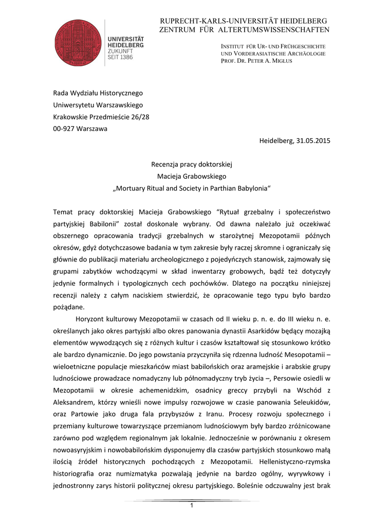 RUPRECHT-KARLS-UNIVERSITÄT HEIDELBERG ZENTRUM FÜR ALTERTUMSWISSENSCHAFTEN INSTITUT FÜR UR- UND FRÜHGESCHICHTE UND VORDERASIATISCHE ARCHÄOLOGIE PROF. DR. PETER A. MIGLUS Rada Wydziału Historycznego Uniwersytetu Warszawskiego Krakowskie Przedmieście 26/28 00-927 Warszawa Heidelberg, 31.05.2015 Recenzja pracy doktorskiej Macieja Grabowskiego „Mortuary Ritual and Society in Parthian Babylonia“ Temat pracy doktorskiej Macieja Grabowskiego “Rytuał grzebalny i społeczeństwo partyjskiej Babilonii” został doskonale wybrany. Od dawna należało już oczekiwać obszernego opracowania tradycji grzebalnych w starożytnej Mezopotamii późnych okresów, gdyż dotychczasowe badania w tym zakresie były raczej skromne i ograniczały się głównie do publikacji materiału archeologicznego z pojedyńczych stanowisk, zajmowały się grupami zabytków wchodzącymi w skład inwentarzy grobowych, bądź też dotyczyły jedynie formalnych i typologicznych cech pochówków. Dlatego na początku niniejszej recenzji należy z całym naciskiem stwierdzić, że opracowanie tego typu było bardzo pożądane. Horyzont kulturowy Mezopotamii w czasach od II wieku p. n. e. do III wieku n. e. określanych jako okres partyjski albo okres panowania dynastii Asarkidów będący mozajką elementów wywodzących się z różnych kultur i czasów kształtował się stosunkowo krótko ale bardzo dynamicznie. Do jego powstania przyczyniła się rdzenna ludność Mesopotamii – wieloetniczne populacje mieszkańców miast babilońskich oraz aramejskie i arabskie grupy ludnościowe prowadzace nomadyczny lub półnomadyczny tryb życia –, Persowie osiedli w Mezopotamii w okresie achemenidzkim, osadnicy greccy przybyli na Wschód z Aleksandrem, którzy wnieśli nowe impulsy rozwojowe w czasie panowania Seleukidów, oraz Partowie jako druga fala przybyszów z Iranu. Procesy rozwoju społecznego i przemiany kulturowe towarzyszące przemianom ludnościowym były bardzo zróżnicowane zarówno pod względem regionalnym jak lokalnie. Jednocześnie w porównaniu z okresem nowoasyryjskim i nowobabilońskim dysponujemy dla czasów partyjskich stosunkowo małą ilością źródeł historycznych pochodzących z Mezopotamii. Hellenistyczno-rzymska historiografia oraz numizmatyka pozwalają jedynie na bardzo ogólny, wyrywkowy i jednostronny zarys historii politycznej okresu partyjskiego. Boleśnie odczuwalny jest brak 1 archiwów administracyjnych i prywatnych, które pomogłyby lepiej zrozumieć ówczesny system społeczny. Odpowiedź na pytanie, w jaki sposób kształtował się rozwój wieloetnicznego, a nawet można powiedzieć wielonarodowego społeczeństwa w państwie Arsakidów z jego rozmaitymi korzeniami kulturowymi jest możliwa jedynie w drodze badań materiału archeologicznego z dużych stanowisk o zdecydowanym charakterze. Jednym ze sposobów badawczych jest analiza pochówków z tego okresu, pozostałosci cmentarzysk i grobów w osadach miejskich, umożliwiająca obserwację rozwoju złożonych tradycji kulturowych w południowej Mezopotamii. Jest to droga, którą obrał Wojciech Grabowski w tezie swojej pracy doktorskiej. Jego wysiłek zasługuje na wysoką ocene i recenzent na dalszych stronach zwraca przede wszystkim uwagę na kilka punktów, które jego zdaniem wymagają dyskusji. Omawiana praca doktorska składa się z trzech części — tekst, tablice z ilustracjami i katalog grobów — i wraz z bibliografią obejmuje ok. 500 stron. Na wstępie określony jest temat oraz ramy czasowe i geograficzne przeprowadzonych badań. Autor kreśli granice Babilonii od Zatoki Perskiej na południu do ujścia Małego Zabu na północy. Jest to oczywiście sprawa definicji co autor słusznie podkreśla cytując rozmaite opinie antycznych historyków w tej sprawie. Dlatego stwierdzenie “The extent of Babylonia in Parthian times is unclear both in geographical sense” (str. 3) jest w gruncie rzeczy zbędne. Biorąc pod uwagę średnią sytuację z dwóch tysiącleci recenzent jest zdania, że zarówno w kategoriach politycznych jak i kulturowych Babilonia sięgała na północ nie dalej jak do środkowego biegu rzeki Dijali w środkowej Mezopotamii. Badanie opiera się zasadniczo na trzech stanowiskach archeologicznych, które w rozmaity sposób reprezentują tradycje mezopotamskich obrządków grzebalnych: Babylon jako miejsce kontynuacji dziedzictwa staromezopotamskiego sięgającego do okresu brązu i związanego z silnie rozwinietą kulturą miejską, Seleukia nach Tygrysem, reprezentująca wpływy hellenistyczne oraz kompleks Coche/Veh-Adashir/Ktezyfon będący nowym partyjskim centrum politycznym i administracyjnym w południowej Mezopotamii. Przedstawienie odnośnego materiału z tych trzech stanowisk oraz wyjaśnienie ich specyfiki obejmuje w pracy około stu stron. Prezentacja jest bardzo precyzyjna i dobrze wyważona, tak że czytelnik szybko zostaje wprowadzony w problematykę badań i otrzymuje niezbędne informacje dotyczące materiału źródłowego. Jednym z zadań, które stawia sobie autor, są również porównania międzyregionalne mające ułatwić zrozumienie zróżnicowania kulturowego Mezopotamii. W kolejnych rozdziałach są komentowane dodatkowo znaleziska z Nippur i Uruk w Babilonii oraz z innych stanowisk na północy, dzięki czemu powstaje ogólne tło dla zasadniczego tematu. W pierwszej części pracy omówione są szczegółowo typy pochówków na wymienionych stanowiskach, inventarze grobowe, kontekst archeologiczny ze szczególnym 2 uwzględnieniem stratygrafii i datowania. Autor stara się dogłębnie prześledzić zróżnicowanie tradycji grzebalnych na obszarze Babilonii i określić ich znaczenie. Szczególne akcenty dotyczą dynamiki zmian obrządków obserwowane na podstawie różnic formalnych w pochówkach, w wyposażenu grobów oraz w ich lokalizacji. Niewątpliwie odzwierciedla się w tym materiale niezwykle heterogeniczny charakter kultury okresu partyjskiego i to w
