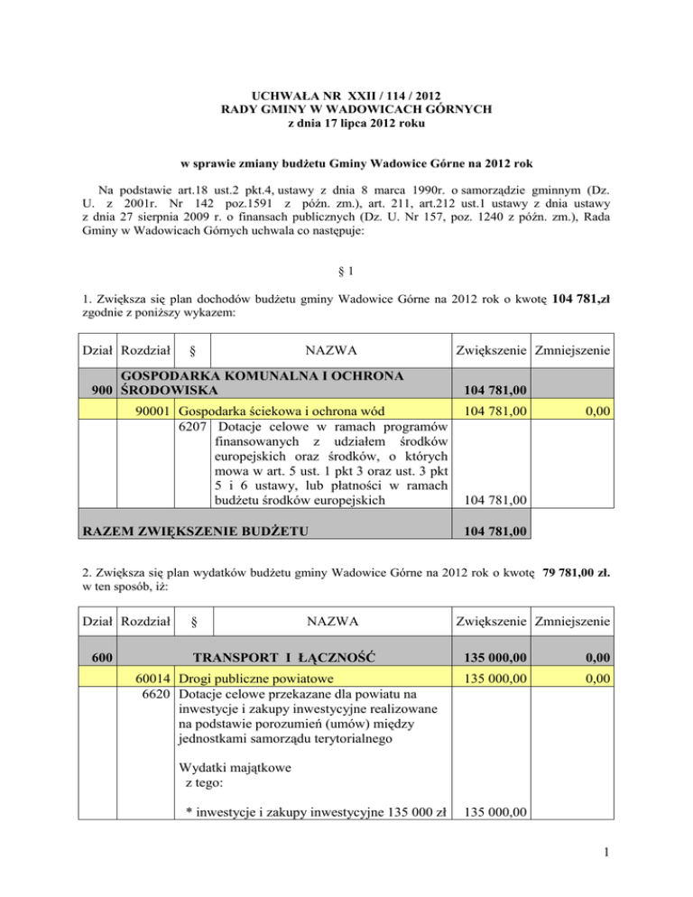 UCHWAŁA NR XXII / 114 / 2012 RADY GMINY W WADOWICACH GÓRNYCH z dnia 17 lipca 2012 roku w sprawie zmiany budżetu Gminy Wadowice Górne na 2012 rok Na podstawie art.18 ust.2 pkt.4, ustawy z dnia 8 marca 1990r. o samorządzie gminnym (Dz. U. z 2001r. Nr 142 poz.1591 z późn. zm.), art. 211, art.212 ust.1 ustawy z dnia ustawy z dnia 27 sierpnia 2009 r. o finansach publicznych (Dz. U. Nr 157, poz. 1240 z późn. zm.), Rada Gminy w Wadowicach Górnych uchwala co następuje: §1 1. Zwiększa się plan dochodów budżetu gminy Wadowice Górne na 2012 rok o kwotę 104 781,zł zgodnie z poniższy wykazem: Dział Rozdział § NAZWA GOSPODARKA KOMUNALNA I OCHRONA 900 ŚRODOWISKA 90001 Gospodarka ściekowa i ochrona wód 6207 Dotacje celowe w ramach programów finansowanych z udziałem środków europejskich oraz środków, o których mowa w art. 5 ust. 1 pkt 3 oraz ust. 3 pkt 5 i 6 ustawy, lub płatności w ramach budżetu środków europejskich RAZEM ZWIĘKSZENIE BUDŻETU Zwiększenie Zmniejszenie 104 781,00 104 781,00 0,00 104 781,00 104 781,00 2. Zwiększa się plan wydatków budżetu gminy Wadowice Górne na 2012 rok o kwotę 79 781,00 zł. w ten sposób, iż: Dział Rozdział 600 § NAZWA Zwiększenie Zmniejszenie TRANSPORT I ŁĄCZNOŚĆ 135 000,00 0,00 60014 Drogi publiczne powiatowe 6620 Dotacje celowe przekazane dla powiatu na inwestycje i zakupy inwestycyjne realizowane na podstawie porozumień (umów) między jednostkami samorządu terytorialnego 135 000,00 0,00 Wydatki majątkowe z tego: * inwestycje i zakupy inwestycyjne 135 000 zł 135 000,00 1 * Pomoc finansowa w formie dotacji celowej dla Powiatu Mieleckiego z przeznaczeniem na dofinansowanie budowy chodnika w ciągu drogi powiatowej Nr 1 160 R Borki – Zabrnie – Piątkowiec w miejscowości Wadowice Górne – 15.000 zł * Pomoc finansowa w formie dotacji celowej dla Powiatu Mieleckiego z przeznaczeniem na dofinansowanie budowy chodnika w ciągu drogi powiatowej Nr 1 154 R Breń Osuchowski – Kawęczyn – Wadowice Górne w miejscowości Przebendów – 40 000 zł * Pomoc finansowa w formie dotacji celowej dla Powiatu Mieleckiego z przeznaczeniem na dofinansowanie budowy chodnika w ciągu drogi powiatowej Nr 1 166 R Partynia - Jamy w miejscowości Jamy – 20 000 zł * Pomoc finansowa w formie dotacji celowej dla Powiatu Mieleckiego z przeznaczeniem na dofinansowanie budowy chodnika w ciągu drogi powiatowej Nr 1 163 R Zgórsko – Wola Wadowska w miejscowości Izbiska – 20 000 zł * Pomoc finansowa w formie dotacji celowej dla Powiatu Mieleckiego z przeznaczeniem na dofinansowanie budowy chodnika w ciągu drogi powiatowej Nr 1 160 R Borki-Zabrnie Piątkowiec w miejscowości Zabrnie – 20 000 zł * Pomoc finansowa w formie dotacji celowej dla Powiatu Mieleckiego z przeznaczeniem na dofinansowanie budowy chodnika w ciągu drogi powiatowej Nr 1 159 R Wadowice Dolne - Budzyń w miejscowości Wadowice Dolne 20.000 zł 700 GOSPODARKA MIESZKANIOWA 70005 Gospodarka gruntami i nieruchomościami 4260 Zakup energii DZIAŁALNOŚĆ USŁUGOWA 710 71004 754 Plany zagospodarowania przestrzennego 2 000,00 0,00 2 000,00 2 000,00 11 000,00 11 000,00 4300 Zakup usług pozostałych 11 000,00 BEZPIECZEŃSTWO PUBLICZNE I OCHRONA PRZECIWPOŻAROWA Ochotnicze straże pożarne 75412 18 000,00 4270 Zakup usług remontowych 4 000,00 18 000,00 2 6050 Wydatki inwestycyjne jednostek budżetowych * Modernizacja budynku OSP w Jamach 801 OŚWIATA I WYCHOWANIE 80101 Szkoły podstawowe Zakup energii 4260 Oddziały przedszkolne w szkołach 80103 podstawowych 0,00 3 296,00 0,00 3 296,00 9 500,00 3 500,00 4010 Wynagrodzenia osobowe pracowników 6 000,00 4170 Wynagrodzenia bezosobowe POMOC SPOŁECZNA 85219 Ośrodki Pomocy społecznej 921 13 146,00 Wydatki osobowe nie niezaliczane do 3020 wynagrodzeń 80195 Pozostała działalność 852 14 000,00 350,00 350,00 2,00 2,00 2,00 2,00 4017 Wynagrodzenia osobowe pracowników 1,00 4019 Wynagrodzenia osobowe pracowników 1,00 4047 Dodatkowe wynagrodzenie roczne 1,00 4049 Dodatkowe wynagrodzenie roczne 1,00 KULTURA I OCHRONA DZIEDZICTWA NARODOWEGO 92195 Pozostała działalność 4270 Zakup usług remontowych 6050 Wydatki inwestycyjne jednostek budżetowych 10 500,00 5 500,00 10 500,00 5 500,00 10 500,00 * Wykonanie wewnętrznej instalacji gazowej w Domu Ludowym w Zabrniu 5 500 zł 926 0,00 KULTURA FIZYCZNA 92601 Obiekty sportowe 4170 Wynagrodzenia bezosobowe 4300 Zakup usług pozostałych 5 500,00 16 000,00 120 365,00 16 000,00 120 365,00 5 000,00 5 000,00 3 6050 Wydatki inwestycyjne jednostek budżetowych * "Budowa Trybun na stadionie gminnym w Wadowicach Górnych " 11 000 zł 6057 Wydatki inwestycyjne jednostek budżetowych 11 000,00 * wydatki na programy finansowane z udziałem środków, o których mowa w art. 5 ust. 1 pkt 2 i 3 ustawy o finansach publicznych, w części związanej z realizacją zadań jednostki samorządu terytorialnego * Zmniejszenie Wydatków na zadanie pod nazwą " Budowa trybun na stadionie gminnym w Wadowicach Górnych " 11 000 zł - środki pochodzące z programu Lider + 6059 Wydatki inwestycyjne jednostek budżetowych * Budowa budynku szatniowo – sanitarnego przy kompleksie sportowym „Moje boisko – ORLIK 2012” – 79 365 zł * Zmniejszenie Wydatków na zadanie pod nazwą "Budowa trybun na stadionie gminnym w Wadowicach Górnych " 25 000 zł - środki własne do programu Lider + 11 000,00 104 365,00 79 365,00 25 000,00 wydatki na programy finansowane z udziałem środków, o których mowa w art. 5 ust. 1 pkt 2 i 3 ustawy o finansach publicznych, w części związanej z realizacją zadań jednostki samorządu terytorialnego OGÓŁEM RAZEM ZWIĘKSZENIE BUDŻETU 205 648,00 125 867,00 79 781,00 3. Zwiększa się rozchody budżetu gminy Wadowice Górne o kwotę 25 000,00 zł do kwoty 2 650 000,00 zł z przeznaczeniem na ustalenie limitu do jakiego Wójt Gminy Wadowice Górne może udzielać z budżetu Gminy pożyczek. 4. Różnica pomiędzy dochodami i wydatkami w kwocie 519 149 zł. stanowi