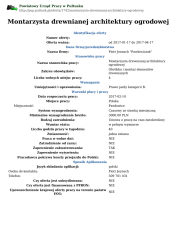 Powiatowy Urząd Pracy w Pułtusku http://pup.pultusk.pl/oferta/1742/montarzysta-drewnianej-architektury-ogrodowej Montarzysta drewnianej architektury ogrodowej Identyfikacja oferty Numer oferty: Oferta ważna: od 2017-01-17 do 2017-04-17 Dane firmy/przedsiębiorstwa Nazwa firmy: Piotr Jeznach "Pawlowiczak" Stanowisko pracy Montarzysta drewnianej architektury ogrodowej Nazwa stanowiska pracy: Obróbka i montaż elementów drewnianych Zakres obowiązków: Liczba wolnych miejsc pracy: 4 Wymagania Umiejętności i uprawnienia: Prawo jazdy kategorii B. Warunki płacy i pracy Data rozpoczęcia pracy: Miejsce pracy: 2017-02-10 Polska Miejscowość: Pawłowice System wynagrodzenia: Minimalne wynagrodzenie brutto: Rodzaj zatrudnienia: Wymiar etatu: Czasowy ze stawką miesięczną 3000.00 PLN Umowa o pracę na czas nieokreślony w pełnym wymiarze Liczba godzin pracy w tygodniu: Zmianowość: 40 jedna zmiana Praca w wolne dni: NIE Zatrudnienie od zaraz: NIE Zapewnienie zakwaterowania: TAK Zapewnienie wyżywienia: NIE Pracodawca pokrywa koszty przejazdu do Polski: NIE Sposób Aplikowania Język składania aplikacji: polski Osoba do kontaktu: Piotr Jeznach Telefon: 509 701 031 Czy oferta jest subsydiowana: NIE Czy oferta jest finansowana z PFRON: NIE Upowszechnienie krajowej oferty pracy na terenie państw NIE EOG: