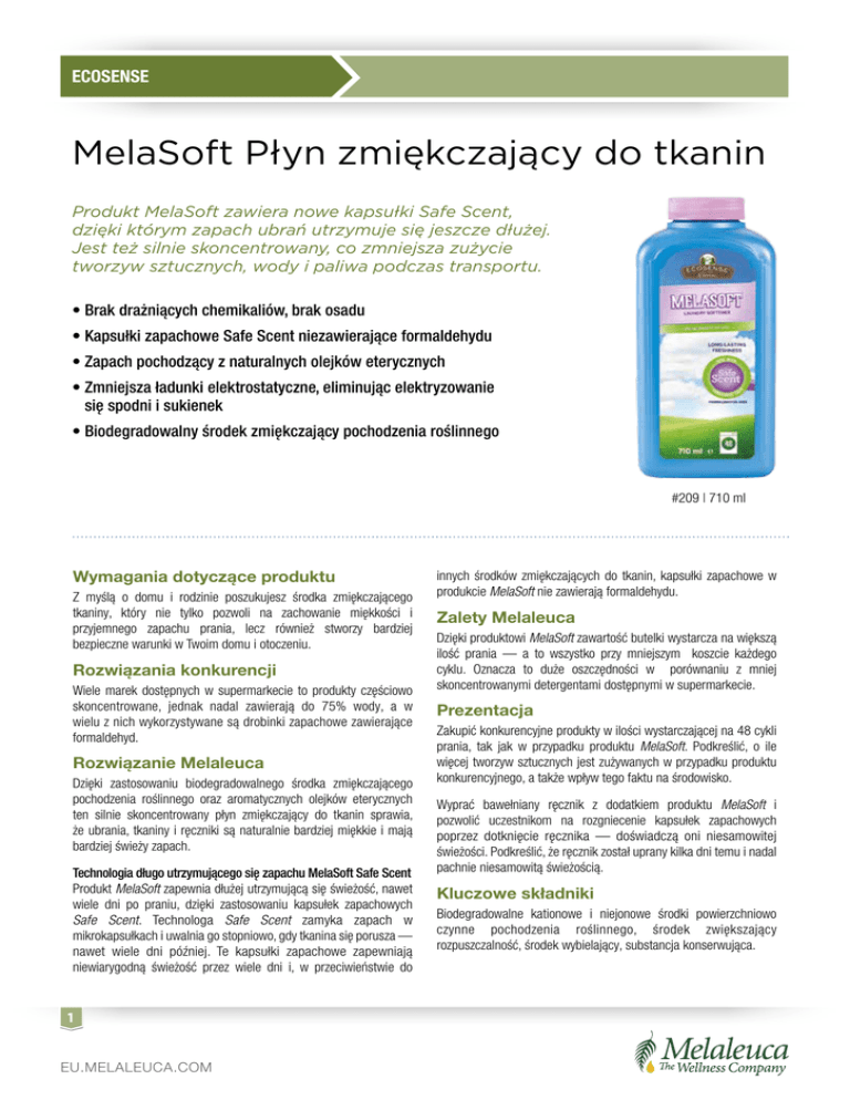 ECOSENSE MelaSoft Płyn zmiękczający do tkanin Produkt MelaSoft zawiera nowe kapsułki Safe Scent, dzięki którym zapach ubrań utrzymuje się jeszcze dłużej. Jest też silnie skoncentrowany, co zmniejsza zużycie tworzyw sztucznych, wody i paliwa podczas transportu. • Brak drażniących chemikaliów, brak osadu • Kapsułki zapachowe Safe Scent niezawierające formaldehydu • Zapach pochodzący z naturalnych olejków eterycznych • Zmniejsza ładunki elektrostatyczne, eliminując elektryzowanie się spodni i sukienek • Biodegradowalny środek zmiękczający pochodzenia roślinnego #209 | 710 ml Wymagania dotyczące produktu Z myślą o domu i rodzinie poszukujesz środka zmiękczającego tkaniny, który nie tylko pozwoli na zachowanie miękkości i przyjemnego zapachu prania, lecz również stworzy bardziej bezpieczne warunki w Twoim domu i otoczeniu. Rozwiązania konkurencji Wiele marek dostępnych w supermarkecie to produkty częściowo skoncentrowane, jednak nadal zawierają do 75% wody, a w wielu z nich wykorzystywane są drobinki zapachowe zawierające formaldehyd. Rozwiązanie Melaleuca Dzięki zastosowaniu biodegradowalnego środka zmiękczającego pochodzenia roślinnego oraz aromatycznych olejków eterycznych ten silnie skoncentrowany płyn zmiękczający do tkanin sprawia, że ubrania, tkaniny i ręczniki są naturalnie bardziej miękkie i mają bardziej świeży zapach. Technologia długo utrzymującego się zapachu MelaSoft Safe Scent Produkt MelaSoft zapewnia dłużej utrzymującą się świeżość, nawet wiele dni po praniu, dzięki zastosowaniu kapsułek zapachowych Safe Scent. Technologa Safe Scent zamyka zapach w mikrokapsułkach i uwalnia go stopniowo, gdy tkanina się porusza — nawet wiele dni później. Te kapsułki zapachowe zapewniają niewiarygodną świeżość przez wiele dni i, w przeciwieństwie do 1 EU.MELALEUCA.COM innych środków zmiękczających do tkanin, kapsułki zapachowe w produkcie MelaSoft nie zawierają formaldehydu. Zalety Melaleuca Dzięki produktowi MelaSoft zawartość butelki wystarcza na większą ilość prania — a to wszystko przy mniejszym koszcie każdego cyklu. Oznacza to duże oszczędności w porównaniu z mniej skoncentrowanymi detergentami dostępnymi w supermarkecie. Prezentacja Zakupić konkurencyjne produkty w ilości wystarczającej na 48 cykli prania, tak jak w przypadku produktu MelaSoft. Podkreślić, o ile więcej tworzyw sztucznych jest zużywanych w przypadku produktu konkurencyjnego, a także wpływ tego faktu na środowisko. Wyprać bawełniany ręcznik z dodatkiem produktu MelaSoft i pozwolić uczestnikom na rozgniecenie kapsułek zapachowych poprzez dotknięcie ręcznika — doświadczą oni niesamowitej świeżości. Podkreślić, że ręcznik został uprany kilka dni temu i nadal pachnie niesamowitą świeżością. Kluczowe składniki Biodegradowalne kationowe i niejonowe środki powierzchniowo czynne pochodzenia roślinnego, środek zwiększający rozpuszczalność, środek wybielający, substancja konserwująca. Sposób użycia Doświadczenia klientów W celu uzyskania efektu zmiękczenia tkanin dodać 15 ml podczas ostatniego cyklu płukania. W celu uzyskania dodatkowego efektu zmiękczenia dodać 30 ml podczas ostatniego cyklu płukania. Nie wlewać bezpośrednio na tkaninę. „Trudno mi sobie wyobrazić, jak mogłam sobie radzić bez produktu MelaSoft. Chociaż nie można dostrzec kapsułek Safe Scent, ich działanie jest zdecydowanie zauważalne! Moje ubrania pachną niewiarygodną świeżością, nawet wiele dni po praniu, a do tego są niebywale miękkie. Uwielbiam to!“ Produkty uzupełniające Pompka wielokrotnego użytku, lejek do butelki, MelaPower, MelaBrite, PreSpot, Sol-U-Mel Melanie K., Niemcy NAJCZĘŚCIEJ ZADAWANE PYTANIA Na czym polega technologia Safe Scent? Dzięki zaawansowanej technologii Safe Scent zapach jest zamknięty w mikrokapsułkach zapachowych niezawierających formaldehydu. Jak działają kapsułki Safe Scent? Kapsułki zapachowe z czasem stopniowo pękają i uwalniają zapach, szczególnie podczas ruchu lub tarcia, zapewniając świeżość przez wiele dni po praniu. 2 Melaleuca of Europe (Germany) GmbH · Hessenring 13a · 64546 Mörfelden-Walldorf Germany/Duitsland/Deutschland/Niemcy/Németország/Německo + 49 (0) 6105 980 2800 · + 49 (0) 6105 980 2402 · Freephone number for your country eu.melaleuca.com · 10/15 · Subject to change. Jaką ilość produktu MelaSoft należy używać? Wystarczy dodać jedną porcję z pompki produktu MelaSoft bezpośrednio do pralki podczas ostatniego cyklu płukania.