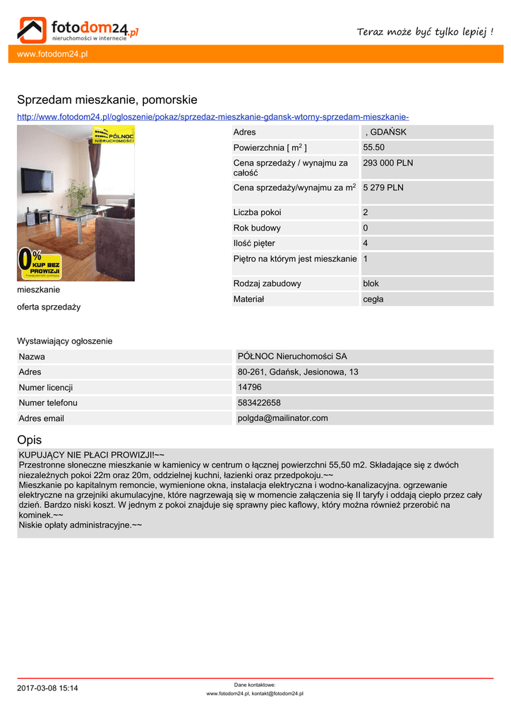 Teraz może być tylko lepiej ! www.fotodom24.pl Sprzedam mieszkanie, pomorskie http://www.fotodom24.pl/ogloszenie/pokaz/sprzedaz-mieszkanie-gdansk-wtorny-sprzedam-mieszkanieAdres , GDAŃSK Powierzchnia [ m2 ] 55.50 Cena sprzedaży / wynajmu za całość 293 000 PLN Cena sprzedaży/wynajmu za m2 5 279 PLN Liczba pokoi 2 Rok budowy 0 Ilość pięter 4 Piętro na którym jest mieszkanie 1 mieszkanie oferta sprzedaży Rodzaj zabudowy blok Materiał cegła Wystawiający ogłoszenie Nazwa PÓŁNOC Nieruchomości SA Adres 80-261, Gdańsk, Jesionowa, 13 Numer licencji 14796 Numer telefonu 583422658 Adres email [email protected] Opis KUPUJĄCY NIE PŁACI PROWIZJI!~~ Przestronne słoneczne mieszkanie w kamienicy w centrum o łącznej powierzchni 55,50 m2. Składające się z dwóch niezależnych pokoi 22m oraz 20m, oddzielnej kuchni, łazienki oraz przedpokoju.~~ Mieszkanie po kapitalnym remoncie, wymienione okna, instalacja elektryczna i wodno-kanalizacyjna. ogrzewanie elektryczne na grzejniki akumulacyjne, które nagrzewają się w momencie załączenia się II taryfy i oddają ciepło przez cały dzień. Bardzo niski koszt. W jednym z pokoi znajduje się sprawny piec kaflowy, który można również przerobić na kominek.~~ Niskie opłaty administracyjne.~~ 2017-03-08 15:14 Dane kontaktowe: www.fotodom24.pl, [email protected]