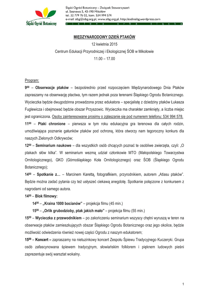 MIĘDZYNARODOWY DZIEŃ PTAKÓW 12 kwietnia 2015 Centrum Edukacji Przyrodniczej i Ekologicznej ŚOB w Mikołowie 11.00 – 17.00 Program: 900 – Obserwacje ptaków – bezpośrednio przed rozpoczęciem Międzynarodowego Dnia Ptaków zapraszamy na obserwację ptactwa, tym razem jednak poza terenami Śląskiego Ogrodu Botanicznego. Wycieczka będzie dwugodzinna prowadzona przez edukatora – specjalistę z dziedziny ptaków Łukasza Fuglewicza i obejmować będzie obszar Przyszowic. Wycieczka ma charakter zamknięty, a liczba miejsc jest ograniczona. Osoby zainteresowane prosimy o zgłaszanie się pod numerem telefonu: 534 994 578. 1100 – Ptaki chronione – pierwsza w tym roku edukacyjna gra terenowa dla całych rodzin, umożliwiająca poznanie gatunków ptaków pod ochroną, która otworzy nam tegoroczny konkurs dla naszych Zielonych Odkrywców; 1200 – Seminarium naukowe – dla wszystkich osób chcących poznać te osobliwe zwierzęta, czyli: „O ptakach słów kilka”. W seminarium wezmą udział członkowie MTO (Małopolskiego Towarzystwa Ornitologicznego), GKO (Górnośląskiego Koła Ornitologicznego) oraz ŚOB (Śląskiego Ogrodu Botanicznego); 1400 – Spotkanie z… – Marcinem Karettą, fotografikiem, przyrodnikiem, autorem „Atlasu ptaków”. Będzie można zadać pytania czy też usłyszeć ciekawą anegdotę. Spotkanie połączone z konkursem z nagrodami od samego autora. 1400 – Blok filmowy: 1400 – „Kraina 1000 bocianów” – projekcja filmu (45 min.) 1500 – „Orlik grubodzioby, ptak jakich mało” – projekcja filmu (55 min.) 1500 – Wycieczka z przewodnikiem – po zakończeniu seminarium wszyscy chętni wyruszą w teren na obserwacje ptaków zamieszkujących obszar Śląskiego Ogrodu Botanicznego oraz jego okolice, będzie możliwość odwiedzenia również nowej części Ogrodu z naszym edukatorem; 1500 – Koncert – zapraszamy na nietuzinkowy koncert Zespołu Śpiewu Tradycyjnego Kuczeryki. Grupa osób zafascynowana śpiewem tradycyjnym, słowiańskim folklorem i pięknem ludowych pieśni zaprezentuje swój warsztat wokalny. 1 Ponadto: EkoBazar – podczas całego święta, na parkingu pod Sośnią Górą, będzie okazja zakupu artykułów spożywczych z odpowiednimi certyfikatami, m.in. pieczywo, warzywa, owoce, nabiał, wędliny itp.; Wystawa – plenerowa wystawa fotograficzna Stanisława Roszkowskiego „Ogrody Japonii”; Kiermasz – na głównym dziedzińcu będzie odbywał się kiermasz ekologicznych produktów spożywczych oraz rękodzieła, na którym będzie można również kupić gotowe budki lęgowe; Kawiarenka – na dziedzińcu w specjalnie zorganizowanej kawiarence będzie można zjeść domowy obiad, posilić się tradycyjnym śląskim kołoczem i napić wybornej kawy; Kącik zabaw edukacyjnych – w nowej odsłonie! Zapraszamy do całkiem nowego Kącika Zabaw dla najmłodszych, gdzie czekać będą na nich ekologiczne zabawki z certyfikatem; Kącik kreatywny – figurki gipsowe, kolorowanki o tematyce przyrodniczej, rebusy i wiele innych; Warsztaty edukacyjne – zajęcia edukacyjno-przyrodnicze dla starszych dzieci polegające na zajęciach manualnych z wykorzystaniem naturalnych technik tworzenia; Konkurs z nagrodami – otwarcie długoterminowego konkursu pn. „Zieloni Odkrywcy” (informacje o konkursie w punkcie gry terenowej oraz na stronie internetowej www.obmikolow.robia.pl). CZEKAMY NA GOŚCI RÓWNIEŻ W RAZIE NIEPOGODY!!! Kontakt: Kierownik Pracowni Śląski Kalendarz Ekologiczny Marzena Osmalak e-mail: [email protected] tel. 534 994 578 2