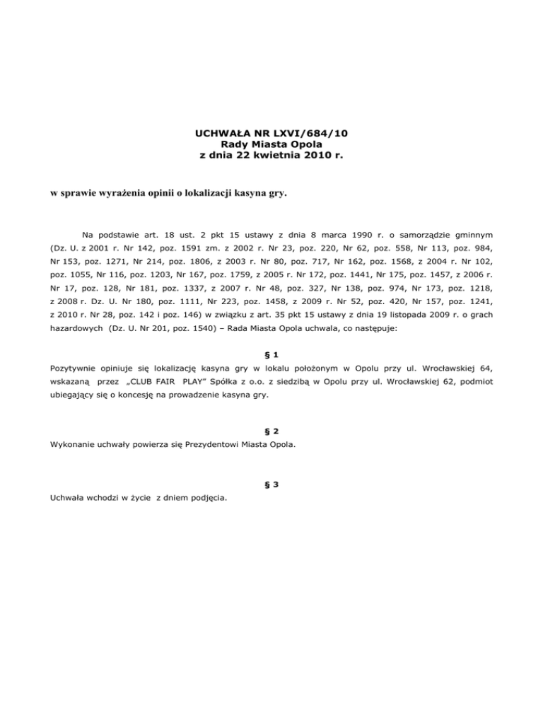 UCHWAŁA NR LXVI/684/10 Rady Miasta Opola z dnia 22 kwietnia 2010 r. w sprawie wyraŜenia opinii o lokalizacji kasyna gry. Na podstawie art. 18 ust. 2 pkt 15 ustawy z dnia 8 marca 1990 r. o samorządzie gminnym (Dz. U. z 2001 r. Nr 142, poz. 1591 zm. z 2002 r. Nr 23, poz. 220, Nr 62, poz. 558, Nr 113, poz. 984, Nr 153, poz. 1271, Nr 214, poz. 1806, z 2003 r. Nr 80, poz. 717, Nr 162, poz. 1568, z 2004 r. Nr 102, poz. 1055, Nr 116, poz. 1203, Nr 167, poz. 1759, z 2005 r. Nr 172, poz. 1441, Nr 175, poz. 1457, z 2006 r. Nr 17, poz. 128, Nr 181, poz. 1337, z 2007 r. Nr 48, poz. 327, Nr 138, poz. 974, Nr 173, poz. 1218, z 2008 r. Dz. U. Nr 180, poz. 1111, Nr 223, poz. 1458, z 2009 r. Nr 52, poz. 420, Nr 157, poz. 1241, z 2010 r. Nr 28, poz. 142 i poz. 146) w związku z art. 35 pkt 15 ustawy z dnia 19 listopada 2009 r. o grach hazardowych (Dz. U. Nr 201, poz. 1540) – Rada Miasta Opola uchwala, co następuje: §1 Pozytywnie opiniuje się lokalizację kasyna gry w lokalu połoŜonym w Opolu przy ul. Wrocławskiej 64, wskazaną przez „CLUB FAIR PLAY” Spółka z o.o. z siedzibą w Opolu przy ul. Wrocławskiej 62, podmiot ubiegający się o koncesję na prowadzenie kasyna gry. §2 Wykonanie uchwały powierza się Prezydentowi Miasta Opola. §3 Uchwała wchodzi w Ŝycie z dniem podjęcia.