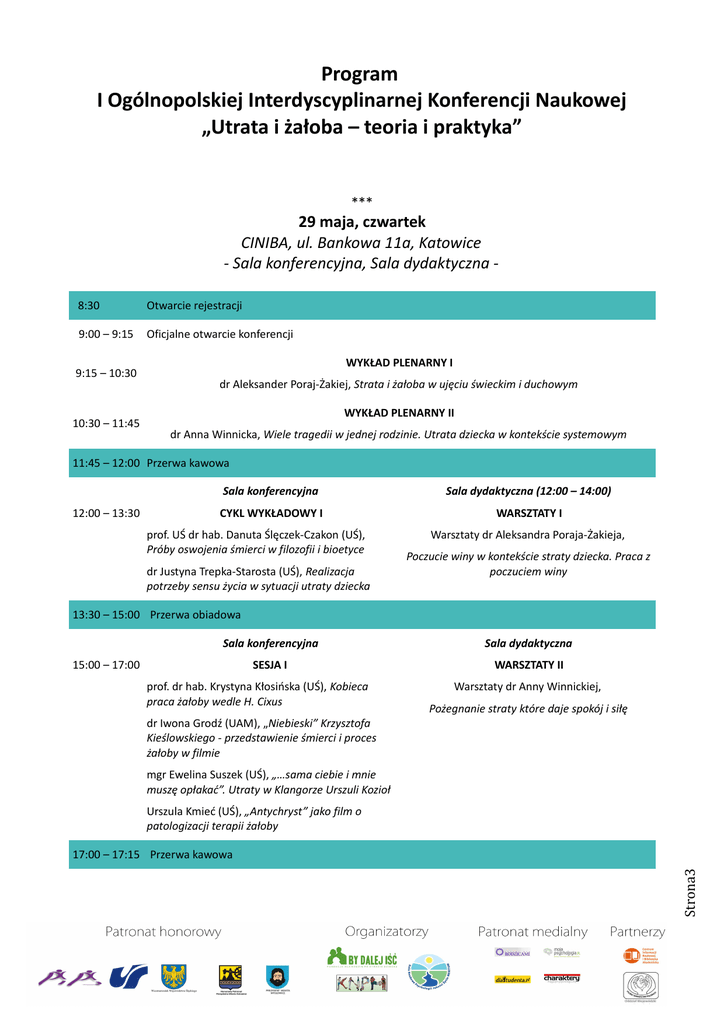 Program I Ogólnopolskiej Interdyscyplinarnej Konferencji Naukowej „Utrata i żałoba – teoria i praktyka” *** 29 maja, czwartek CINIBA, ul. Bankowa 11a, Katowice - Sala konferencyjna, Sala dydaktyczna 8:30 Otwarcie rejestracji 9:00 – 9:15 Oficjalne otwarcie konferencji 9:15 – 10:30 10:30 – 11:45 WYKŁAD PLENARNY I dr Aleksander Poraj-Żakiej, Strata i żałoba w ujęciu świeckim i duchowym WYKŁAD PLENARNY II dr Anna Winnicka, Wiele tragedii w jednej rodzinie. Utrata dziecka w kontekście systemowym 11:45 – 12:00 Przerwa kawowa 12:00 – 13:30 Sala konferencyjna Sala dydaktyczna (12:00 – 14:00) CYKL WYKŁADOWY I WARSZTATY I prof. UŚ dr hab. Danuta Ślęczek-Czakon (UŚ), Próby oswojenia śmierci w filozofii i bioetyce dr Justyna Trepka-Starosta (UŚ), Realizacja potrzeby sensu życia w sytuacji utraty dziecka Warsztaty dr Aleksandra Poraja-Żakieja, Poczucie winy w kontekście straty dziecka. Praca z poczuciem winy 13:30 – 15:00 Przerwa obiadowa Sala konferencyjna Sala dydaktyczna SESJA I WARSZTATY II 15:00 – 17:00 prof. dr hab. Krystyna Kłosińska (UŚ), Kobieca praca żałoby wedle H. Cixus dr Iwona Grodź (UAM), „Niebieski” Krzysztofa Kieślowskiego - przedstawienie śmierci i proces żałoby w filmie Warsztaty dr Anny Winnickiej, Pożegnanie straty które daje spokój i siłę mgr Ewelina Suszek (UŚ), „…sama ciebie i mnie muszę opłakać”. Utraty w Klangorze Urszuli Kozioł Urszula Kmieć (UŚ), „Antychryst” jako film o patologizacji terapii żałoby Strona3 17:00 – 17:15 Przerwa kawowa 17:15 – 19:15 Sala konferencyjna Sala dydaktyczna SESJA II SESJA III dr Renata Kleszcz-Szczyrba (UŚ), Czy każdej utracie potrzebna jest żałoba i czy każdej żałobie potrzebna jest terapia? dr Małgorzata Okupnik (AM, Poznań), Doświadczenie utraty w perspektywie fenomenologii mgr Ewelina Sitarska, mgr Joanna Dreżewska (Polskie Towarzystwo Psychoterapii Humanistyczno-Egzystencjalnej), Patologiczne przeżywanie żałoby u osób o typie osobowości zależnej - studium przypadku mgr Bogusław Olszewski (UWr), Misterium śmierci w psychologii transpersonalnej – substancje psychoaktywne a współczesna tanatologia mgr Joanna Majewska (UW), Wczesne poronienie z perspektywy kobiety mgr Aleksandra Sokalska-Bennett (UAM), Dyskursywne strategie radzenia sobie ze stratą w Internecie *** 30 maja, piątek CINIBA, ul. Bankowa 11a, Katowice - Sala konferencyjna 8:30 Otwarcie rejestracji 9:00 – 11:15 CYKL WYKŁADOWY II dr Renata Kleszcz-Szczyrba (UŚ), "Ciche straty" - radzenie sobie ze stratami prenatalnymi i perinatalnymi jako wyzwanie naszych czasów? mgr Izabela Barton-Smoczyńska, Jak pomagać, aby pomóc? Osoby pomagające w procesie radzenia sobie ze stratą i po stracie – zespół terapeutyczny czy suma jednostek pomagających mgr Anna Stachulska (Polskie Towarzystwo Położnych), Rola położnej w udzielaniu wsparcia kobiecie po stracie dziecka w okresie ciąży i porodu 11:15 – 11:30 Przerwa kawowa 11:30 – 12:30 SESJA POSTEROWA dr Agnieszka Lasota, dr Elżbieta Anita Bajcar (UP, Kraków), Wiedza, postawy i kompetencje osób wspierających dziecko w sytuacji utraty Katarzyna Konczelska (UŚ), Grupy wsparcia a żałoba po stracie dziecka – wnioski z badań własnych Jagoda Sikora (UŚ), Praca terapeutyczna z dzieckiem w traumatycznej żałobie Jolanta Czernicka-Siwecka (Fundacja ISKIERKA), Poradnik dla rodziców po stracie dziecka. Nadzieja jest rzeczą z piórami Daria Kałduńska, Agata Bucka, Katarzyna Świątkiewicz (UŚ), Psychologiczne konsekwencje utraty dziecka poprzez poronienie i w wyniku aborcji. Wskazówki do interwencji kryzysowej Katarzyna Czempik (UŚ) Jak ukoić ból dziecka? Rozmowa i forma pracy z dzieckiem w żałobie Strona3 12:30 – 14:00 Przerwa obiadowa SESJA IV 14:00 – 16:00 Ks. dr hab. Antoni Bartoszek (UŚ), Duchowe towarzyszenie rodzicom w terminalnej fazie choroby dziecka i w okresie żałoby dr Małgorzata Gnyś-Nidecka, Interdyscyplinarność afektu w poezji funeralnej i sztuce sepulkralnej na nagrobkach i w epitafiach dziecięcych na przestrzeni XVI-XXI ww. dr Anna Długozima (SGGW), Cmentarze jako przestrzenie terapeutyczne mgr Agnieszka Wloka (UŚ), Religijność i duchowość jako czynniki znaczące w przeżywaniu śmierci dziecka 16:00 – 16:15 Przerwa kawowa 16:15 – 18:15 SESJA V dr Anita Gałuszka (UŚ), Blisko, coraz bliżej... Psychologiczne aspekty umierania i śmierci dr Urszula Tokarczyk-Bar (UAM), Rodzeństwo osierocone w wyniku ciężkiej (przewlekłej/ śmiertelnej) choroby dr Bernardetta Janusz (UJ), Koncepcja mentalizacji i traumy trans generacyjnej w pracy z parami po śmierci dziecka mgr Joanna Krawczyk (Dolnośląski Szpital Specjalistyczny CMR, Wrocław), Rodzina w obliczu samobójstwa Strona3 18.15 – 18.30 Zakończenie konferencji