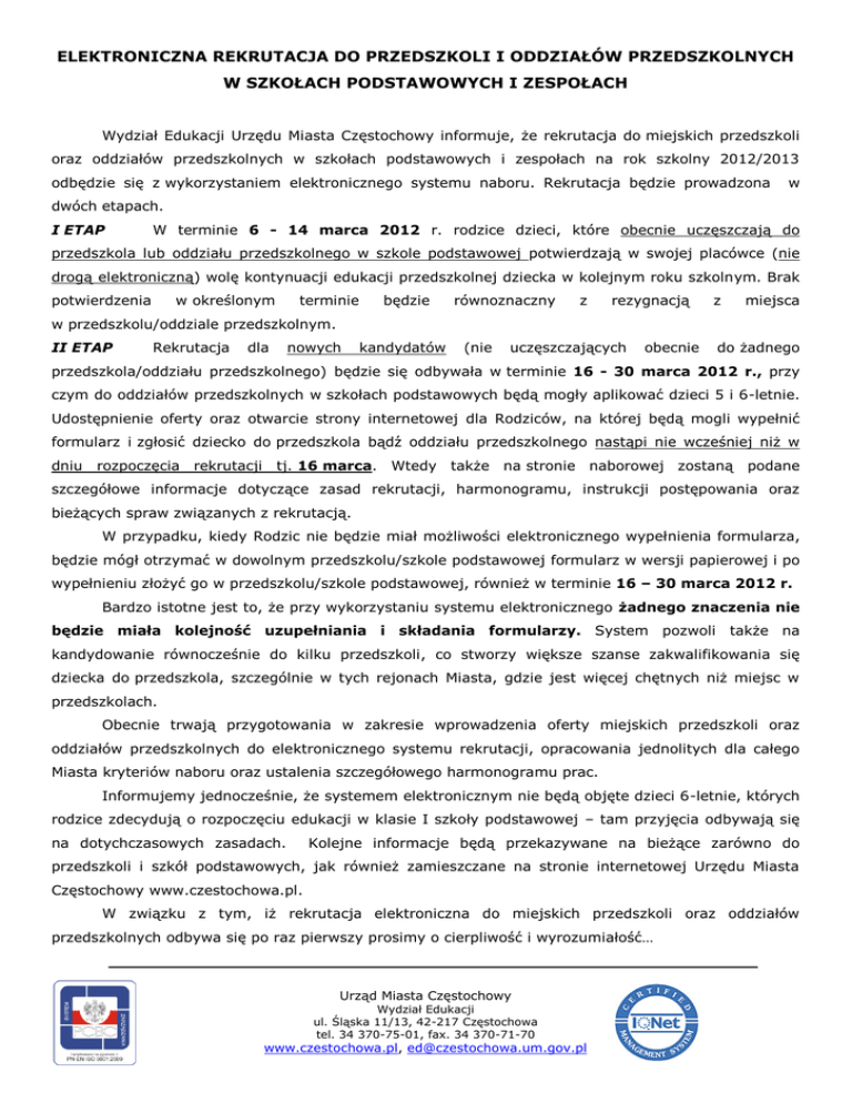ELEKTRONICZNA REKRUTACJA DO PRZEDSZKOLI I ODDZIAŁÓW PRZEDSZKOLNYCH W SZKOŁACH PODSTAWOWYCH I ZESPOŁACH Wydział Edukacji Urzędu Miasta Częstochowy informuje, że rekrutacja do miejskich przedszkoli oraz oddziałów przedszkolnych w szkołach podstawowych i zespołach na rok szkolny 2012/2013 odbędzie się z wykorzystaniem elektronicznego systemu naboru. Rekrutacja będzie prowadzona w dwóch etapach. I ETAP W terminie 6 - 14 marca 2012 r. rodzice dzieci, które obecnie uczęszczają do przedszkola lub oddziału przedszkolnego w szkole podstawowej potwierdzają w swojej placówce (nie drogą elektroniczną) wolę kontynuacji edukacji przedszkolnej dziecka w kolejnym roku szkolnym. Brak potwierdzenia w określonym terminie będzie równoznaczny z rezygnacją z miejsca w przedszkolu/oddziale przedszkolnym. II ETAP Rekrutacja dla nowych kandydatów (nie uczęszczających obecnie do żadnego przedszkola/oddziału przedszkolnego) będzie się odbywała w terminie 16 - 30 marca 2012 r., przy czym do oddziałów przedszkolnych w szkołach podstawowych będą mogły aplikować dzieci 5 i 6-letnie. Udostępnienie oferty oraz otwarcie strony internetowej dla Rodziców, na której będą mogli wypełnić formularz i zgłosić dziecko do przedszkola bądź oddziału przedszkolnego nastąpi nie wcześniej niż w dniu rozpoczęcia rekrutacji tj. 16 marca. Wtedy także na stronie naborowej zostaną podane szczegółowe informacje dotyczące zasad rekrutacji, harmonogramu, instrukcji postępowania oraz bieżących spraw związanych z rekrutacją. W przypadku, kiedy Rodzic nie będzie miał możliwości elektronicznego wypełnienia formularza, będzie mógł otrzymać w dowolnym przedszkolu/szkole podstawowej formularz w wersji papierowej i po wypełnieniu złożyć go w przedszkolu/szkole podstawowej, również w terminie 16 – 30 marca 2012 r. Bardzo istotne jest to, że przy wykorzystaniu systemu elektronicznego żadnego znaczenia nie będzie miała kolejność uzupełniania i składania formularzy. System pozwoli także na kandydowanie równocześnie do kilku przedszkoli, co stworzy większe szanse zakwalifikowania się dziecka do przedszkola, szczególnie w tych rejonach Miasta, gdzie jest więcej chętnych niż miejsc w przedszkolach. Obecnie trwają przygotowania w zakresie wprowadzenia oferty miejskich przedszkoli oraz oddziałów przedszkolnych do elektronicznego systemu rekrutacji, opracowania jednolitych dla całego Miasta kryteriów naboru oraz ustalenia szczegółowego harmonogramu prac. Informujemy jednocześnie, że systemem elektronicznym nie będą objęte dzieci 6-letnie, których rodzice zdecydują o rozpoczęciu edukacji w klasie I szkoły podstawowej – tam przyjęcia odbywają się na dotychczasowych zasadach. Kolejne informacje będą przekazywane na bieżące zarówno do przedszkoli i szkół podstawowych, jak również zamieszczane na stronie internetowej Urzędu Miasta Częstochowy www.czestochowa.pl. W związku z tym, iż rekrutacja elektroniczna do miejskich przedszkoli oraz oddziałów przedszkolnych odbywa się po raz pierwszy prosimy o cierpliwość i wyrozumiałość… Urząd Miasta Częstochowy Wydział Edukacji ul. Śląska 11/13, 42-217 Częstochowa tel. 34 370-75-01, fax. 34 370-71-70 www.czestochowa.pl, [email protected]