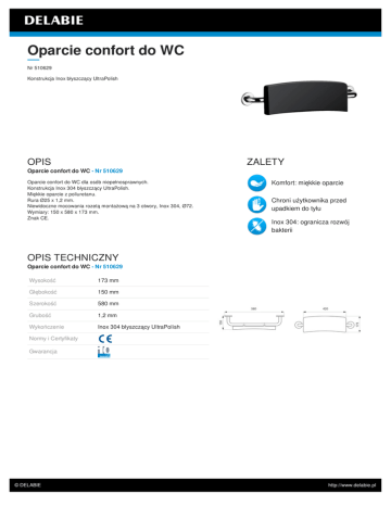 Oparcie confort do WC Nr 510629 Konstrukcja Inox błyszczący UltraPolish OPIS ZALETY Oparcie confort do WC - Nr 510629 Oparcie confort do WC dla osób niepełnosprawnych. Konstrukcja Inox 304 błyszczący UltraPolish. Miękkie oparcie z poliuretanu. Rura Ø25 x 1,2 mm. Niewidoczne mocowania rozetą montażową na 3 otwory, Inox 304, Ø72. Wymiary: 150 x 580 x 173 mm. Znak CE. Komfort: miękkie oparcie Chroni użytkownika przed upadkiem do tyłu Inox 304: ogranicza rozwój bakterii OPIS TECHNICZNY Oparcie confort do WC - Nr 510629 Wysokość 173 mm Głębokość 150 mm Szerokość 580 mm Grubość 1,2 mm Wykończenie Inox 304 błyszczący UltraPolish Normy i Certyfikaty Gwarancja © DELABIE http://www.delabie.pl