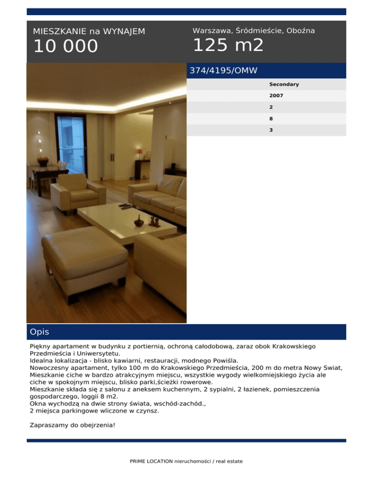 MIESZKANIE na WYNAJEM 10 000 Warszawa, Śródmieście, Oboźna 125 m2 374/4195/OMW Secondary 2007 2 8 3 Opis Piękny apartament w budynku z portiernią, ochroną całodobową, zaraz obok Krakowskiego Przedmieścia i Uniwersytetu. Idealna lokalizacja - blisko kawiarni, restauracji, modnego Powiśla. Nowoczesny apartament, tylko 100 m do Krakowskiego Przedmieścia, 200 m do metra Nowy Swiat, Mieszkanie ciche w bardzo atrakcyjnym miejscu, wszystkie wygody wielkomiejskiego życia ale ciche w spokojnym miejscu, blisko parki,ścieżki rowerowe. Mieszkanie składa się z salonu z aneksem kuchennym, 2 sypialni, 2 łazienek, pomieszczenia gospodarczego, loggii 8 m2. Okna wychodzą na dwie strony świata, wschód-zachód., 2 miejsca parkingowe wliczone w czynsz. Zapraszamy do obejrzenia! PRIME LOCATION nieruchomości / real estate Katarzyna Friedel-Udarov tel. +48 604 424 605; +4822 389 75 77 tel. +48 604 424 605 email: [email protected] PRIME LOCATION nieruchomości / real estate Powered by TCPDF (www.tcpdf.org)