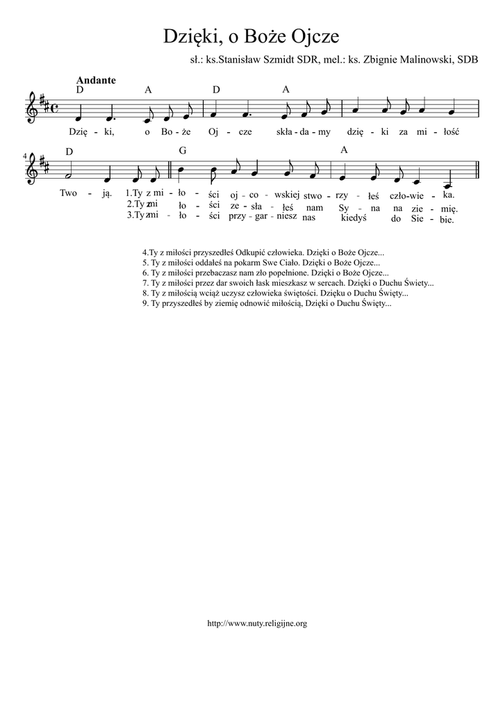 Dzięki, o Boże Ojcze sł.: ks.Stanisław Szmidt SDR, mel.: ks. Zbignie Malinowski, SDB Andante D Dzię 4 A ki, o Bo że G D Two ją. 1.Ty z mi 2.Ty zmi 3.Ty zmi ło ło ło Oj                A D                   cze skła da my ści oj co wskiej stwo ści ze sła łeś nam ści przy gar niesz nas dzię ki za mi A rzy łeś czło wie Sy na na zie kiedyś do Sie 4.Ty z miłości przyszedłeś Odkupić człowieka. Dzięki o Boże Ojcze... 5. Ty z miłości oddałeś na pokarm Swe Ciało. Dzięki o Boże Ojcze... 6. Ty z miłości przebaczasz nam zło popełnione. Dzięki o Boże Ojcze... 7. Ty z miłości przez dar swoich łask mieszkasz w sercach. Dzięki o Duchu Świety... 8. Ty z miłością wciąż uczysz człowieka świętości. Dzięku o Duchu Święty... 9. Ty przyszedłeś by ziemię odnowić miłością, Dzięki o Duchu Święty... http://www.nuty.religijne.org łość ka. mię. bie.