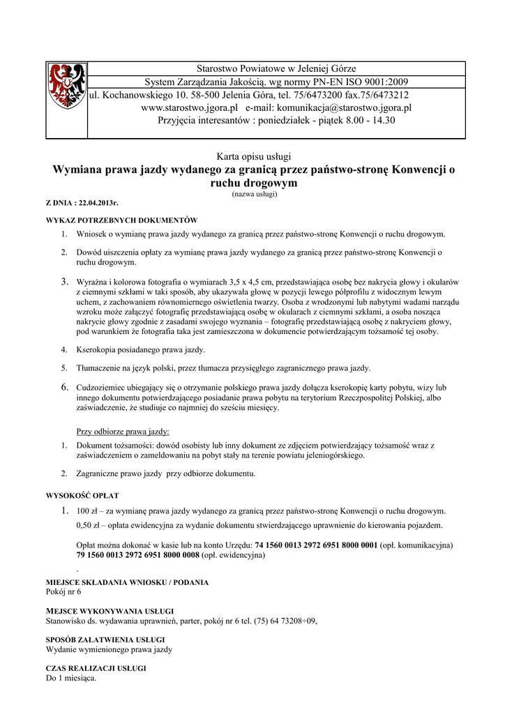 Starostwo Powiatowe w Jeleniej Górze System Zarządzania Jakością. wg normy PN-EN ISO 9001:2009 ul. Kochanowskiego 10. 58-500 Jelenia Góra, tel. 75/6473200 fax.75/6473212 www.starostwo.jgora.pl e-mail: [email protected] Przyjęcia interesantów : poniedziałek - piątek 8.00 - 14.30 Karta opisu usługi Wymiana prawa jazdy wydanego za granicą przez państwo-stronę Konwencji o ruchu drogowym (nazwa usługi) Z DNIA : 22.04.2013r. WYKAZ POTRZEBNYCH DOKUMENTÓW 1. Wniosek o wymianę prawa jazdy wydanego za granicą przez państwo-stronę Konwencji o ruchu drogowym. 2. Dowód uiszczenia opłaty za wymianę prawa jazdy wydanego za granicą przez państwo-stronę Konwencji o ruchu drogowym. 3. Wyraźna i kolorowa fotografia o wymiarach 3,5 x 4,5 cm, przedstawiająca osobę bez nakrycia głowy i okularów z ciemnymi szkłami w taki sposób, aby ukazywała głowę w pozycji lewego półprofilu z widocznym lewym uchem, z zachowaniem równomiernego oświetlenia twarzy. Osoba z wrodzonymi lub nabytymi wadami narządu wzroku może załączyć fotografię przedstawiającą osobę w okularach z ciemnymi szkłami, a osoba nosząca nakrycie głowy zgodnie z zasadami swojego wyznania – fotografię przedstawiającą osobę z nakryciem głowy, pod warunkiem że fotografia taka jest zamieszczona w dokumencie potwierdzającym tożsamość tej osoby. 4. Kserokopia posiadanego prawa jazdy. 5. Tłumaczenie na język polski, przez tłumacza przysięgłego zagranicznego prawa jazdy. 6. Cudzoziemiec ubiegający się o otrzymanie polskiego prawa jazdy dołącza kserokopię karty pobytu, wizy lub innego dokumentu potwierdzającego posiadanie prawa pobytu na terytorium Rzeczpospolitej Polskiej, albo zaświadczenie, że studiuje co najmniej do sześciu miesięcy. Przy odbiorze prawa jazdy: 1. Dokument tożsamości: dowód osobisty lub inny dokument ze zdjęciem potwierdzający tożsamość wraz z zaświadczeniem o zameldowaniu na pobyt stały na terenie powiatu jeleniogórskiego. 2. Zagraniczne prawo jazdy przy odbiorze dokumentu. WYSOKOŚĆ OPŁAT 1. 100 zł – za wymianę prawa jazdy wydanego za granicą przez państwo-stronę Konwencji o ruchu drogowym. 0,50 zł – opłata ewidencyjna za wydanie dokumentu stwierdzającego uprawnienie do kierowania pojazdem. Opłat można dokonać w kasie lub na konto Urzędu: 74 1560 0013 2972 6951 8000 0001 (opł. komunikacyjna) 79 1560 0013 2972 6951 8000 0008 (opł. ewidencyjna) . MIEJSCE SKŁADANIA WNIOSKU / PODANIA Pokój nr 6 MEJSCE WYKONYWANIA USŁUGI Stanowisko ds. wydawania uprawnień, parter, pokój nr 6 tel. (75) 64 73208÷09, SPOSÓB ZAŁATWIENIA USŁUGI Wydanie wymienionego prawa jazdy CZAS REALIZACJI USŁUGI Do 1 miesiąca. INFORMACJA O TRYBIE ODWOŁAWCZYM Do Samorządowego Kolegium Odwoławczego w terminie 14 dni od dnia doręczenia decyzji za pośrednictwem organu, który wydał decyzję. SPOSÓB ODBIORU DOKUMENTÓW Osobiście lub przez upoważnionego pełnomocnika PODSTAWA PRAWNA 1. Ustawa o kierujących pojazdami (Dz. U. z 2011r. Nr 30, poz. 151 z późn. zm.) wraz z przepisami wykonawczymi. UWAGI 1. Kierujący może posiadać tylko jedno ważne prawo jazdy. 2. Jeżeli prawo jazdy wydane za granicą zawiera ograniczenia terminu ważności, ograniczenie ze względu na stan zdrowia lub inne należy to ograniczenie uwzględnić w wydanym prawie jazdy. 3. Wymagane dokumenty należy również przedstawić w przypadku ubiegania się o wymianę prawa jazdy wydanego za granicą, jeżeli z umów międzynarodowych wynika wzajemna wymiana prawa jazdy bez wymogu sprawdzenia kwalifikacji. 4. Osoba posiadająca krajowe prawo jazdy wydane za granicą, która zamieszkuje na terytorium Rzeczpospolitej Polskiej, może otrzymać polskie krajowe prawo jazdy po oddaniu zagranicznego ważnego prawa jazdy organowi wydającemu prawo jazdy.
