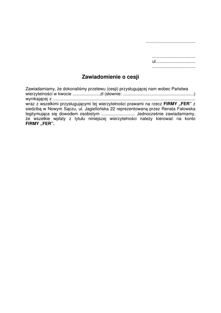 ......................................... .................................... ul................................. .................................... Zawiadomienie o cesji Zawiadamiamy, że dokonaliśmy przelewu (cesji) przysługującej nam wobec Państwa wierzytelności w kwocie .......................zł (słownie: ...........................................................) wynikającej z ...................................................................................................................... wraz z wszelkimi przysługującymi tej wierzytelności prawami na rzecz FIRMY „FER” z siedzibą w Nowym Sączu, ul. Jagiellońska 22 reprezentowaną przez Renata Fałowska legitymująca się dowodem osobistym ............................ Jednocześnie zawiadamiamy, że wszelkie wpłaty z tytułu niniejszej wierzytelności należy kierować na konto FIRMY „FER”.