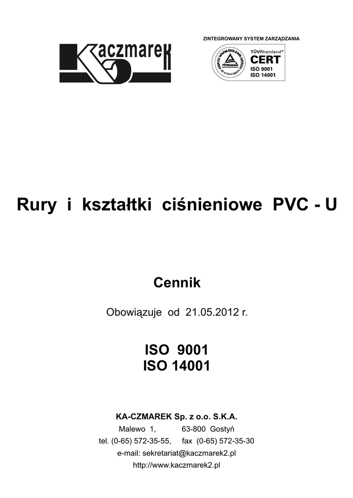 ZINTEGROWANY SYSTEM ZARZ¥DZANIA Rury i kszta³tki ciœnieniowe PVC - U Cennik Obowi¹zuje od 21.05.2012 r. ISO 9001 ISO 14001 KA-CZMAREK Sp. z o.o. S.K.A. Malewo 1, tel. (0-65) 572-35-55, 63-800 Gostyñ fax (0-65) 572-35-30 e-mail: [email protected] http://www.kaczmarek2.pl RURY CIŒNIENIOWE PVC-U DO SIECI WODOCI¥GOWYCH Normy, aprobaty techniczne: PN-EN ISO 1452-2 Nazwa artyku³u Wymiar Indeks J.M. Cena 1 szt. [mm] Rura ciœnieniowa PVC - U z uszczelk¹ PN 6 Rura ciœnieniowa PVC - U z uszczelk¹ PN 10 Rura ciœnieniowa PVC - U z uszczelk¹ ANGER-LOCK PN 10 Rura ciœnieniowa PVC - U z uszczelk¹ PN 12,5 Data: 21.05.2012 r. 1 mb. [PLN] 90 x 2,7 x 6000 110 x 2,7 x 6000 160 x 4,0 x 6000 225 x 5,5 x 6000 315 x 7,7 x 6000 400 x 9,8 x 6000 450 x 11,0 x 6000 500 x 12,3 x 6000 0118211600 0120211600 0123211600 0126211600 0129211600 0131211600 0132211600 0133211600 szt. 64,28 szt. 78,90 szt. 170,74 szt. 389,50 szt. 765,87 szt. 1521,25 szt. 1765,20 szt. 2872,21 90 x 110 x 160 x 225 x 4,3 x 3000 4,2 x 3000 6,2 x 3000 8,6 x 3000 0118411300 0120411300 0123411300 0126411300 szt. szt. szt. szt. 90 x 4,3 x 6000 110 x 4,2 x 6000 160 x 6,2 x 6000 225 x 8,6 x 6000 280 x 10,7 x 6000 315 x 12,1 x 6000 400 x 15,3 x 6000 450 x 17,2 x 6000 500 x 19,1 x 6000 0118411600 0120411600 0123411600 0126411600 0128411600 0129411600 0131411600 0132411600 0133411600 90 x 110 x 160 x 225 x 4,3 x 6000 4,2 x 6000 6,2 x 6000 8,6 x 6000 90 x 5,4 x 6000 110 x 5,3 x 6000 160 x 7,7 x 6000 225 x 10,8 x 6000 280 x 13,4 x 6000 315 x 15,0 x 6000 400 x 19,1 x 6000 Iloœæ w op. Karton Paleta 10,71 13,15 28,46 64,92 127,65 253,54 294,20 478,70 60 50 28 15 6 3 3 2 53,72 59,69 123,50 259,40 17,91 19,90 41,17 86,47 60 50 28 15 szt. szt. szt. szt. szt. szt. szt. szt. szt. 102,31 113,69 235,23 494,10 938,28 1003,08 1894,77 2531,43 3445,76 17,05 18,95 39,21 82,35 156,38 167,18 315,80 421,90 574,29 60 50 28 15 8 6 3 3 2 0118431600 0120431600 0123431600 0126431600 szt. szt. szt. szt. 106,40 118,24 244,64 513,86 17,73 19,70 40,77 85,64 60 50 28 15 0118511600 0120511600 0123511600 0126511600 0128511600 0129511600 0131511600 szt. 128,60 szt. 151,69 szt. 296,46 szt. 624,67 szt. 1185,00 szt. 1269,60 szt. 2386,20 21,43 25,28 49,41 104,11 197,50 211,60 397,70 60 50 28 15 8 6 3 Obowi¹zuje cena w dniu odbioru towaru Podatek VAT - 23 % KSZTA£TKI CIŒNIENIOWE PVC-U DO SIECI WODOCI¥GOWYCH Normy, aprobaty techniczne: PN-EN ISO 1452-3 Nazwa artyku³u Wymiar Indeks J.M. [mm] £uk jednokielichowy 11 z uszczelk¹ PN 10 Iloœæ w op. [PLN] Karton Paleta o £uk jednokielichowy 22 o z uszczelk¹ PN 10 £uk jednokielichowy 30 o z uszczelk¹ PN 10 £uk jednokielichowy 45 o z uszczelk¹ PN 10 £uk jednokielichowy 90 o z uszczelk¹ PN 10 Data: 21.05.2012 r. Cena 90 110 160 225 280 315 400 450 500 0210181420 0210201420 0210231420 0210261420 0210281420 0210291420 0210311420 0210321420 0210331420 szt. szt. szt. szt. szt. szt. szt. szt. szt. 17,45 22,41 60,95 198,89 396,21 540,24 1386,52 2836,81 3576,34 90 110 160 225 280 315 400 450 500 0210181440 0210201440 0210231440 0210261440 0210281440 0210291440 0210311440 0210321440 0210331440 szt. szt. szt. szt. szt. szt. szt. szt. szt. 18,49 25,44 69,59 233,87 483,45 576,12 1488,63 3030,74 3809,09 90 110 160 225 280 315 400 450 500 0210181450 0210201450 0210231450 0210261450 0210281450 0210291450 0210311450 0210321450 0210331450 szt. szt. szt. szt. szt. szt. szt. szt. szt. 19,53 27,96 82,10 247,46 483,45 659,88 1692,85 3224,73 3964,29 90 110 160 225 280 315 400 450 500 0210181460 0210201460 0210231460 0210261460 0210281460 0210291460 0210311460 0210321460 0210331460 szt. szt. szt. szt. szt. szt. szt. szt. szt. 20,55 32,16 93,05 294,33 567,14 731,63 2101,37 3677,28 4507,43 90 110 160 225 280 315 400 450 500 0210181490 0210201490 0210231490 0210261490 0210281490 0210291490 0210311490 0210321490 0210331490 szt. szt. szt. szt. szt. szt. szt. szt. szt. 35,42 49,74 148,13 505,10 914,19 1065,92 3053,44 4608,41 5970,67 Obowi¹zuje cena w dniu odbioru towaru Podatek VAT - 23 % KSZTA£TKI CIŒNIENIOWE PVC-U DO SIECI WODOCI¥GOWYCH Normy, aprobaty techniczne: PN-EN ISO 1452-3 Nazwa artyku³u Wymiar Indeks J.M. [mm] Nasuwka z uszczelk¹ PN 10 Z³¹czka dwukielichowa z uszczelk¹ PN 10 Tuleja z PVC-U ENPL z luŸnym ko³nierzem i uszczelk¹ PN 10 Tuleja z PVC-U FNP z luŸnym ko³nierzem Trójnik kielichowy z PVC-U z uszczelk¹ PN 10 Trójnik z PVC-U ANP z luŸnym ko³nierzem i uszczelk¹ PN 10 Trójnik z PVC-U ANPL z gwintem wewnêtrznym i uszczelk¹ PN 10 Data: 21.05.2012 r. Cena Iloœæ w op. [PLN] Karton Paleta 90 110 160 225 280 315 400 0201181400 0201201400 0201231400 0201261400 0201281400 0201291400 0201311400 szt. szt. szt. szt. szt. szt. szt. 15,63 17,54 45,51 116,22 219,90 306,09 668,70 90 110 160 225 280 315 400 0204181400 0204201400 0204231400 0204261400 0204281400 0204291400 0204311400 szt. szt. szt. szt. szt. szt. szt. 15,74 18,56 52,50 139,00 237,18 341,75 831,93 90/ 80 110/100 160/150 225/200 0236181400 0236201400 0236231400 0236261400 szt. szt. szt. szt. 70,80 75,60 128,85 279,60 90/ 80 110/100 160/150 225/200 0237181400 0237201400 0237231400 0237261400 szt. szt. szt. szt. 61,50 68,85 99,75 184,65 90/ 90 110/ 90 110/110 160/ 90 160/110 160/160 0224371490 0224521490 0224541490 0224711490 0224731490 0224751490 szt. szt. szt. szt. szt. szt. 100,51 125,15 133,38 270,75 281,00 295,44 90/ 80 110/ 80 110/100 160/ 80 160/100 160/150 225/150 225/200 0225361490 0225511490 0225531490 0225701490 0225721490 0225751490 0225861490 0225871490 szt. szt. szt. szt. szt. szt. szt. szt. 105,60 121,35 121,35 182,85 196,20 225,45 456,20 409,35 90/1,5’’ 110/ 2’’ 160/ 2’’ 0227361490 0227531490 0227721490 szt. szt. szt. 123,15 138,15 183,75 Obowi¹zuje cena w dniu odbioru towaru Podatek VAT - 23 %