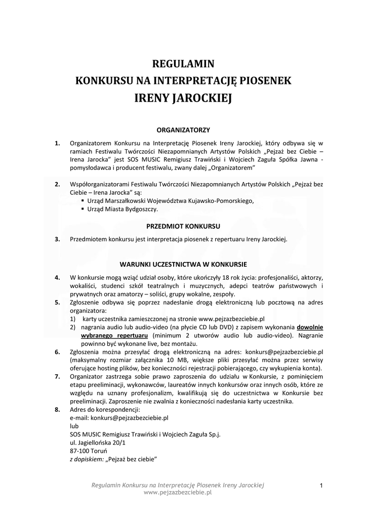 REGULAMIN KONKURSU NA INTERPRETACJĘ PIOSENEK IRENY JAROCKIEJ ORGANIZATORZY 1. Organizatorem Konkursu na Interpretację Piosenek Ireny Jarockiej, który odbywa się w ramiach Festiwalu Twórczości Niezapomnianych Artystów Polskich „Pejzaż bez Ciebie – Irena Jarocka” jest SOS MUSIC Remigiusz Trawiński i Wojciech Zaguła Spółka Jawna pomysłodawca i producent festiwalu, zwany dalej „Organizatorem” 2. Współorganizatorami Festiwalu Twórczości Niezapomnianych Artystów Polskich „Pejzaż bez Ciebie – Irena Jarocka” są: Urząd Marszałkowski Województwa Kujawsko-Pomorskiego, Urząd Miasta Bydgoszczy. PRZEDMIOT KONKURSU 3. Przedmiotem konkursu jest interpretacja piosenek z repertuaru Ireny Jarockiej. WARUNKI UCZESTNICTWA W KONKURSIE 4. 5. 6. 7. 8. W konkursie mogą wziąć udział osoby, które ukończyły 18 rok życia: profesjonaliści, aktorzy, wokaliści, studenci szkół teatralnych i muzycznych, adepci teatrów państwowych i prywatnych oraz amatorzy – soliści, grupy wokalne, zespoły. Zgłoszenie odbywa się poprzez nadesłanie drogą elektroniczną lub pocztową na adres organizatora: 1) karty uczestnika zamieszczonej na stronie www.pejzazbezciebie.pl 2) nagrania audio lub audio-video (na płycie CD lub DVD) z zapisem wykonania dowolnie wybranego repertuaru (minimum 2 utworów audio lub audio-video). Nagranie powinno być wykonane live, bez montażu. Zgłoszenia można przesyłać drogą elektroniczną na adres: [email protected] (maksymalny rozmiar załącznika 10 MB, większe pliki przesyłać można przez serwisy oferujące hosting plików, bez konieczności rejestracji pobierającego, czy wykupienia konta). Organizator zastrzega sobie prawo zaproszenia do udziału w Konkursie, z pominięciem etapu preeliminacji, wykonawców, laureatów innych konkursów oraz innych osób, które ze względu na uznany profesjonalizm, kwalifikują się do uczestnictwa w Konkursie bez preeliminacji. Zaproszenie nie zwalnia z konieczności nadesłania karty uczestnika. Adres do korespondencji: e-mail: [email protected] lub SOS MUSIC Remigiusz Trawiński i Wojciech Zaguła Sp.j. ul. Jagiellońska 20/1 87-100 Toruń z dopiskiem: „Pejzaż bez ciebie” Regulamin Konkursu na Interpretację Piosenek Ireny Jarockiej www.pejzazbezciebie.pl 1 TERMINY 9. Kartę uczestnika z nagraniem audio lub audio-video należy przesłać w nieprzekraczalnym terminie do 22 października 2012 r. Zgłoszenia, które nadejdą po tym terminie nie będą brane pod uwagę podczas obrad Komisji Kwalifikacyjnej. Organizator nie zwraca nadesłanych zgłoszeń. 10. Lista uczestników zakwalifikowanych do II etapu Konkursu - Przesłuchań - zostanie ogłoszona przez organizatora konkursu do dnia 24 października 2012 r. na stronie internetowej Festiwalu www.pejzazbezciebie.pl. 11. II etap konkursu – Przesłuchania - odbędą się 27 października 2017 r. w Bydgoszczy. Organizator zobowiązuje się do telefonicznego lub mailowego powiadomienia o dokładnym miejscu i godzinie przesłuchań. 12. III etap konkursu – Przegląd Konkursowy - odbędzie się 28 października 2012 r. w Sali koncertowej Opery Nova w Bydgoszczy. Organizator zobowiązuje się do telefonicznego lub mailowego powiadomienia o dokładnym miejscu i godzinie przesłuchań. 13. IV ETAP: Koncert Galowy „Pejzaż bez Ciebie – Irena Jarocka” Festiwal Twórczości Niezapomnianych Artystów Polskich, Bydgoszcz 2012 – odbędzie się w dniu 28 października 2012r. w sali koncertowej Opery Nova w Bydgoszczy. W koncercie biorą udział gwiazdy polskiej sceny oraz laureat Konkursu na Interpretację Piosenek Ireny Jarockiej. PRZEBIEG KONKURSU 14. Konkurs zostanie przeprowadzony w 4 etapach: I ETAP: Preeliminacje Konkursu na Interpretację Piosenek Ireny Jarockiej Komisja Kwalifikacyjna na podstawie przesłanych zgłoszeń dokonuje kwalifikacji do II etapu Konkursu. II ETAP: Przesłuchania w dniu 27 października 2012 r. w Bydgoszczy. Uczestnicy wykonują przed Jury dwie piosenki (utwór obowiązkowy i dowolny) z własnym akompaniamentem: półplayback lub akompaniament grany „na żywo”. Wyniki II etapu konkursu zostaną ogłoszone po zakończeniu obrad jury w dniu 27 października 2012. III ETAP: Przegląd Konkursowy w dniu 28 października 2012 r. w Bydgoszczy. Uczestnicy wykonują przed Jury i publicznością dwie piosenki (utwór obowiązkowy i dowolny) z własnym akompaniamentem: półplayback lub akompaniament grany na żywo. Wyniki III etapu zostaną ogłoszone po zakończeniu obrad jury w dniu 28 października 2012 r. IV ETAP: Koncert galowy „Pejzaż bez Ciebie – Irena Jarocka” Festiwal Twórczości Niezapomnianych Artystów Polskich, Bydgoszcz 2012 – koncert w dniu 28 października 2012 r. w sali koncertowej Opery Nova w Bydgoszczy. W koncercie biorą udział gwiazdy polskiej sceny oraz laureat Konkursu na Interpretację Piosenek Ireny Jarockiej. Finalista wykona utwór pt. „Ty i ja, wczoraj i dziś” z towarzyszeniem zespołu instrumentalnego pod kierownictwem Piotra Dziubka. Laureat konkursu zobowiązuje się wziąć udział w próbach do koncertu w dniach 27 i 28 października 2012 r. zgodnie z harmonogramem przedstawionym przez Organizatora. Regulamin Konkursu na Interpretację Piosenek Ireny Jarockiej www.pejzazbezciebie.pl 2 REPERTUAR 15. Uczestnicy konkursu przygotowują 2 utwory z repertuaru Ireny Jarockiej: a) utwór obowiązkowy pt. „Ty i ja, wczoraj i dziś” (sł. Marek Dutkiewicz, muz. Claude Morgan). Maksymalny czas trwania utworu – 4 minuty b) dowolny, wybrany przez uczestnika, utwór z repertuaru Ireny Jarockiej. Maksymalny czas trwania utworu – 3 minuty. 16. W II i III etapie Konkursu Uczestnicy zobowiązani są wykonać dwie piosenki z własnym akompaniamentem: półplayback lub akompaniament grany na żywo. 17. W IV etapie Konkursu laureat wykona w Koncercie Galowym utwór pt. „Ty i ja, wczoraj i dziś” z towarzyszeniem zespołu instrumentalnego pod kierownictwem Piotra Dziubka. NIEODPŁATN