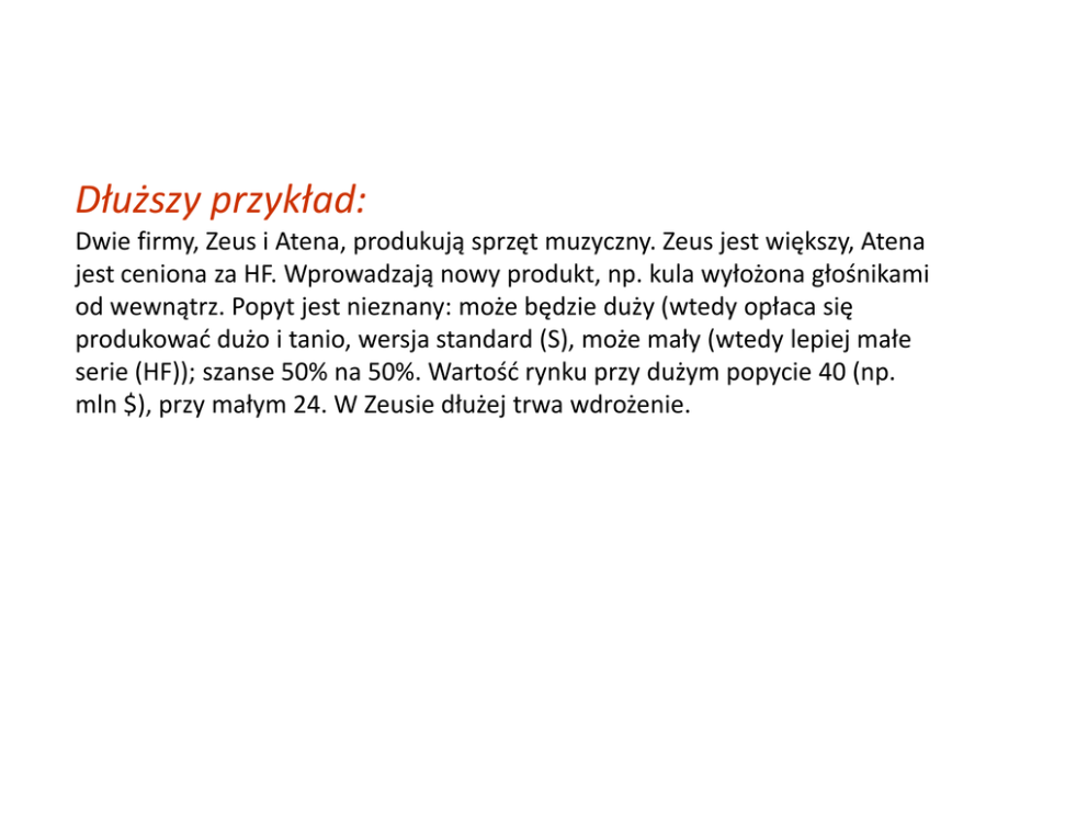 Dłuższy przykład: Dwie firmy, Zeus i Atena, produkują sprzęt muzyczny. Zeus jest większy, Atena jest ceniona za HF. Wprowadzają nowy produkt, np. kula wyłożona głośnikami od wewnątrz. Popyt jest nieznany: może będzie duży (wtedy opłaca się produkować dużo i tanio, wersja standard (S), może mały (wtedy lepiej małe serie (HF)); szanse 50% na 50%. Wartość rynku przy dużym popycie 40 (np. mln $), przy małym 24. W Zeusie dłużej trwa wdrożenie. To samo: DRZEWO GRY LOS Popyt mały Zeus nie wie, co zrobił los duży Ruch Zeusa S HF S HF Atena nie wie, co zrobił los ani co zrobił Zeus Ruch Ateny S (16,8) HF S HF S HF S HF (8,16) (20,4) (16,8) (30,10) (28,12) (16,24) (24,16) Wypłaty (Zeus,Atena) Obliczanie wypłat = średniowanie po dużym i małym popycie. Np. Zeus HF, Atena S: [(20,4)+(16,24)]/2=(18,14) Mały popyt 20+4=24 Duży popyt 16+24=40 Atena S Wynik: Zeus S HF 23,9 18,14 HF 18,14 20,12 (Zeus,Atena) Atena S Zeus S HF 23,9 18,14 HF 18,14 20,12 (Zeus,Atena) 9 14 14 12 (A) Gra o sumie stałej równoważna grze o sumie zerowej; W(Z)W(Z)-32 Rozwiązanie dla obu graczy: strategia mieszana 2/7 S + 5/7 HF Dowód: jeśli Z gra S, to W(A)=9p+14(1-p) = 14-5p jeśli Z gra HF, to W(A)=14p+12(1-p) = 12 +2p Strategia wyrównująca: 14-5p = 12 +2p p = 2/7 taka sama dla obu graczy, bo macierz gry symetryczna. Wartość gry dla Ateny: 12+4/7=88/7; dla Zeusa: 32-88/7=19+3/7. Przykład zmodyfikowany - Atena czeka na ruch Zeusa LOS Popyt mały Zeus nie wie, co zrobił los duży Ruch Zeusa S HF S HF Atena nie wie, co zrobił los, ale wie, co zrobił Zeus Ruch Ateny S (16,8) HF S HF S HF S HF (8,16) (20,4) (16,8) (30,10) (28,12) (16,24) (24,16) Wypłaty (Zeus,Atena) Obliczanie wypłat - przykład: Zeus zagrał S, Atena HF. Jeśli popyt jest mały, to wypłaty (Zeus,Atena) = (8,16). Jeśli popyt jest duży, to wypłaty (Zeus,Atena) = (28,12) W średniej: (18,14) – tak samo, jak poprzednio. Ale strategie definiujemy teraz inaczej: Kiedy Atena zagra HF? Atena uzależnia swój ruch od ruchu Zeusa. Teraz Atena nie ma dwóch strategii (S lub HF), tylko cztery: 1. „Jeśli Zeus S, to Atena S; jeśli Zeus HF, to Atena S” (S/S) 2. „Jeśli Zeus S, to Atena S; jeśli Zeus HF, to Atena HF” (S/HF) 3. „Jeśli Zeus S, to Atena HF; jeśli Zeus HF, to Atena S” (HF/S) 4. „Jeśli Zeus S, to Atena HF; jeśli Zeus HF, to Atena HF” (HF/HF) Atena Zeus S/S S/HF HF/S HF/HF S 23 23 18 18 HF 18 20 18 20 Wypłaty Zeusa Wynik: Atena gra strategię dominującą HF/S („nie to, co Zeus”). Wartość gry dla (Zeusa,Ateny): (18,14) Wniosek: Zeus na braku elastyczności stracił 1.43 mln $ Kolejna modyfikacja – Zeus robi badania rynku LOS Popyt mały Zeus wie, co zrobił los duży Ruch Zeusa S HF S HF Ruch Ateny S (16,8) HF S HF S HF S Atena nie wie, co zrobił los, ale wie, że badania były, i wie co zrobił Zeus HF (8,16) (20,4) (16,8) (30,10) (28,12) (16,24) (24,16) Wypłaty (Zeus,Atena) Teraz również Zeus ma cztery strategie: 1. Jeśli mały popyt, to S, jeśli duży, to S 2. Jeśli mały popyt, to S, jeśli duży, to HF 3. Jeśli mały popyt, to HF, jeśli duży, to S 4. Jeśli mały popyt, to HF, jeśli duży, to HF (S/S) (S/HF) (HF/S) (HF/HF) Wypłatę Zeusa obliczamy, średniując po wszystkich możliwych wypłatach, które otrzyma Zeus, realizując daną strategię. Niech np. Zeus gra HF/S, a Atena - HF/S (przeciwnie niż Zeus). Gdy popyt duży, Zeus zagra S, Atena HF, wypłata (Z,A)=(28,12). Gdy popyt mały, Zeus zagra HF, Atena S, wypłata (Z,A)=(20,4). Średnio więc wypłata wyniesie (Zeus,Atena)=(24,8). Atena Zeus S/S S/HF HF/S HF/HF S/S 23 23 18 18 S/HF 16 20 12 16 HF/S 25 23 24 22 HF/HF 18 20 18 20 Wypłaty Zeusa Obie strony grają Minimax-Maximin Zeus: HF/S, Atena: HF/HF Wnioski: 1. Strategia Ateny zmieniła się z HF/S na HF/HF tylko dlatego, że Zeus zrobił badania. Ta zmiana dotyczy punktu: ‘co zrobić, gdy Zeus gra HF’. Gdyby z badań wyszło ‘duży rynek’, Zeus grałby S. Jeśli Zeus zrobił badania i gra HF, oznacza to, że rynek jest mały. 2. Badania pozwoliły zwiększyć zysk Zeusa o 4 miliony $. Było warto, jeśli kosztowały taniej. Uwagi końcowe: 1. Jeśli Zeusowi uda się ukryć przed Ateną badania rynku, Atena straci na tym. 2. Gdyby Atena przeprowadziła badania rynku, gra byłaby grą o pełnej informacji. Stosując technikę przycinania drzewka... (16,8) (8,16) (20,4) (16,8) (30,10) (28,12) (16,24) (24,16) Uwagi końcowe: 1. Jeśli Zeusowi uda się ukryć przed Ateną badania rynku, Atena straci na tym. 2. Gdyby Atena przeprowadziła badania rynku, gra byłaby grą o pełnej informacji. Stosując technikę przycinania drzewka... (16,8) (8,16) (20,4) (16,8) (30,10) (28,12) (16,24) (24,16) Uwagi końcowe: 1. Jeśli Zeusowi uda się ukryć przed Ateną badania rynku, Atena straci na tym. 2. Gdyby Atena przeprowadziła badania rynku, gra byłaby grą o pełnej informacji. Stosując technikę przycinania drzewka... (16,8) (8,16) (20,4) (16,8) (30,10) (28,12) (16,24) (24,16) Uwagi końcowe: 1. Jeśli Zeusowi uda się ukryć przed Ateną badania rynku, Atena straci na tym. 2. Gdyby Atena przeprowadziła badania rynku, gra byłaby grą o pełnej informacji. Stosując technikę przycinania drzewka... (16,8) (8,16) (20,4) (16,8) (30,10) (28,12) (16,24) (24,16) ...mamy średnią wypłatę (22,10), a więc tak samo jakby Atena ich nie prowadziło. Badania nie opłacają się więc Atenie.