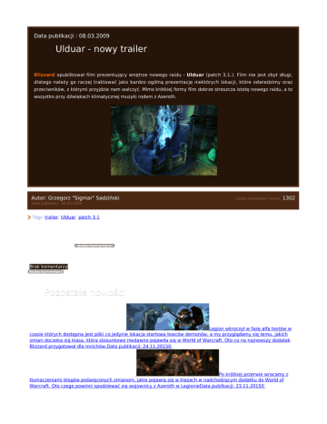 Data publikacji : 08.03.2009 Ulduar - nowy trailer Blizzard opublikował film prezentujący wnętrze nowego raidu - Ulduar (patch 3.1.). Film nie jest zbyt długi, dlatego należy go raczej traktować jako bardzo ogólną prezentację niektórych lokacji, które odwiedzimy oraz przeciwników, z którymi przyjdzie nam walczyć. Mimo krótkiej formy film dobrze streszcza istotę nowego raidu, a to wszystko przy dźwiękach klimatycznej muzyki rodem z Azeroth. Autor: Grzegorz "Sigmar" Sadziński Liczba wyświetleń strony: 1302 Data publikacji : 08.03.2009 Tagi: trailer, Ulduar, patch 3.1 Komentarz (0) dodaj komentarz Brak komentarzy dodaj komentarz Pozostałe nowości Zapowiedź zmian w klasach - Mnich Legion wkroczył w fazę alfa testów w czasie których dostępna jest póki co jedynie lokacja startowa łowców demonów, a my przyglądamy się temu, jakich zmian doczeka się klasa, która stosunkowo niedawno pojawiła się w World of Warcraft. Oto co na najnowszy dodatek Blizzard przygotował dla mnichów.Data publikacji: 24.11.20150 Zapowiedź zmian w klasach - Wojownik Po krótkiej przerwie wracamy z tłumaczeniami blogów poświęconych zmianom, jakie pojawią się w klasach w nadchodzącym dodatku do World of Warcraft. Oto czego powinni spodziewać się wojownicy z Azeroth w LegionieData publikacji: 23.11.20150 Zapowiedź zmian w klasach - Szaman Kolejna zapowiedzieć, która pojawiła się jakiś czas temu na łamach oficjalnej strony społecznościowej dotyczy szamana. Największe zmiany w przypadku tej klasy dotknęły totemy oraz system zasobów specjalizacji Elemental oraz EnhancementData publikacji: 16.11.20150 11 urodziny World of Warcraft World of Warcraft obchodzi już swoje 11 urodziny. Z tej okazji Blizzard przygotował kilka zabawek, które powinny wszystkim przypomnieć sam początek przygody w świecie Azeroth - w rolach głównych Edwin VanCleef, Hogger, murlok oraz Windfury (w wersji nadmuchiwanej).Data publikacji: 16.11.20150 Zapowiedź zmian w klasach - Rycerz śmierci Kolejna zapowiedź opublikowana na łamach oficjalnej strony społecznościowej World of Warcraft poświęcona jest klasie rycerzy śmierci. Poniżej znajdziecie informacje między innymi o ujednoliceniu wszystkich run oraz nowej umiejętności specjalizacji Blood, która została zainspirowana Lordem Marrowgarem z Icecrown Citadel.Data publikacji: 15.11.20150 Wszystkie nowości