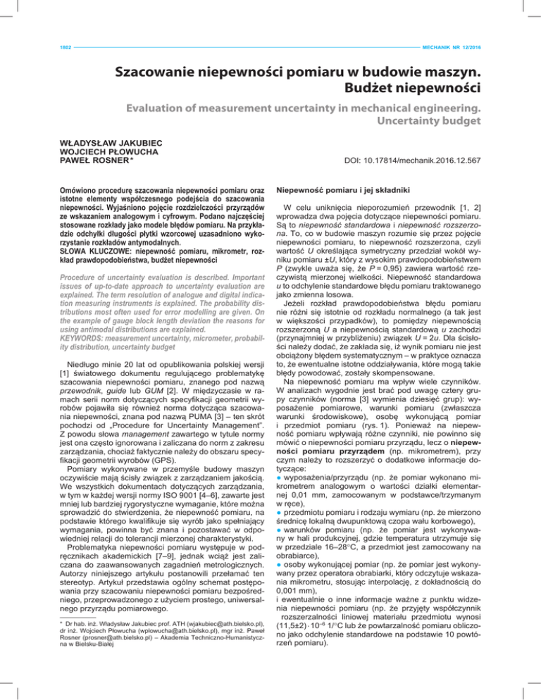 1802 MECHANIK NR 12/2016 Szacowanie niepewności pomiaru w budowie maszyn. Budżet niepewności Evaluation of measurement uncertainty in mechanical engineering. Uncertainty budget WŁADYSŁAW JAKUBIEC WOJCIECH PŁOWUCHA PAWEŁ ROSNER * Omówiono procedurę szacowania niepewności pomiaru oraz istotne elementy współczesnego podejścia do szacowania niepewności. Wyjaśniono pojęcie rozdzielczości przyrządów ze wskazaniem analogowym i cyfrowym. Podano najczęściej stosowane rozkłady jako modele błędów pomiaru. Na przykładzie odchyłki długości płytki wzorcowej uzasadniono wykorzystanie rozkładów antymodalnych. SŁOWA KLUCZOWE: niepewność pomiaru, mikrometr, rozkład prawdopodobieństwa, budżet niepewności Procedure of uncertainty evaluation is described. Important issues of up-to-date approach to uncertainty evaluation are explained. The term resolution of analogue and digital indication measuring instruments is explained. The probability distributions most often used for error modelling are given. On the example of gauge block length deviation the reasons for using antimodal distributions are explained. KEYWORDS: measurement uncertainty, micrometer, probability distribution, uncertainty budget Niedługo minie 20 lat od opublikowania polskiej wersji [1] światowego dokumentu regulującego problematykę szacowania niepewności pomiaru, znanego pod nazwą przewodnik, guide lub GUM [2]. W międzyczasie w ramach serii norm dotyczących specyfikacji geometrii wyrobów pojawiła się również norma dotycząca szacowania niepewności, znana pod nazwą PUMA [3] – ten skrót pochodzi od „Procedure for Uncertainty Management”. Z powodu słowa management zawartego w tytule normy jest ona często ignorowana i zaliczana do norm z zakresu zarządzania, chociaż faktycznie należy do obszaru specyfikacji geometrii wyrobów (GPS). Pomiary wykonywane w przemyśle budowy maszyn oczywiście mają ścisły związek z zarządzaniem jakością. We wszystkich dokumentach dotyczących zarządzania, w tym w każdej wersji normy ISO 9001 [4–6], zawarte jest mniej lub bardziej rygorystyczne wymaganie, które można sprowadzić do stwierdzenia, że niepewność pomiaru, na podstawie którego kwalifikuje się wyrób jako spełniający wymagania, powinna być znana i pozostawać w odpowiedniej relacji do tolerancji mierzonej charakterystyki. Problematyka niepewności pomiaru występuje w podręcznikach akademickich [7–9], jednak wciąż jest zaliczana do zaawansowanych zagadnień metrologicznych. Autorzy niniejszego artykułu postanowili przełamać ten stereotyp. Artykuł przedstawia ogólny schemat postępowania przy szacowaniu niepewności pomiaru bezpośredniego, przeprowadzonego z użyciem prostego, uniwersalnego przyrządu pomiarowego. * Dr hab. inż. Władysław Jakubiec prof. ATH ([email protected]), dr inż. Wojciech Płowucha ([email protected]), mgr inż. Paweł Rosner ([email protected]) – Akademia Techniczno-Humanistyczna w Bielsku-Białej DOI: 10.17814/mechanik.2016.12.567 Niepewność pomiaru i jej składniki W celu uniknięcia nieporozumień przewodnik [1, 2] wprowadza dwa pojęcia dotyczące niepewności pomiaru. Są to niepewność standardowa i niepewność rozszerzona. To, co w budowie maszyn rozumie się przez pojęcie niepewności pomiaru, to niepewność rozszerzona, czyli wartość U określająca symetryczny przedział wokół wyniku pomiaru ±U, który z wysokim prawdopodobieństwem P (zwykle uważa się, że P = 0,95) zawiera wartość rzeczywistą mierzonej wielkości. Niepewność standardowa u to odchylenie standardowe błędu pomiaru traktowanego jako zmienna losowa. Jeżeli rozkład prawdopodobieństwa błędu pomiaru nie różni się istotnie od rozkładu normalnego (a tak jest w większości przypadków), to pomiędzy niepewnością rozszerzoną U a niepewnością standardową u zachodzi (przynajmniej w przybliżeniu) związek U = 2u. Dla ścisłości należy dodać, że zakłada się, iż wynik pomiaru nie jest obciążony błędem systematycznym – w praktyce oznacza to, że ewentualne istotne oddziaływania, które mogą takie błędy powodować, zostały skompensowane. Na niepewność pomiaru ma wpływ wiele czynników. W analizach wygodnie jest brać pod uwagę cztery grupy czynników (norma [3] wymienia dziesięć grup): wyposażenie pomiarowe, warunki pomiaru (zwłaszcza warunki środowiskowe), osobę wykonującą pomiar i przedmiot pomiaru (rys. 1). Ponieważ na niepewność pomiaru wpływają różne czynniki, nie powinno się mówić o niepewności pomiaru przyrządu, lecz o niepewności pomiaru przyrządem (np. mikrometrem), przy czym należy to rozszerzyć o dodatkowe informacje dotyczące: ● wyposażenia/przyrządu (np. że pomiar wykonano mikrometrem analogowym o wartości działki elementarnej 0,01 mm, zamocowanym w podstawce/trzymanym w ręce), ● przedmiotu pomiaru i rodzaju wymiaru (np. że mierzono średnicę lokalną dwupunktową czopa wału korbowego), ● warunków pomiaru (np. że pomiar jest wykonywany w hali produkcyjnej, gdzie temperatura utrzymuje się w przedziale 16–28°C, a przedmiot jest zamocowany na obrabiarce), ● osoby wykonującej pomiar (np. że pomiar jest wykonywany przez operatora obrabiarki, który odczytuje wskazania mikrometru, stosując interpolację, z dokładnością do 0,001 mm), i ewentualnie o inne informacje ważne z punktu widzenia niepewności pomiaru (np. że przyjęty współczynnik rozszerzalności liniowej materiału przedmiotu wynosi (11,5±2) ⋅ 10–6 1/°C lub że powtarzalność pomiaru obliczono jako odchylenie standardowe na podstawie 10 powtórzeń pomiaru). MECHANIK NR 12/2016 1803 Metoda typu B korzysta z informacji uzyskanych w inny sposób, np. z literatury czy wcześniejszych doświadczeń. Ważna jest jednak postać tej informacji: potrzebne są dwa elementy: ● wartość graniczna błędu a, ● charakter (rodzaj, postać) rozkładu prawdopodobieństwa tego błędu. Istniej