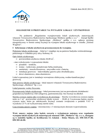 Gdańsk dnia 04.02.2013 r. OGŁOSZENIE O PRZETARGU NA WYNAJEM LOKALU UŻYTKOWEGO Na podstawie „Regulaminu wynajmowania lokali użytkowych, stanowiących własność Towarzystwa Budownictwa Społecznego Motława spółka z o.o.” – Zarząd Spółki Towarzystwo Budownictwa Społecznego „Motława” spółka z o.o. ogłasza przetarg nieograniczony w formie ustnej licytacji na wynajem lokalu użytkowego w osiedlu „Zielone Wzgórze”. I Informacja o lokalu użytkowym przeznaczonym do wynajmu. Położenie lokalu użytkowego - lokal nr 1 znajduje się na parterze budynku wielorodzinnego położonego w Gdańsku przy ulicy Srebrnej 16. Opis lokalu użytkowego: • powierzchnia użytkowa lokalu 44,80 m2, - stan wykończenia i wyposażenia lokalu: • posadzki – terakota; • ściany - tynkowane, pomalowane farbą emulsyjną; • sanitariaty - muszla klozetowa, umywalka wraz z baterią; • instalacja grzewcza – indywidualny gazowy piec dwufunkcyjny; • drzwi aluminiowe, okna aluminiowe. Lokal wyposażony jest w instalacje wewnętrzne elektryczną, wodno-kanalizacyjną i grzewczą. Stan prawny lokalu użytkowego - lokal stanowi własność Towarzystwa Budownictwa Społecznego „Motława” Sp. z o.o. Lokal prawnie: wolny fizycznie. Przeznaczenie lokalu użytkowego - lokal przeznaczony jest na prowadzenie działalności gospodarczej handlowej i/lub usługowej, gastronomicznej -bez licencji na alkohol. Stawka czynszu najmu jako wywoławcza do przetargu - Stawka wywoławcza czynszu najmu netto za 1 m2 powierzchni użytkowej lokalu wynosi – 20,00 zł. Licytowana będzie stawka czynszu netto, która po zakończeniu licytacji zostanie zwiększona o podatek VAT w wysokości 23 % od wylicytowanej stawki netto. Czas trwania umowy najmu - nieoznaczony z 3 miesięcznym okresem wypowiedzenia. Wzór umowy najmu, jaka będzie zawarta z wyłonionym najemcą oraz regulamin wynajmu lokali użytkowych stanowiących własność TBS „Motława” Sp. z o. o., dostępne są w siedzibie Spółki, ul. Królikarnia 13, Gdańsk – Dolne Miasto, tel.: 058 320-37-48; 058 305-46-00. T ow arzystw o B u dow n ictw a S po łec zn eg o „M otław a” S p . z o .o ., 80-744 G d ańs k, ul. K ró lik arn ia 13, tel. (0 58) 3 20 37 48, fax. (058 ) 301 9 6 93 , N IP 583 -26 -7 7-71 5, S ąd R ejono w y G d ańsk -P ó łn oc w G d ań sku K R S 0000 090 40 6; W łaściciel 10 0% udziałów S półki – G m ina G dańsk; K apitał zakład ow y – 87 56 3 000 P LN B ank G ospodarstw a K rajow e go O ddział w G dańsku, ul. K ow alsk a 10, nr ra ch unku : 72 1130 1121 860 0 0000 0000 5768 Przetarg (ustna licytacja) odbędzie się 27.02.2013 r. (środa) o godz. 12.00 w siedzibie Spółki. Lokal można oglądać w dniach od 11.02.2013 r. do 26.02.2013 r. w godz. od 7.oo. do 11.oo, po uprzednim powiadomieniu administracji osiedla (osobiście w siedzibie Spółki lub telefonicznym – telefony j.w.) II Warunki udziału w przetargu: 1. Wpłacenie przez oferenta wadium w wysokości 1.792,00 zł (słownie: jeden tysiąc siedemset dziewięćdziesiąt dwa złotych) i okazanie dowodu wpłaty organizatorowi przetargu przed rozpoczęciem przetargu. Uwaga: Wadium należy wpłacić przelewem na konto TBS „Motława” Sp. z o.o. nr 72 1130 1121 8600 0000 0000 5768 do dnia 25.02.2013 r., przy czym za datę wpłaty przelewem przyjmuje się dzień uznania rachunku bankowego Spółki. W przypadku wpłaty wadium gotówką w kasie Spółki, wpłaty można dokonać do rozpoczęcia przetargu. Wadium wpłacone przez oferenta który wygrał przetarg zalicza się na poczet czynszu, a wadia wpłacone przez oferentów, którzy przetargu nie wygrali, zwraca się po zakończeniu przetargu – jeżeli zostało wpłacone gotówkowo do kasy, a w przypadku dokonania wpłaty przelewem - w dniu następnym po zakończeniu przetargu, przy czym za dzień zwrotu przyjmuje się dzień obciążenia rachunku bankowego Spółki. Wadium przepada na rzecz Spółki, jeżeli oferent który wygrał przetarg uchyli się od zawarcia umowy najmu. 2. Złożenie przez oferenta oświadczenia według załączonego wzoru (Załącznik Nr 2 do Regulaminu wynajmowania lokali użytkowych ...) wraz z kserokopią aktualnego wpisu do KRS lub ewidencji działalności gospodarczej (albo innego rejestru w którym ujawniony jest oferent), zaś w przypadku osób fizycznych nie prowadzących działalności gospodarczej – kopię dowodu osobistego wraz z oświadczeniem, że dane uwidocznione w składanych dokumentach nie uległy zmianie i są nadal aktualne. Uwaga: Składane kserokopie dokumentów muszą być poświadczone przez oferenta za zgodność z oryginałem. Za aktualny dokument rejestrowy uznany będzie dokument wystawiony nie wcześniej aniżeli 3 miesiące przez datą przetargu. Ponadto oferenci (przedsiębiorcy) zobowiązani są do złożenia aktualnych zaświadczeń właściwego naczelnika urzędu skarbowego oraz właściwego oddziału Zakładu Ubezpieczeń Społecznych potwierdzające, że oferent nie zalega z opłacaniem podatków, opłat, oraz składek na ubezpieczenie zdrowotne lub społeczne lub zaświadczeń, że uzyskał od właściwego organu przewidziane prawem zwolnienie, odroczenie lub rozłożenie na raty zaległych płatności lub wstrzymanie w całości wykonania – wystawionych nie wcześniej niż 3 miesiące przed upływem terminu złożenia przez oferenta oświadczenia. 3. Przedłożenie dokumentu poświadczającego tożsamość oferenta (dowód osobisty lub paszport). T ow arzystw o B u dow n ictw a S po łec zn eg o „M otław a” S p . z o .o ., 80-744 G d ańs k, ul. K ró lik arn ia 13, tel. (0 58) 3 20 37 48, fax. (058 ) 301 9 6 93 , N IP 583 -26 -7 7-71 5, S ąd R ejono w y G d ańsk -P ó łn oc w G d ań sku K R S 0000 090 40 6; W łaściciel 10 0% udziałów S półki – G m ina G dańsk; K apitał zakład ow y – 87 56 3 000 P LN B ank G ospodarstw a K rajow e go O ddział w G dańsku, ul. K ow alsk a 10, nr ra ch unku : 72 1130 1121