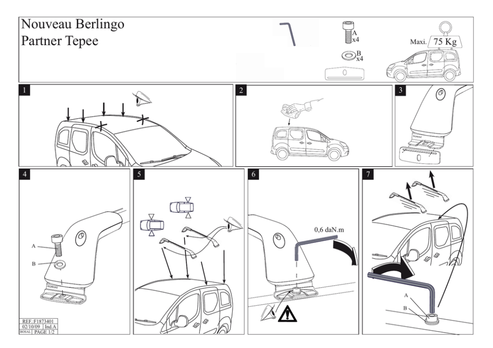 Nouveau Berlingo Partner Tepee A x4 608 101 &%56%24 : )D ELA0LAINEDELgAIN 3!).465,"!3 .²VERT B x4 VERTAVANT VERDEADELANTE ZIELONYPRZOD !6!.4$2/)4 !.4%2)/2%$%342! 02 /$02!7!342/.! !6!.4'!5#(% !.4%2)/2%3).)342! 02 /$,%7!342/.! !22)%2%$2/)4 0/34%2)/2%$%342! 49,02!7!342/.! 1 !22)%2%'!5#(% 0/34%2)/2%3).)342! 49,,%7!342/.! Maxi. BLEUARRI RE AZULATRAS NIEBIESKI TYL ERT &EUV ERT &EUV 3 2 8 4 5 6 7 0,6 daN.m A B 8 8 A B REF.:F1873401 Réf.:F1883401 02/10/09 02/10/09ind.A Ind.A 1/21/2 BOSAL PAGE BOSAL PAGE 75 Kg Français Sécurité - Prière de bien lire l’instruction de montage avant de commencer. - Veuillez vérifier que tous les articles sont inclus dans la boite. - Suivez l’ordre de numérotation 1,2,3 etc… - Ces barres de toit ne conviennent qu’au véhicule spécifié au recto de cette notice. - Fixer de façon sûre et correcte la charge. - Il est recommandé d’utiliser les accessoires adaptés au transport de la charge considérée (porte-vélo, porte-ski, etc…) - Faire attention à ne pas abîmer les barres de toit (chocs, etc…) et de veiller à un bon entretien des barres. - Nettoyer et sécher les surfaces en contact avec le véhicule avant montage. - Ces barres ont été conçues pour être placées à un endroit précis du véhicule. - La fixation sur le véhicule n’est plus garantie si le positionnement est différent de celui indiqué sur cette notice. - Les dispositifs de fixation doivent être serrés correctement et vérifiés régulièrement au cours des trajets. - L’arrimage des bagages avec des liens élastiques (sandow, tendeurs, etc...) est interdit; sangles conseillées. - Les pattes métalliques de fixation ont reçu un traitement spécial anti-agression de la peinture de votre véhicule ; ce traitement a fait l’objet de recherches approfondies. - N’intercaler aucune garniture supplémentaire (caoutchouc, plastique ou autre) entre la patte de fixation et la carrosserie, la bonne tenue des barres ne serait plus assurée. - Respecter la charge maximum admissible par le véhicule préconisée au recto. - La hauteur de la charge ne doit pas dépasser celle préconisée par le constructeur dans le manuel d’utilisation. - Planches à voile et charges longues: réduire la vitesse, 90 km/heure conseillé. - Pour économie d’énergie, les barres seront enlevées si elles ne sont pas utilisées. - Toute charge transportée sur le pavillon d’un véhicule affecte de manière sensible son comportement en particulier la sensibilité au vent latéral et le comportement en virage et au freinage. Il est conseillé de conduire avec plus de prudence (réduire la vitesse, tenir compte de l’augmentation des distances de freinage) - Important : Suivre correctement les instructions de montage et d’utilisation. Le non respect de cette notice d’utilisation dégage la responsabilité du constructeur. OK NO ESPAÑOL SEGURIDAD - Leer atentamente las instrucciones de montaje antes de comenzar. - Verificar que todos los artículos se encuentran en la caja. - Seguir el orden de numeración 1, 2, 3, etc. - Estas barras de techo sólo sirven para el vehículo especificado en el anverso de estas instrucciones. - Fijar la carga adecuadamente y de forma segura. - Se recomienda utilizar accesorios adaptados al transporte de la carga en cuestión (portabicicletas, portaesquís, etc.) - Prestar atención para no deteriorar las barras de techo (golpes, etc.) y realizar correctamente su mantenimiento. - Antes del montaje, limpiar y secar las superficies en contacto con el vehículo. - Estas barras han sido diseñadas para ser montadas en un lugar preciso del vehículo. - La fijación en el vehículo no está garantizada si la posición es diferente de la indicada en estas instrucciones. - Es imprescindible apretar correctamente los dispositivos de fijación y comprobarlos periódicamente durante el trayecto. - Se prohíbe sujetar el equipaje con elásticos (pulpos, tensores, etc.); se aconseja utilizar correas. - Las patillas metálicas de fijación han recibido un tratamiento especial antiagresión de la pintura de su vehículo; este tratamiento ha sido objeto de minuciosas investigaciones. - No intercalar ninguna guarnición suplementaria (caucho, plástico u otros) entre la patilla de fijación y la carrocería ya que, de lo contrario, no se garantizaría la correcta sujeción de las barras. - Respecte la carga máxima admitida por el vehículo que se indica en el anverso. - La altura de la carga no debe sobrepasar la recomendada por el fabricante en el manual de utilización. - Tablas de vela y cargas largas: reducir la velocidad; se recomienda circular a 90 km/h. - Para ahorrar energía, desmontar las barras si no se utilizan. - Todas las cargas que se transporten en el techo de un vehículo afectan de manera importante en su comportamiento, en especial en la sensibilidad al viento lateral y en el comportamiento en los giros y en la frenada. Se aconseja conducir con mayor prudencia (reducir la velocidad y tener en cuenta el aumento de la distancia para frenar) - Importante: Seguir correctamente las instrucciones de montaje y utilización. El incumplimiento de estas instrucciones de utilización exime de responsabilidad al Fabricante. POLSKI BEZPIECZEŃSTWO - Przed przystąpieniem do pracy należy dokładnie przeczytać instrukcję montażu. - Prosimy o sprawdzenie, czy wszystkie elementy znajdują się w opakowaniu. - Należy sprawdzić je zgodnie z kolejnymi numerami 1, 2, 3 itd. - Listwy dachowe przeznaczone są jedynie do samochodów wymienionych na odwrocie niniejszej instrukcji. - Należy zawsze zamocować ładunek w sposób prawidłowy i pewny. - Zalecane jest korzystanie z akcesoriów odpowiednich dla przewożonego ładunku (bagażnik na rowery, bagażnik na narty itd.). - Należy uważać, aby nie uszkodzić listew dachowych (poprzez uderzenie itd.) oraz zwracać uwagę na ich prawidłowe utrzymanie i konserwację. - Przed przystąpieniem do montażu należy wyczyś