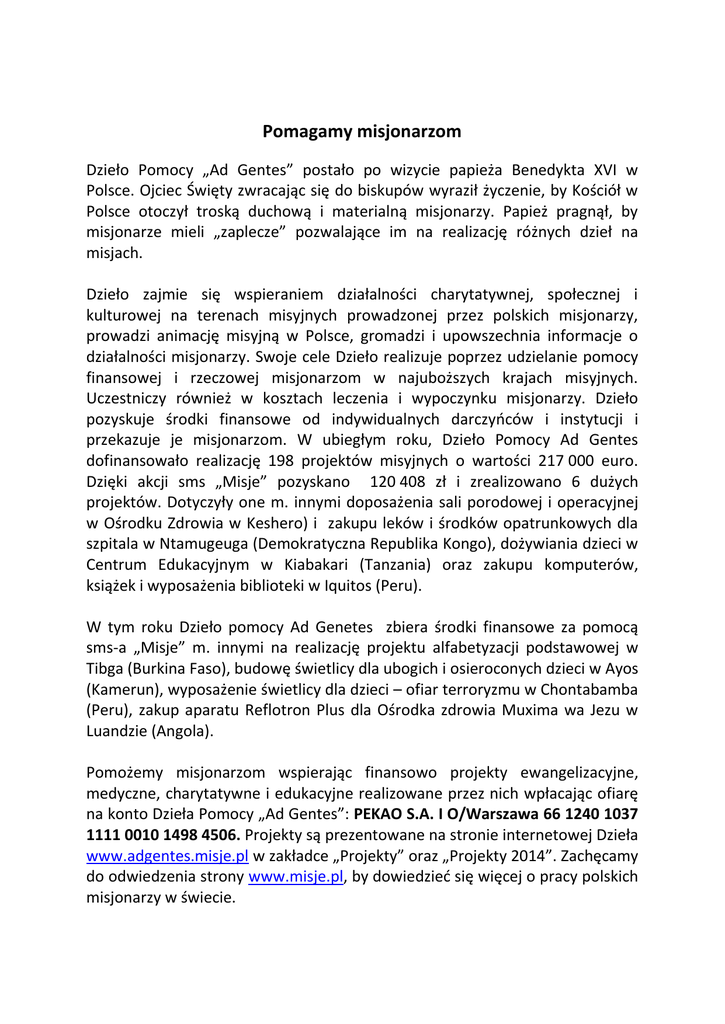 Pomagamy misjonarzom Dzieło Pomocy „Ad Gentes” postało po wizycie papieża Benedykta XVI w Polsce. Ojciec Święty zwracając się do biskupów wyraził życzenie, by Kościół w Polsce otoczył troską duchową i materialną misjonarzy. Papież pragnął, by misjonarze mieli „zaplecze” pozwalające im na realizację różnych dzieł na misjach. Dzieło zajmie się wspieraniem działalności charytatywnej, społecznej i kulturowej na terenach misyjnych prowadzonej przez polskich misjonarzy, prowadzi animację misyjną w Polsce, gromadzi i upowszechnia informacje o działalności misjonarzy. Swoje cele Dzieło realizuje poprzez udzielanie pomocy finansowej i rzeczowej misjonarzom w najuboższych krajach misyjnych. Uczestniczy również w kosztach leczenia i wypoczynku misjonarzy. Dzieło pozyskuje środki finansowe od indywidualnych darczyńców i instytucji i przekazuje je misjonarzom. W ubiegłym roku, Dzieło Pomocy Ad Gentes dofinansowało realizację 198 projektów misyjnych o wartości 217 000 euro. Dzięki akcji sms „Misje” pozyskano 120 408 zł i zrealizowano 6 dużych projektów. Dotyczyły one m. innymi doposażenia sali porodowej i operacyjnej w Ośrodku Zdrowia w Keshero) i zakupu leków i środków opatrunkowych dla szpitala w Ntamugeuga (Demokratyczna Republika Kongo), dożywiania dzieci w Centrum Edukacyjnym w Kiabakari (Tanzania) oraz zakupu komputerów, książek i wyposażenia biblioteki w Iquitos (Peru). W tym roku Dzieło pomocy Ad Genetes zbiera środki finansowe za pomocą sms-a „Misje” m. innymi na realizację projektu alfabetyzacji podstawowej w Tibga (Burkina Faso), budowę świetlicy dla ubogich i osieroconych dzieci w Ayos (Kamerun), wyposażenie świetlicy dla dzieci – ofiar terroryzmu w Chontabamba (Peru), zakup aparatu Reflotron Plus dla Ośrodka zdrowia Muxima wa Jezu w Luandzie (Angola). Pomożemy misjonarzom wspierając finansowo projekty ewangelizacyjne, medyczne, charytatywne i edukacyjne realizowane przez nich wpłacając ofiarę na konto Dzieła Pomocy „Ad Gentes”: PEKAO S.A. I O/Warszawa 66 1240 1037 1111 0010 1498 4506. Projekty są prezentowane na stronie internetowej Dzieła www.adgentes.misje.pl w zakładce „Projekty” oraz „Projekty 2014”. Zachęcamy do odwiedzenia strony www.misje.pl, by dowiedzieć się więcej o pracy polskich misjonarzy w świecie.