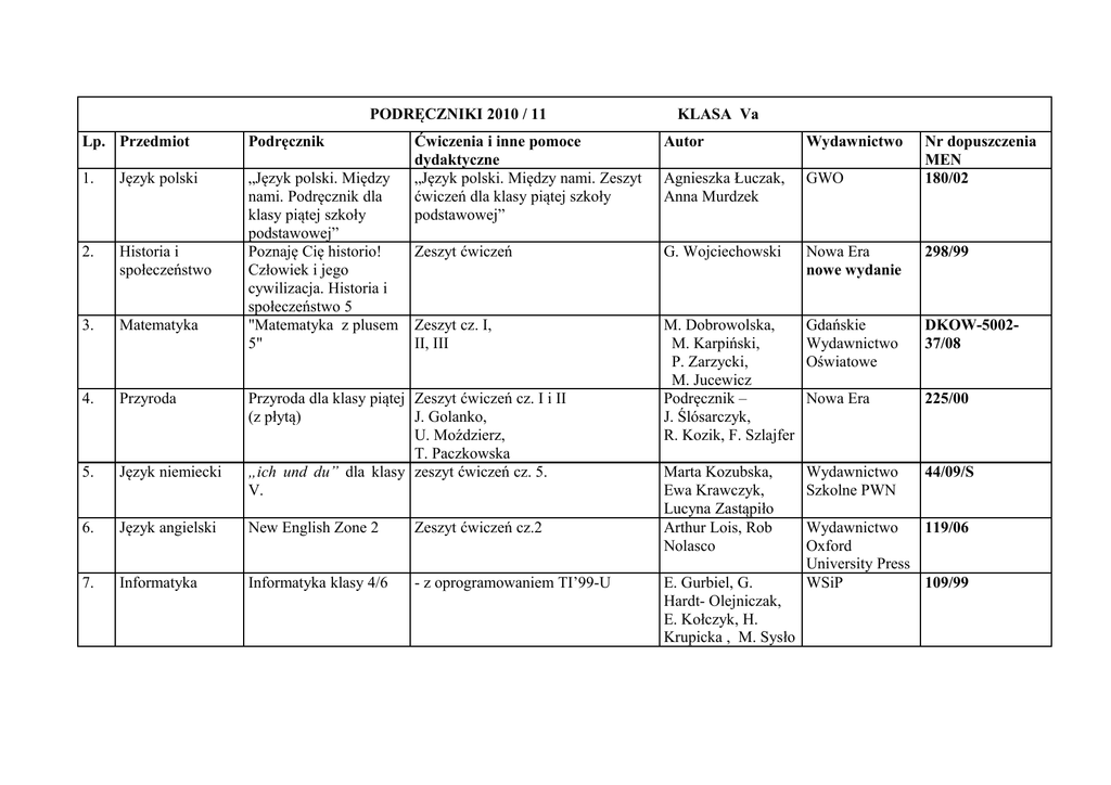 PODRĘCZNIKI 2010 / 11 KLASA Va Lp. Przedmiot Podręcznik
