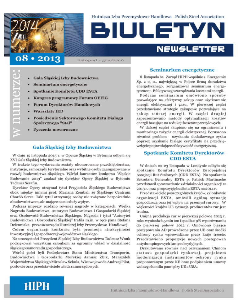 Hutnicza Izba Przemys³owo-Handlowa Polish Steel Association w numerze: 08 • 2013 listopad - grudzieñ Seminarium energetyczne · Gala Œl¹skiej Izby Budownictwa · Seminarium energetyczne · Spotkanie Komitetu CDD ESTA · Kongres programowy Forum OEEiG · Forum Dyrektorów Handlowych · Warsztaty IED · Posiedzenie Sektorowego Komitetu Dialogu Spo³ecznego "Stal" · ¯yczenia noworoczne Gala Œl¹skiej Izby Budownictwa W dniu 15 listopada 2013 r. w Operze Œl¹skiej w Bytomiu odby³a siê XVI Gala Œl¹skiej Izby Budownictwa. W trakcie tego wydarzenia zosta³y uhonorowane przedsiêbiorstwa, instytucje, samorz¹dy terytorialne oraz wybitne osoby zaanga¿owane w rozwój budownictwa œl¹skiego. Wœród laureatów konkursu "Œl¹skie Budowanie 2013" znalaz³ siê dyrektor Opery Œl¹skiej w Bytomiu Tadeusz Serafin. Dyrektor Opery otrzyma³ tytu³ Przyjaciela Œl¹skiego Budownictwa obok miêdzy innymi prof. Mariana Zembali ze Œl¹skiego Centrum Chorób Serca. Taki tytu³ otrzymuj¹ osoby nie zwi¹zane bezpoœrednio z budownictwem, ale maj¹ce na nie du¿y wp³yw. Podczas imprezy rozdano równie¿ nagrody w kategoriach: Wielka Nagroda Budownictwa, Autorytet Budownictwa i Gospodarki Œl¹skiej oraz Osobowoœæ Budownictwa Œl¹skiego. Nagroda i tytu³ "Autorytet Budownictwa i Gospodarki Œl¹skiej" trafi³a m.in. w rêce pana Stefana Dzienniaka - prezesa zarz¹du Hutniczej Izby Przemys³owo-Handlowej. Celem organizacji konkursu by³a promocja atrakcyjnoœci inwestycyjnej i gospodarczej województwa œl¹skiego. Na uroczystoœci Prezydent Œl¹skiej Izby Budownictwa Tadeusz Wnuk podziêkowa³ wszystkim cz³onkom za ogromny wk³ad w dzia³alnoœæ œl¹skiego samorz¹du gospodarczego. Wœród goœci byli Podsekretarz Stanu Ministerstwa Transportu, Budownictwa i Gospodarki Morskiej Janusz ¯bik, Marsza³ek Województwa Œl¹skiego Miros³aw Seku³a, Wicewojewoda Andrzej Pilot, pos³owie oraz przedstawiciele w³adz samorz¹dowych. 8 listopada br. Zarz¹d HIPH wspólnie z Energomix Sp. z o. o., najwiêksz¹ w Polsce firm¹ doradztwa energetycznego, zorganizowa³ seminarium energetyczne nt. Efektywnego zarz¹dzania kosztami energii. Podczas seminarium omówiono sposoby pozwalaj¹ce na efektywny zakup oraz u¿ytkowanie energii elektrycznej i gazu. W pierwszej czêœci przedstawiono strategie zakupowe pozwalaj¹ce na zakup tañszej energii. W czêœci drugiej zaprezentowano metody optymalizacji kosztów energii bazuj¹ce na redukcji kosztów przesy³owych. W dalszej czêœci skupiono siê na ograniczeniu i monitoringu zu¿ycia energii elektrycznej. Poruszono równie¿ problem uzyskania dodatkowego zysku poprzez uzyskanie bia³ego certyfikatu na przedsiêwziêcie poprawiaj¹ce efektywnoœæ energetyczn¹. Spotkanie Komitetu Dyrektorów CDD ESTA W dniach 22-23 listopada w Londynie odby³o siê spotkanie Komitetu Dyrektorów Europejskiej Asocjacji Rur Stalowych (CDD ESTA) Na spotkaniu Sekretarz Generalny ESTA p. Patrick Martinache przedstawi³ sprawozdanie z dzia³alnoœci organizacji w 2013 r. oraz propozycjê bud¿etu ESTA na 2014 r. Przedstawiciele poszczególnych krajów, cz³onkowie organizacji ESTA, omówili ogóln¹ sytuacjê gospodarcz¹ oraz jej wp³yw na przemys³ rurowy. W wiêkszoœci krajów UE sytuacja producentów rur jest trudna. Unijna produkcja rur w pierwszej po³owie 2013 r. roku wynios³a 6,5 mln ton i spad³a o 9% w porównaniu do pierwszej po³owy 2012 r. Omówiono bie¿¹ce postêpowania AD prowadzone przez UE oraz œrodki ochrony rynku wprowadzane przez kraje trzecie. Przedstawiono propozycje nowych postêpowañ antydumpingowych i antysubsydyjnych. Dyskutowano równie¿ nad przyznaniem Chinom statusu gospodarki rynkowej, projektem modernizacji instrumentów ochrony rynku proponowanym przez KE oraz podpisaniem umowy wolnego handlu pomiêdzy UE a USA . Hutnicza Izba Przemys³owo-Handlowa Polish Steel Association www.hiph.org Kongres Forum Odbiorców Energii Elektrycznej i Gazu i Forum CO2 W dniach 26-27 listopada br. w £odzi odby³ siê VI Kongres programowo-organizacyjny FOEEiG i Forum CO2. W trakcie obrad Kongresu zosta³y omówione sprawozdania z dzia³alnoœci FOEEiG oraz FORUM CO2, w tym m.in.bud¿et obu forów. Kancelarie: El¿anowski Cherka i Wspólnicy oraz Viewpoint Group zda³y sprawozdanie z najwa¿niejszych dzia³añ podejmowanyh w ramach wspó³pracy z FOEEiG. W dalszej czêœci spotkania zosta³y wybrane nowe w³adze oraz wypracowano stanowiska w sprawach dotycz¹cych: · potencjalnych zagro¿eñ dla funkcjonowania energoch³onnych sektorów przemys³u w zwi¹zku z planowan¹ nowelizacj¹ Dyrektywy ETS, · zagro¿enia sektorów energoch³onnych zjawiskiem carbon leakage, · unijnej polityki klimatycznej w zakresie deklaracji progresywnego zaostrzania celów redukcji CO2 do 2050r., · kierunków ewolucji unijnej polityki w zakresie promowania efektywnoœci energetycznej, · oczekiwañ zwi¹zanych z negocjacjami podczas œwiatowego szczytu klimatycznego COP19 w Warszawie, · potencjalnego wp³ywu skutków modyfikacji przepisów Dyrektywy IED na funkcjonowanie przemys³u krajowego. Forum Dyrektorów Handlowych W dniach 5-6 grudnia 2013 r. Ustroniu odby³o siê kolejne Forum Dyrektorów Handlowych. Izba przedstawi³a informacjê o sytuacji na rynku stali, koksu i materia³ów ogniotrwa³ych. Omówiono stan postêpowañ ochronnych w handlu stal¹ i surowcami oraz aktualne dzia³ania przeciwko nieuczciwemu procederowi wy ³udzania VAT w wewn¹trzunijnym obrocie wyrobów stalowych. Przedstawiciele firm cz³onkowskich Izby przedstawili ocenê aktualnej sytuacji na rynku stali oraz prognozê na I kw. 2014 r. Z wypowiedzi tych wynika, ¿e nale¿y oczekiwaæ w najbli¿szych miesi¹cach stopniowej poprawy sytuacji na rynku wyrobów stalowych. Pan Marcin Wiœniewski) omówili g³ówne zagadnienia Dyrektywy IED oraz jej transpozycjê do prawa polskiego. W Polsce Dyrektywa IED jest transponowana poprzez Projekt ustawy o zmianie ustawy Prawo Ochrony Œrodowiska oraz niektóryc