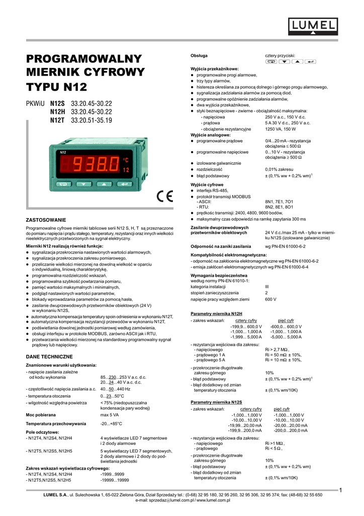 PROGRAMOWALNY MIERNIK CYFROWY TYPU N12 PKWiU N12S 33.20.45-30.22 N12H 33.20.45-30.22 N12T 33.20.51-35.19 Obs³uga cztery przyciski: Wyjcia przekanikowe: l programowalne progi alarmowe, l trzy typy alarmów, l histereza okrelana za pomoc¹ dolnego i górnego progu alarmowego, l sygnalizacja zadzia³ania alarmów za pomoc¹ diod, l programowalne opónienie zadzia³ania alarmów, l dwa wyjcia przekanikowe, l styki beznapiêciowe - zwierne - obci¹¿alnoæ maksymalna: - napiêciowa 250 V a.c., 150 V d.c. - pr¹dowa 5 A 30 V d.c., 250 V a.c. - obci¹¿enie rezystancyjne 1250 VA, 150 W Wyjcie analogowe: l programowalne pr¹dowe 0/4...20 mA - rezystancja obci¹¿enia £ 500 W l programowalne napiêciowe 0...10 V - rezystancja obci¹¿enia ³ 500 W l izolowane galwanicznie l rozdzielczoæ 0,01% zakresu ± (0,1% ww + 0,2% wm)1 l b³¹d podstawowy Wyjcie cyfrowe l interfejs RS-485, l protokó³ transmisji MODBUS - ASCII: 8N1, 7E1, 7O1 - RTU: 8N2, 8E1, 8O1 l prêdkoc transmisji: 2400, 4800, 9600 bodów, l maksymalny czas odpowiedzi na ramkê zapytania 300 ms ZASTOSOWANIE Programowalne cyfrowe mierniki tablicowe serii N12 S, H, T s¹ przeznaczone do pomiaru napiêcia i pr¹du sta³ego, temperatury, rezystancji oraz innych wielkoci nieelektrycznych przetworzonych na sygna³ elektryczny. Zasilanie dwuprzewodowych przetworników obiektowych Mierniki N12 realizuj¹ równie¿ funkcje: l sygnalizacja przekroczenia nastawionych wartoci alarmowych, l sygnalizacja przekroczenia zakresu pomiarowego, l przeliczanie wielkoci mierzonej na dowoln¹ wielkoæ w oparciu o indywidualn¹, liniow¹ charakterystykê, l programowalna rozdzielczoæ wskazañ, l programowalna szybkoæ powtarzania pomiaru, l pamiêæ wartoci maksymalnych i minimalnych, l podgl¹d nastawionych wartoci parametrów, l blokady wprowadzania parametrów za pomoc¹ has³a, l zasilanie dwuprzewodowych przetworników obiektowych (24 V) w wykonaniu N12S, l automatyczna kompensacja temperatury spoin odniesienia w wykonaniu N12T, l automatyczna kompensacja rezystancji przewodów w wykonaniu N12T, l podwietlania dowolnej jednostki pomiarowej wed³ug zamówienia, l obs³ugi interfejsu w protokole MODBUS, zarówno ASCII jak i RTU, l przetwarzania wielkoci mierzonej na standardowy programowalny sygna³ pr¹dowy lub napiêciowy. Odpornoæ na zaniki zasilania DANE TECHNICZNE Znamionowe warunki u¿ytkowania: - napiêcie zasilania zale¿ne od kodu wykonania 85...230...253 V a.c. d.c. 20...24...40 V a.c. d.c. - czêstotliwoæ napiêcia zasilania a.c. 40...50...440 Hz - temperatura otoczenia 0...23...50°C - wilgotnoæ wzglêdna powietrza < 75% (niedopuszczalna kondensacja pary wodnej) Moc pobierana max 5 VA Temperatura przechowywania -20...+85°C Pole odczytowe: - N12T4, N12S4, N12H4 - N12T5, N12S5, N12H5 4 wywietlacze LED 7 segmentowe i 2 diody alarmowe 5 wywietlaczy LED 7 segmentowych, 2 diody alarmowe i 2 diody do podwietlania jednostki Zakres wskazañ wywietlacza cyfrowego: - N12T4, N12S4, N12H4 -1999...9999 - N12T5,N12S5, N12H5 -19999...19999 24 V d.c./max 25 mA - tylko w mierniku N12S (izolowane galwanicznie) wg PN-EN 61000-6-2 Kompatybilnoæ elektromagnetyczna: - odpornoæ na zak³ócenia elektromagnetyczne wg PN-EN 61000-6-2 - emisja zak³óceñ elektromagnetycznych wg PN-EN 61000-6-4 Wymagania bezpieczeñstwa wed³ug normy PN-EN 61010-1: kategoria instalacji stopieñ zanieczyszczenia III 2 napiêcie pracy wzglêdem ziemi 600 V Parametry miernika N12H - zakres wskazañ: cztery cyfry -199,9... 600,0 V -1,000... 1,000 A -1,999... 5,000 A - rezystancja wejciowa dla zakresu: - napiêciowego - pr¹dowego 1 A - pr¹dowego 5 A - przekroczenie d³ugotrwa³e zakresu górnego - b³¹d podstawowy - b³¹d dodatkowy od zmian temperatury otoczenia piêæ cyfr -600,0... 600,0 V -1,000... 1,000 A -5,000... 5,000 A Ri > 2,7 MW, Ri = 50 mW ± 10%, Ri = 10 mW ± 10%, 10% ± (0,1% ww + 0,2% wm)1 ± (0,1% wm/10K) Parametry miernika N12S - zakres wskazañ: cztery cyfry -1,000...1,000 V -10,00...10,00 V -19,99...20,00 mA -199,9...200,0 mA - rezystancja wejciowa dla zakresu: - napiêciowego - pr¹dowego - przekroczenie d³ugotrwa³e zakresu górnego - b³¹d podstawowy - b³¹d dodatkowy od zmian temperatury otoczenia piêæ cyfr -1,000...1,000 V -10,00...10,00 V -20,00...20,00 mA -200,0...200,0 mA Ri >1 MW, Ri < 5 W, 10% ± (0,1% ww + 0,2% wm) ± (0,1% wm/10K) LUMEL S.A., ul. Sulechowska 1, 65-022 Zielona Góra, Dzia³ Sprzeda¿y tel.: (0-68) 32 95 180, 32 95 260, 32 95 306, 32 95 374; fax: (48-68) 32 55 650 e-mail: [email protected] / www.lumel.com.pl 1 b) opis listwy zaciskowej miernika N12H - termoelementy (-100...+1200)°C ± (0,1% ww + 0,2% wm) K (NiCr-NiAl) (-100...+1370)°C ± (0,1% ww + 0,2% wm) N (NiCrSi-NiSi) (-100...+1300)°C ± (0,1% ww + 0,2% wm) E (NiCr-CuNi) (-100...+1000)°C ± (0,1% ww + 0,2% wm) R (PtRh13-Pt) (-50...+1760)°C ± (0,1% ww + 0,2% wm) S (PtRh10-Pt) (-50...+1760)°C ± (0,1% ww + 0,2% wm) Pomiar napiêcia (-10...70) mV ± (0,1% ww + 0,1% wm) A B + - + - 17 18 19 20 21 22 23 24 25 26 27 28 29 30 31 32 2 3 4 5 1A 5A Charakterystyki wg PN-92/M-53854 9 10 11 12 13 14 15 8 Alarm 2 J (Fe-CuNi ) 600 V B³¹d podstawowy GND Zakres pomiarowy GND Czujnik Wyjœcie analogowe napiêciowe Wyjœcie analogowe pr¹dowe RS-485 Alarm 1 Parametry miernika N12T L N Zasilanie Sygna³y wejœciowe - rezystory termometryczne: c) pod³¹czenie sygna³ów wejciowych w mierniku N11T - natê¿enie pr¹du p³yn¹cego przez rezystor termometryczny - rezystancja przewodów ³¹cz¹cych rezystor termometryczny z miernikiem 1 ± (0,1% ww + 0,2% wm) Pt500 (-199...+850)°C ± (0,1% ww + 0,2% wm) Pt1000 (-199...+850)°C ± (0,1% ww + 0,2% wm) Cu100 (-50...+180)°C ± (0,1% ww + 0,3% wm) Ni100 (-60...+180)°C ± (0,1% ww + 0,3% wm) Pomiar rezystancji (0... 400) W ± (0,1% ww + 0,1% wm) Pomiar rezystancji (0... 4000) W ± (0,1% ww + 0,2% wm) Charakterystyki wg PN-IEC 751-A1-A2 - b³êdy dodatkowe w znamionowych warunkach u¿ytkowania przy pomiarze temperatury: - kompensacji zmian tem