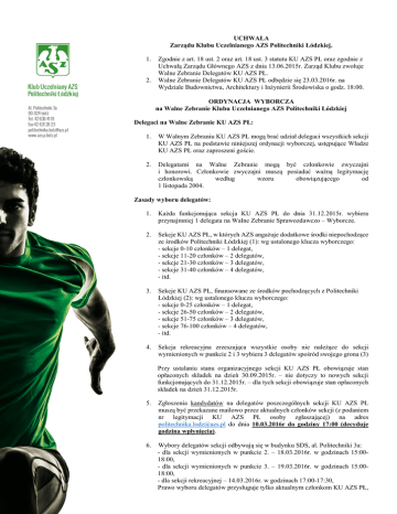 UCHWAŁA Zarządu Klubu Uczelnianego AZS Politechniki Łódzkiej. 1. 2. Zgodnie z art. 18 ust. 2 oraz art. 18 ust. 3 statutu KU AZS PŁ oraz zgodnie z Uchwałą Zarządu Głównego AZS z dnia 13.06.2015r. Zarząd Klubu zwołuje Walne Zebranie Delegatów KU AZS PŁ. Walne Zebranie Delegatów KU AZS PŁ odbędzie się 23.03.2016r. na Wydziale Budownictwa, Architektury i Inżynierii Środowiska o godz. 18:00. ORDYNACJA WYBORCZA na Walne Zebranie Klubu Uczelnianego AZS Politechniki Łódzkiej Delegaci na Walne Zebranie KU AZS PŁ: 1. W Walnym Zebraniu KU AZS PŁ mogą brać udział delegaci wszystkich sekcji KU AZS PŁ na podstawie niniejszej ordynacji wyborczej, ustępujące Władze KU AZS PŁ oraz zaproszeni goście. 2. Delegatami na Walne Zebranie mogą być członkowie zwyczajni i honorowi. Członkowie zwyczajni muszą posiadać ważną legitymację członkowską według wzoru obowiązującego od 1 listopada 2004. Zasady wyboru delegatów: 1. Każda funkcjonująca sekcja KU AZS PŁ do dnia 31.12.2015r. wybiera przynajmniej 1 delegata na Walne Zebranie Sprawozdawczo – Wyborcze. 2. Sekcje KU AZS PŁ, w których AZS angażuje dodatkowe środki niepochodzące ze środków Politechniki Łódzkiej (1): wg ustalonego klucza wyborczego: - sekcje 0-10 członków – 1 delegat, - sekcje 11-20 członków – 2 delegatów, - sekcje 21-30 członków – 3 delegatów, - sekcje 31-40 członków – 4 delegatów, - itd. 3. Sekcje KU AZS PŁ, finansowane ze środków pochodzących z Politechniki Łódzkiej (2): wg ustalonego klucza wyborczego: - sekcje 0-25 członków – 1 delegat, - sekcje 26-50 członków – 2 delegatów, - sekcje 51-75 członków – 3 delegatów, - sekcje 76-100 członków – 4 delegatów, - itd. 4. Sekcja rekreacyjna zrzeszająca wszystkie osoby nie należące do sekcji wymienionych w punkcie 2 i 3 wybiera 3 delegatów spośród swojego grona (3) Przy ustalaniu stanu organizacyjnego sekcji KU AZS PŁ obowiązuje stan opłaconych składek na dzień 30.09.2015r. – nie dotyczy to nowych sekcji funkcjonujących do 31.12.2015r. – dla tych sekcji obowiązuje stan opłaconych składek na dzień 31.12.2015r. 5. Zgłoszenia kandydatów na delegatów poszczególnych sekcji KU AZS PŁ muszą być przekazane mailowo przez aktualnych członków sekcji (z podaniem nr legitymacji KU AZS PŁ osoby zgłaszającej) na adres [email protected] do dnia 10.03.2016r do godziny 17:00 (decyduje godzina wpłynięcia). 6. Wybory delegatów sekcji odbywają się w budynku SDS, al. Politechniki 3a: - dla sekcji wymienionych w punkcie 2. – 18.03.2016r. w godzinach 15:0018:00, - dla sekcji wymienionych w punkcie 3. – 19.03.2016r. w godzinach 15:0018:00, - dla sekcji rekreacyjnej – 14.03.2016r. w godzinach 17:00-17:30, Prawo wyboru delegatów przysługuje tylko aktualnym członkom KU AZS PŁ, którzy stawią się osobiście z ważną legitymacją KU AZS PŁ wyrobioną do dnia 11.03.2016r. Wybory delegatów nadzoruje powołana w tym celu komisja wyborcza w osobach: Zofia Frątczak – przewodniczący, Gabriel Kabza oraz Patrycja Cyniak - członkowie, Zgłaszanie kandydatów do władz Klubu 1. Podczas Walnego Zebrania Delegatów KU AZS PŁ wybierani są: - Prezes Klubu - Zarząd Klubu - Komisja Rewizyjna - Sąd Koleżeński - Delegaci na Środowiskową Konferencję AZS Łódź - Delegaci na Zjazd AZS 2. Prawo zgłaszania kandydatów do Władz Klubu oraz kandydatów na delegatów na Konferencję Środowiskową AZS Łódź oraz Zjazd AZS przysługuje: - ustępującemu Zarządowi KU AZS PŁ, - wybranym delegatom sekcji. , 3. Pisemne zgłoszenie kandydatur musi wpłynąć do biura KU AZS PŁ do dnia 21.03.2016r. : 8-12, 15-18 z podaniem następujących danych: - imię i nazwisko kandydata, - sekcja zgłaszająca kandydata, - funkcja o którą kandydat się ubiega, - informacja dodatkowa (charakterystyka kandydata) wraz z opisanym doświadczeniem związanym z działalnością organizacyjną w KU AZS PŁ, 4. Do zgłoszeń należy dołączyć własnoręcznie podpisane oświadczenie o wyrażeniu zgody do kandydowania. Ordynacja wyborcza uaktualniona i przyjęta na posiedzeniu Zarządu KU AZS PŁ w dniu 02.03.2016r. Klucz wyborczy na Walne Zebranie Delegatów KU AZS PŁ Sekcja Ilość opłaconych składek Ilość mandatów (1) acroyoga (nowa sekcja 2015) akrobatyka sportowa (nowa sekcja 2015) surf team brydż fitness (nowa sekcja 2015) jeździectwo ju jitsu karate krav maga szachy squash taekwon-do taniec wspinaczka wspinaczka linowa (nowa sekcja 2015) 1 5 2 36 1 6 6 37 16 29 9 3 70 93 6 1 1 1 4 1 1 1 4 2 3 1 1 7 10 1 (2) aerobik badminton ergometr wioślarski futsal k judo k judo m kolarstwo koszykówka m koszykówka k lekka atletyka narciarstwo piłka nożna piłka ręczna k piłka ręczna m piłka siatkowa k piłka siatkowa m pływanie sambo snowboard tenis tenis stołowy trójbój siłowy żeglarstwo 17 24 14 21 19 27 8 20 24 73 16 74 17 23 27 32 36 5 15 14 27 30 10 1 1 1 1 1 2 1 1 1 3 1 3 1 1 2 2 2 1 1 1 2 2 1 (3) rekreacyjna 8 3 75 RAZEM